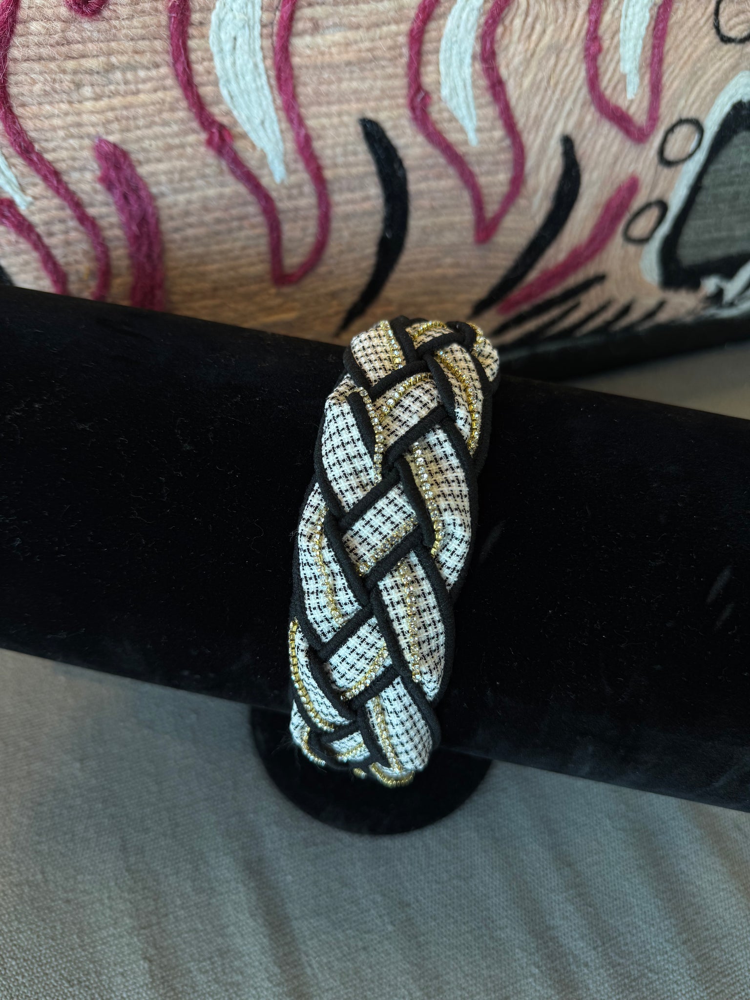 Elevate your look with this luxe braided headband, featuring textured tweed fabric, sparkling rhinestone accents, and a structured padded design. Whether in classic black, elegant ivory, or rich mocha, it’s the perfect statement piece for polished outfits and glam moments.