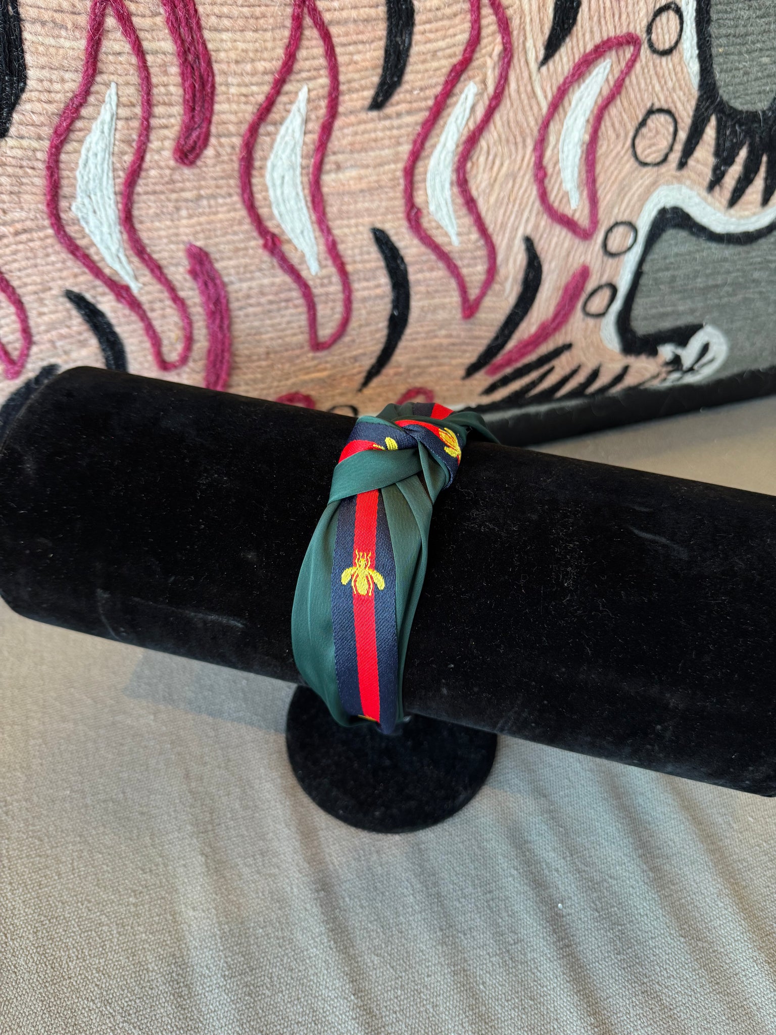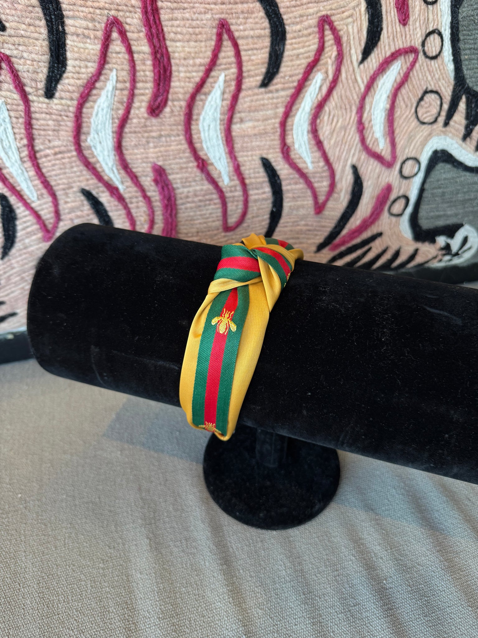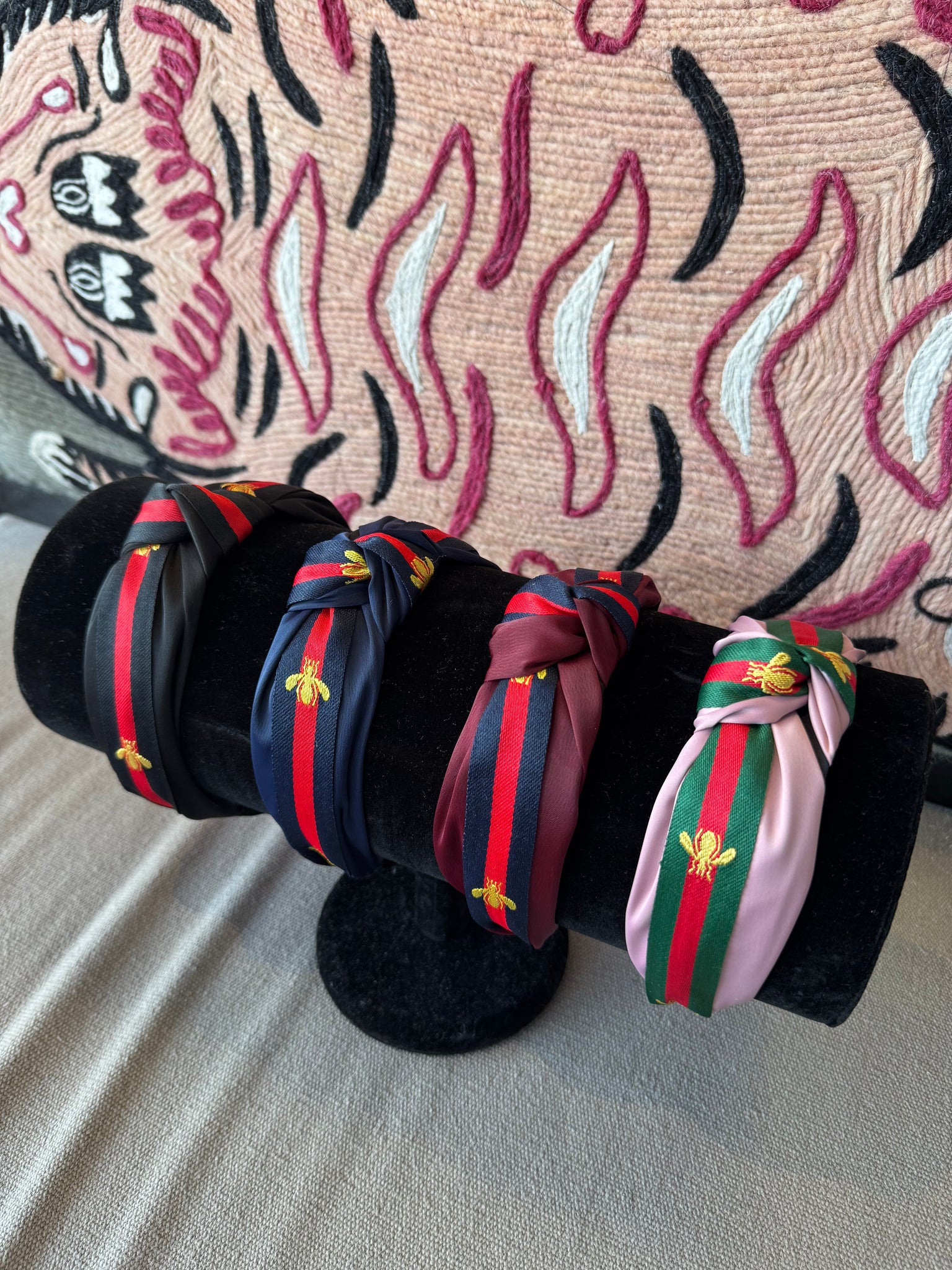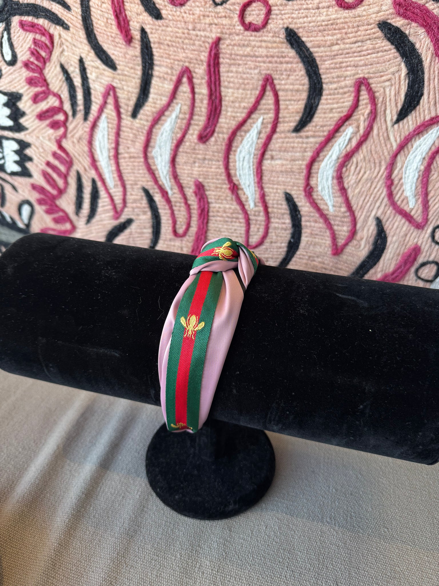 Elevate your everyday look with our Bee Knot Headband — the perfect blend of classic designer-inspired charm and feminine detail. Featuring a structured silhouette with a chic top knot, this headband is wrapped in a signature striped ribbon design and finished with an embroidered gold bee for a subtle statement touch.
