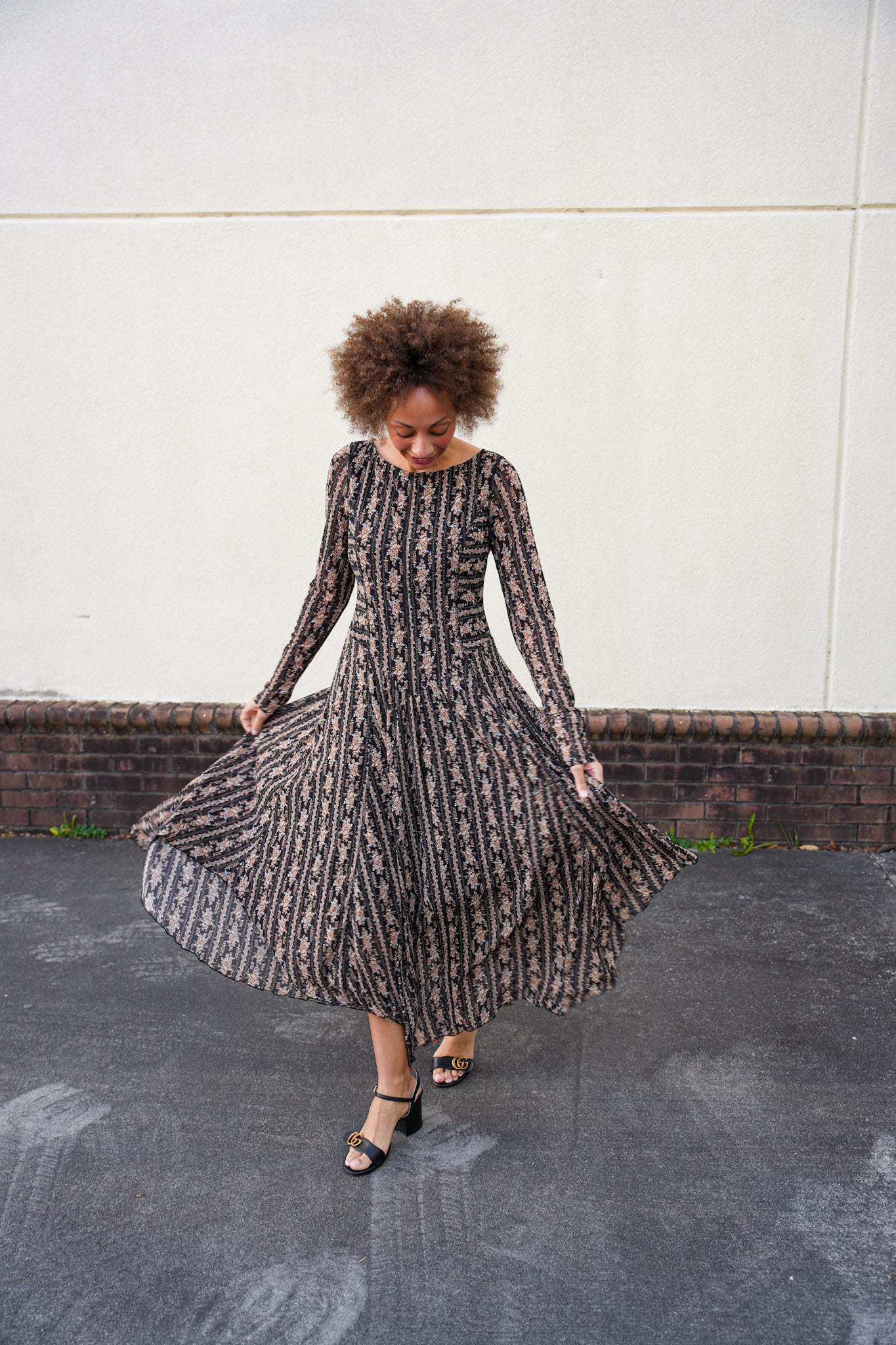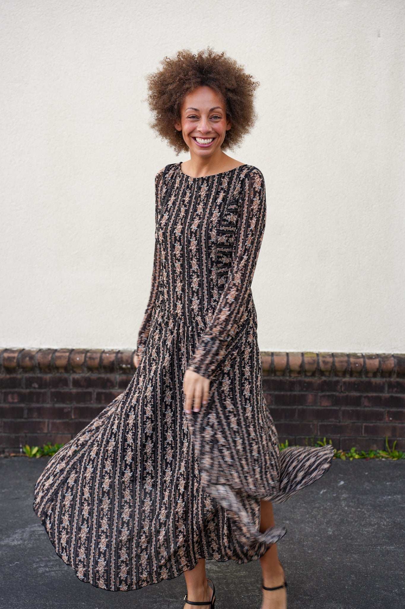 This romantic floral mesh midi dress features a flattering fitted bodice with mixed stripe and floral lace panels that create beautiful vertical lines. Designed with a soft boat neckline, long sheer sleeves, and a graceful drop waist that flows into a gently gathered skirt, it offers movement without bulk. The partial lining provides coverage while keeping the look light and airy.