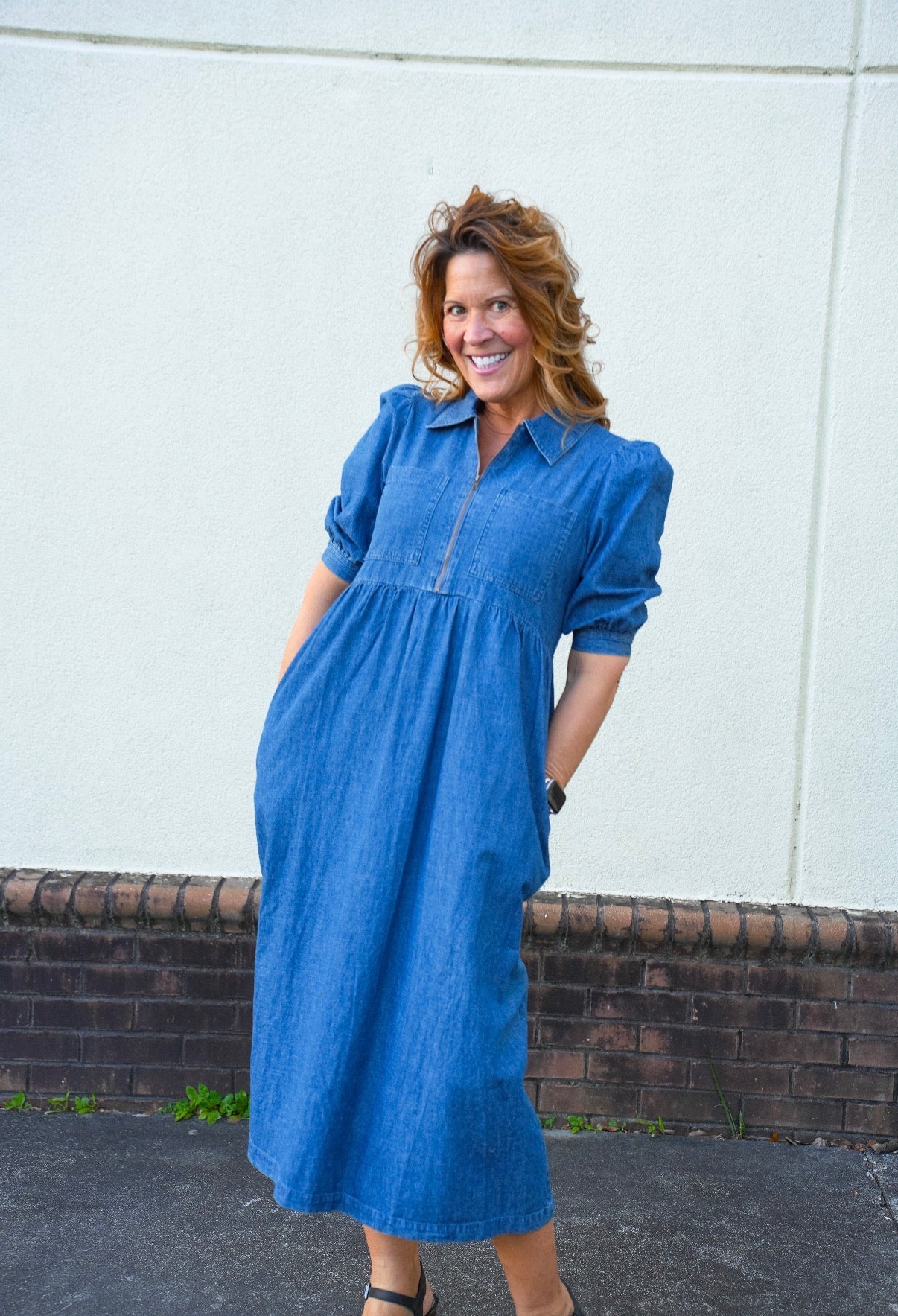 Meet your new favorite everyday denim. This lightweight denim midi features a flattering A-line silhouette with subtle gathers at the waist, puff sleeves, and a casual zip-front neckline. Designed with both a chest pocket and side pockets for that perfect blend of function and effortless style.