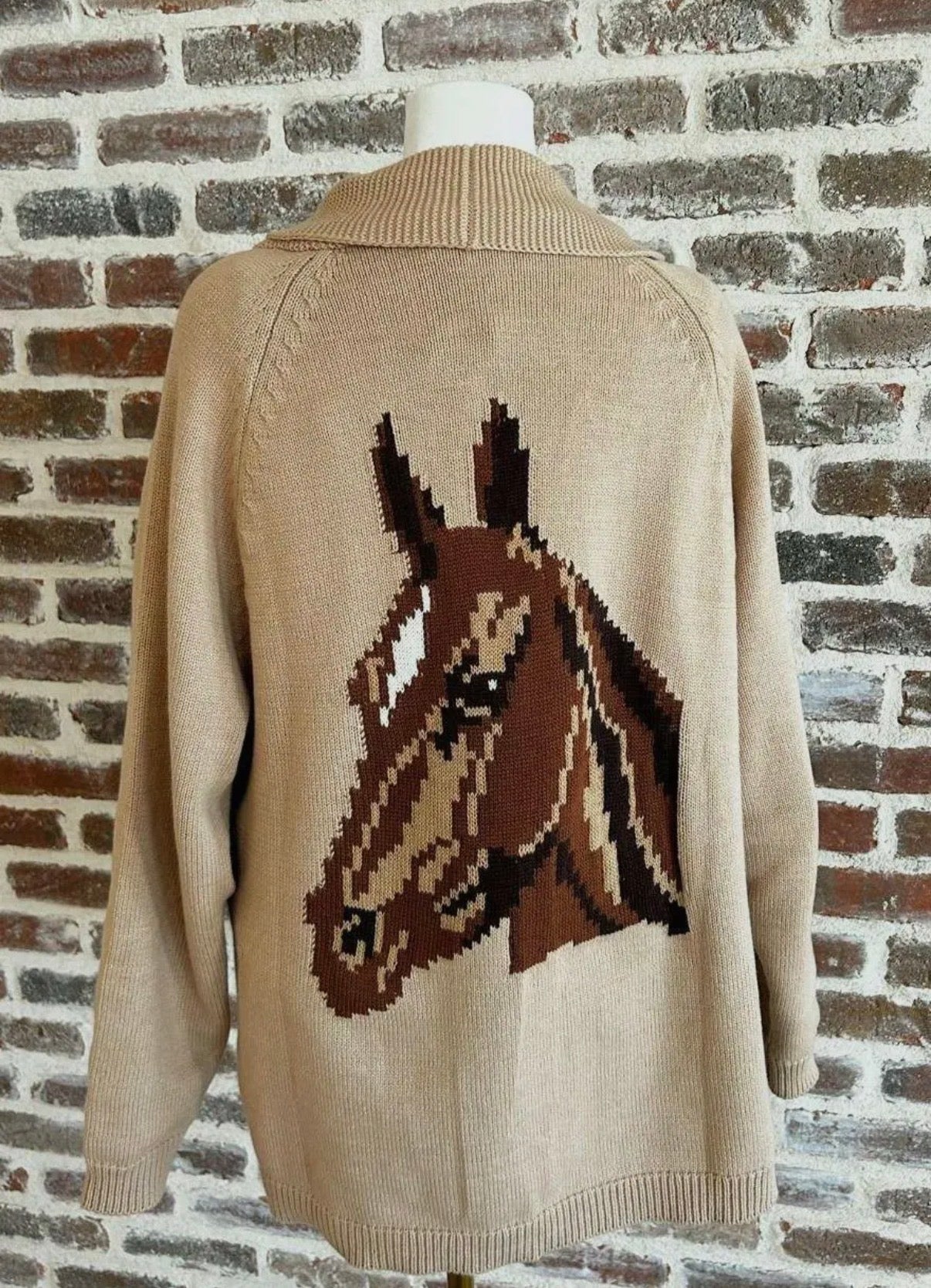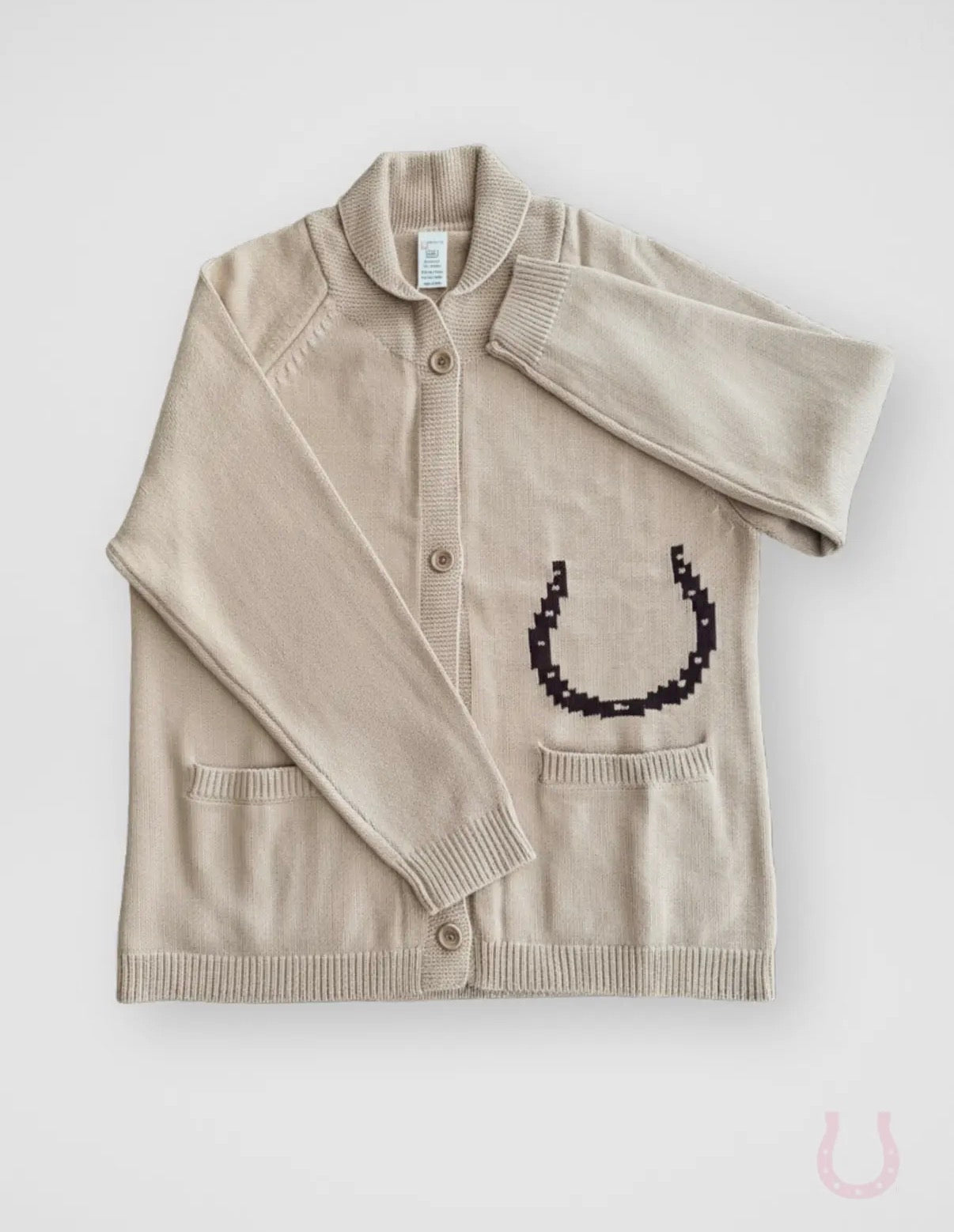 A cozy, oversized cardigan sweater featuring a statement jacquard horse design on the back and a subtle horseshoe detail on the front. Finished with wooden buttons and a relaxed, easy fit, this cardigan is soft, warm, and perfect for layering through the cooler seasons.