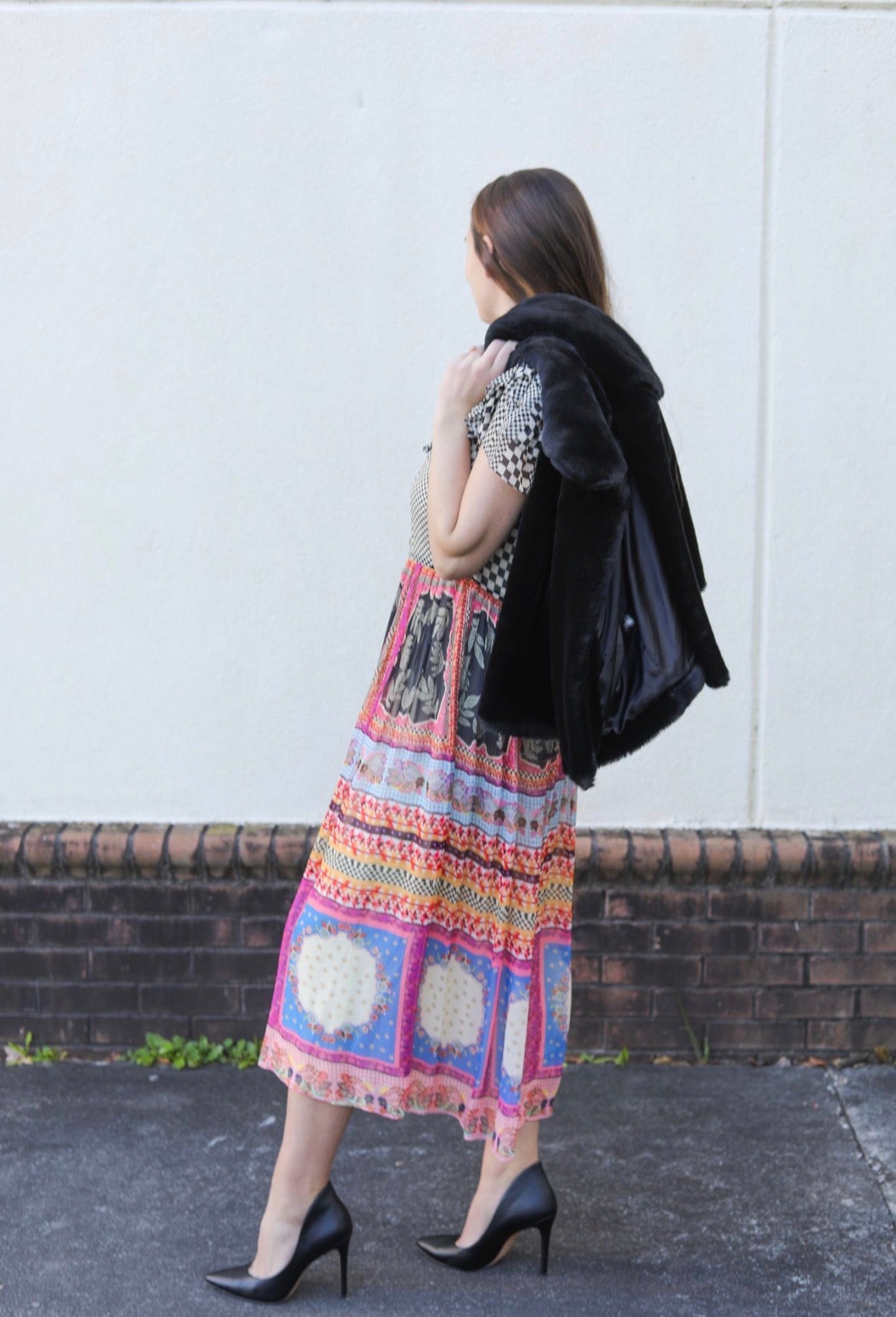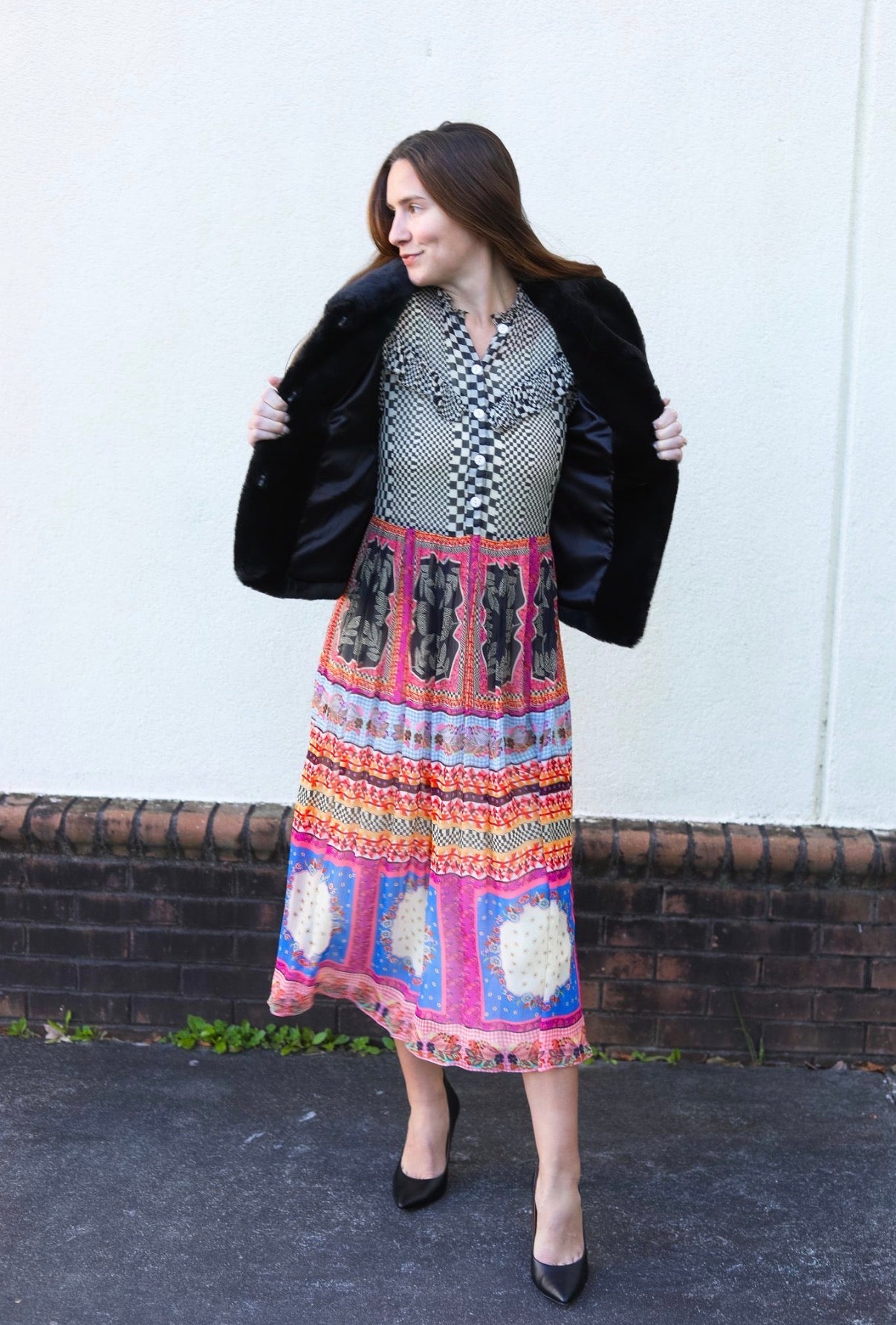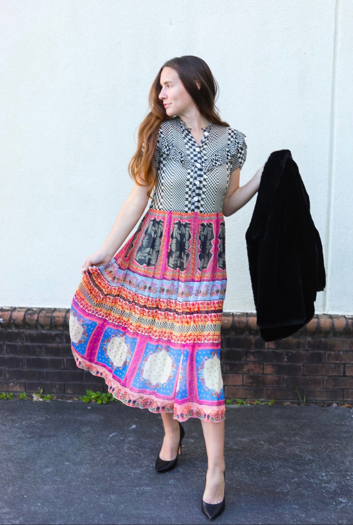 Vintage charm meets modern flair in the Lee Dress. With its black-and-beige checker print bodice, flutter sleeves, and colorful patchwork-style skirt, this cotton chiffon midi is effortlessly romantic. Finished with delicate ruffles and buttons, it’s a standout piece for those days that call for something truly unique.
