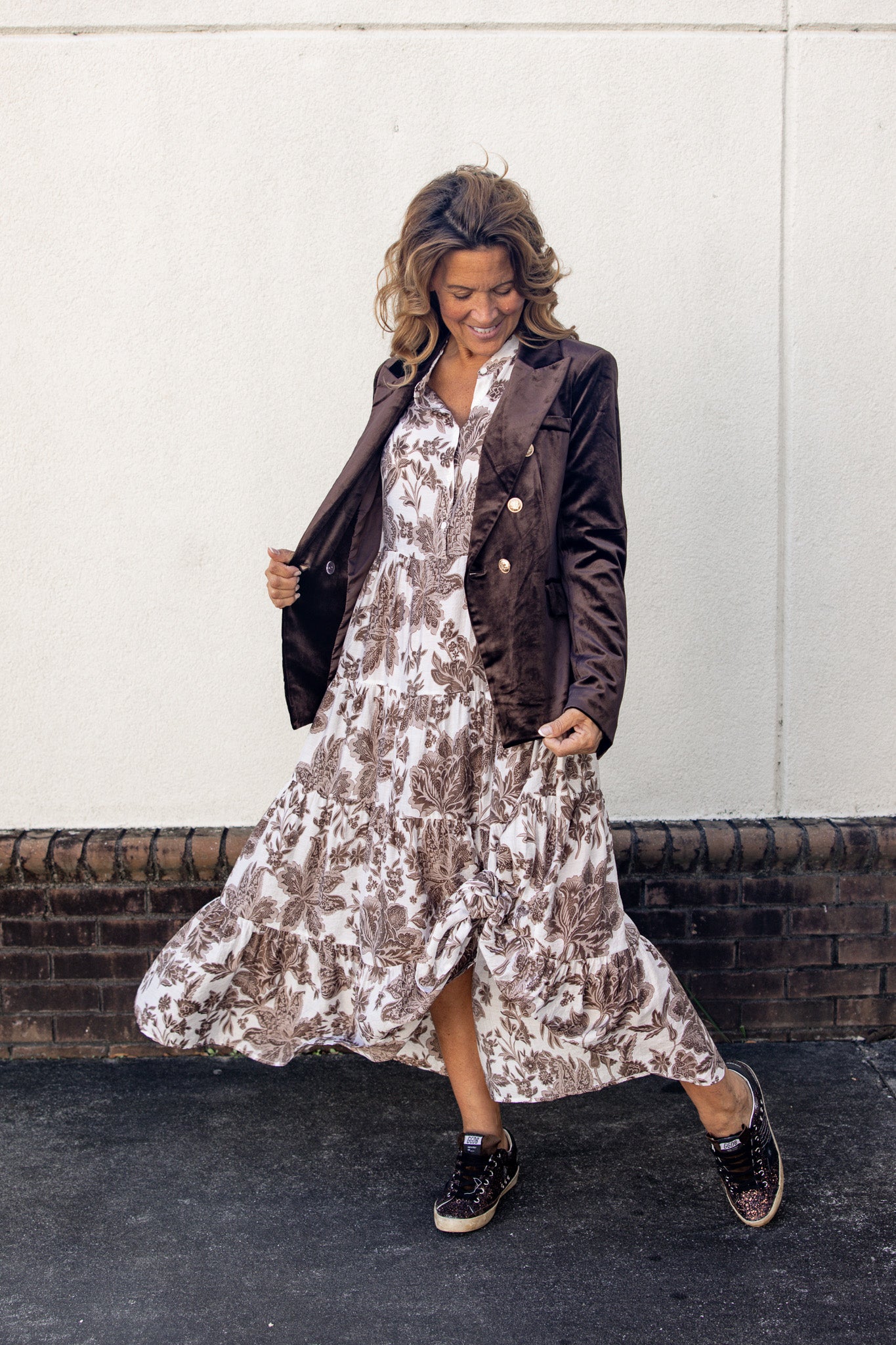 - Lightweight printed maxi dress with a button up bodice and full tiered skirt.