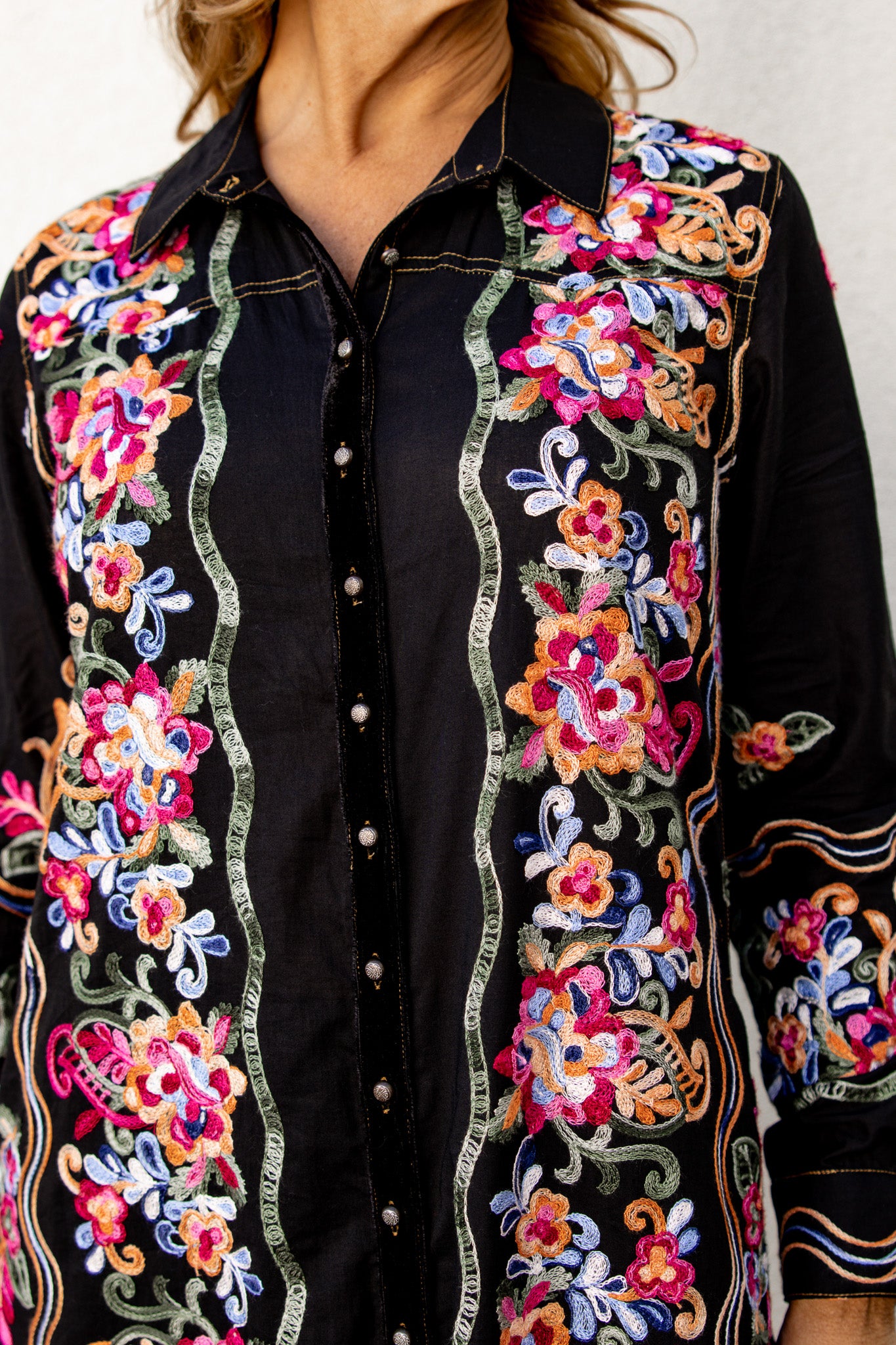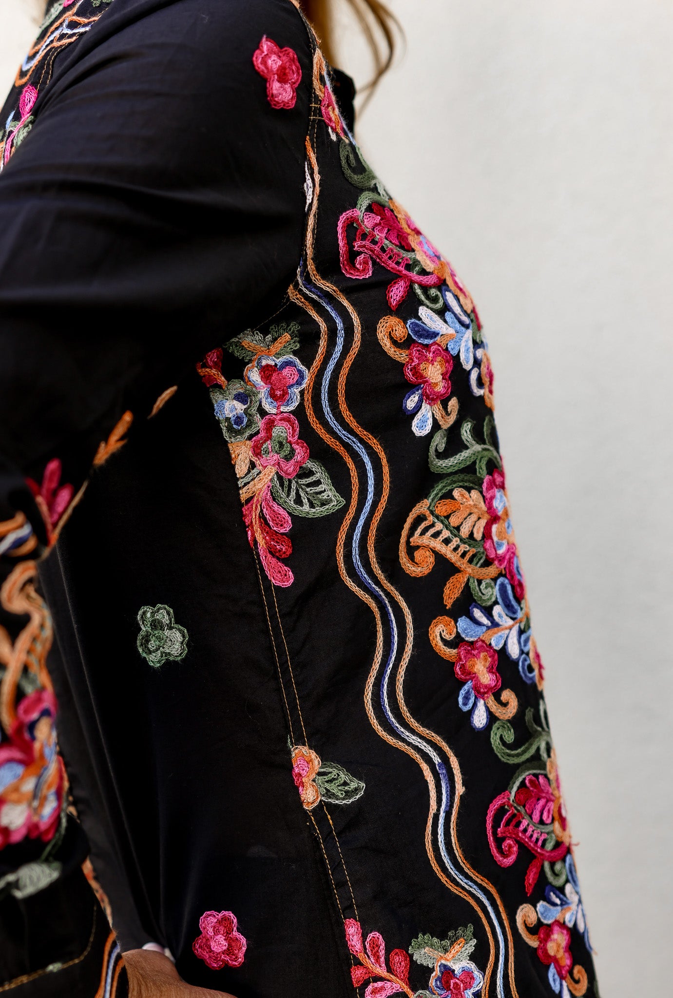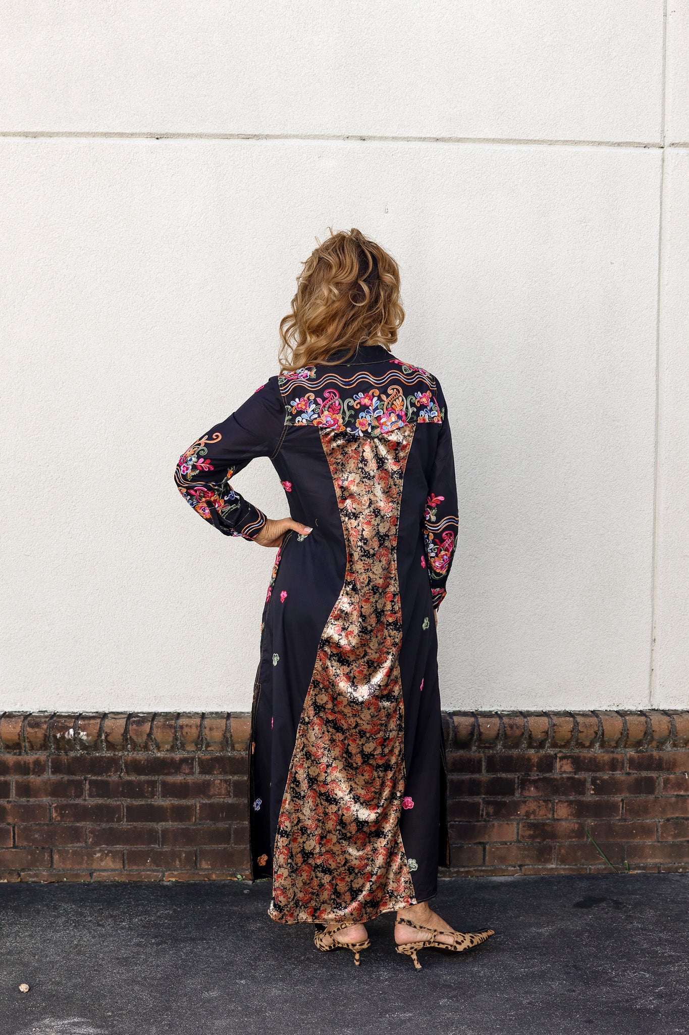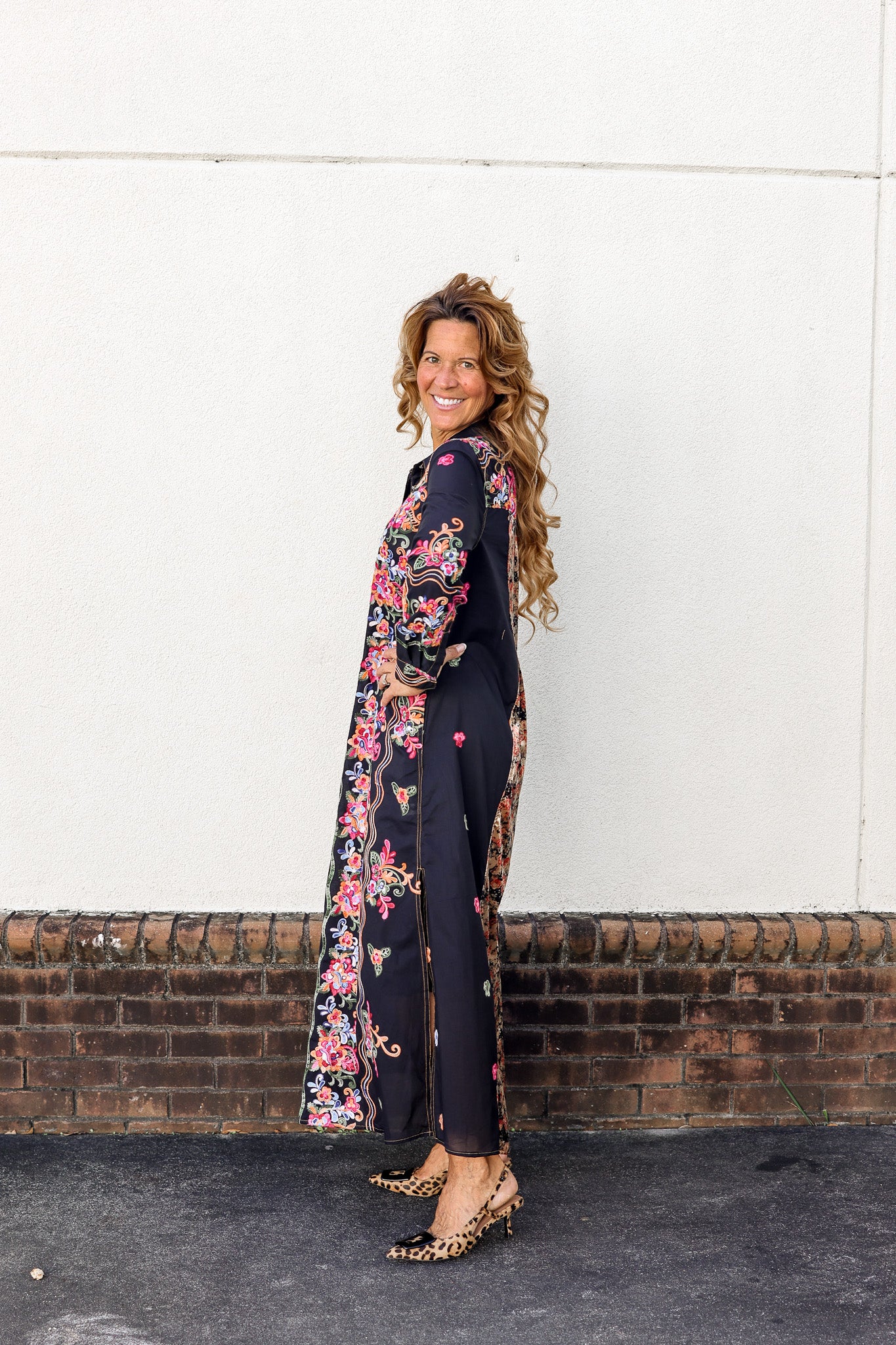 The Meadow of Flowers Duster features intricate embroidery down the front and sleeves, a soft velvet placket, and a stunning floral velvet panel that cascades down the back — creating a true work of wearable art. Designed with side pockets and slits for easy movement, this duster layers beautifully over dresses or denim for a luxe boho-chic look.