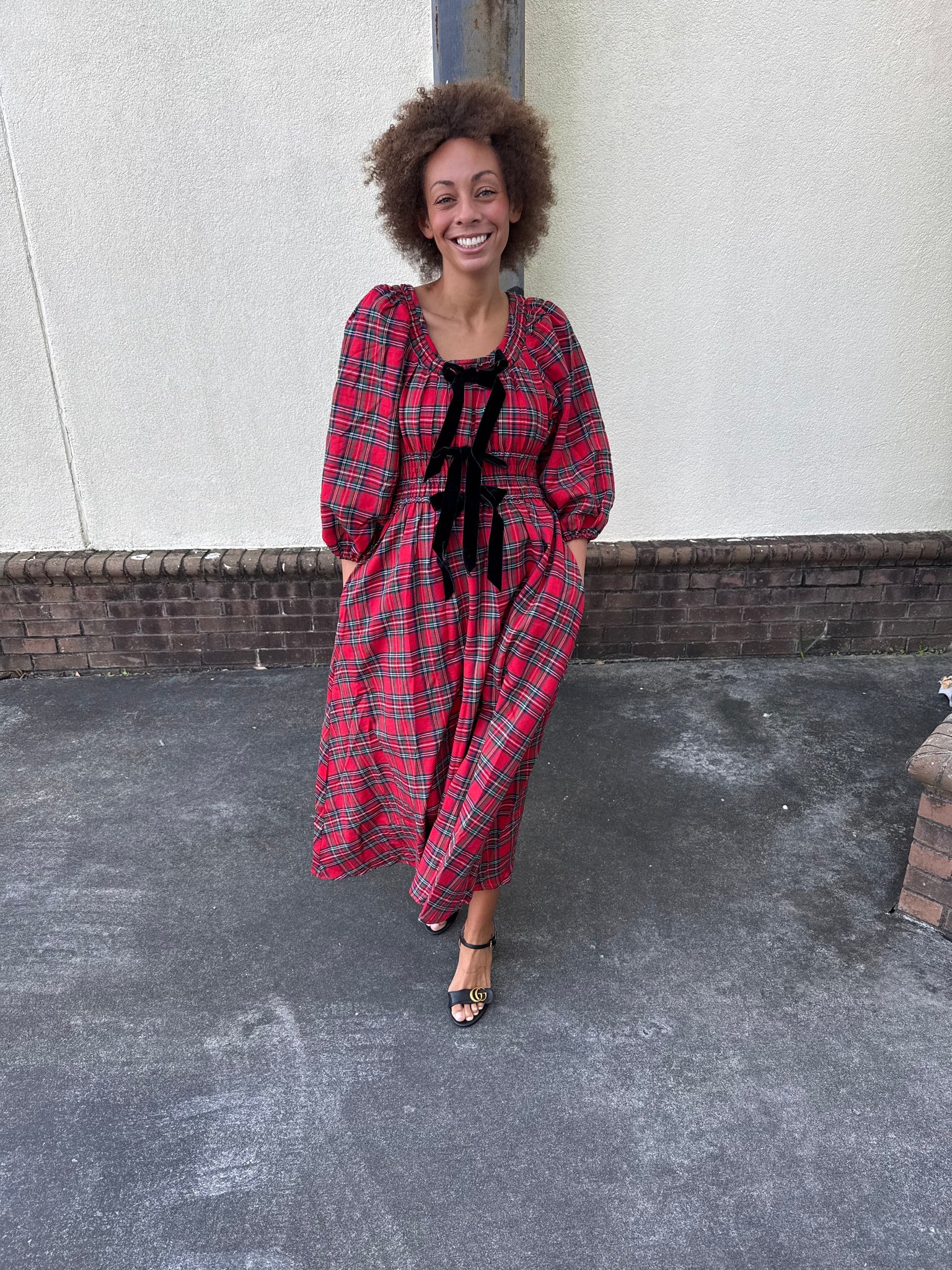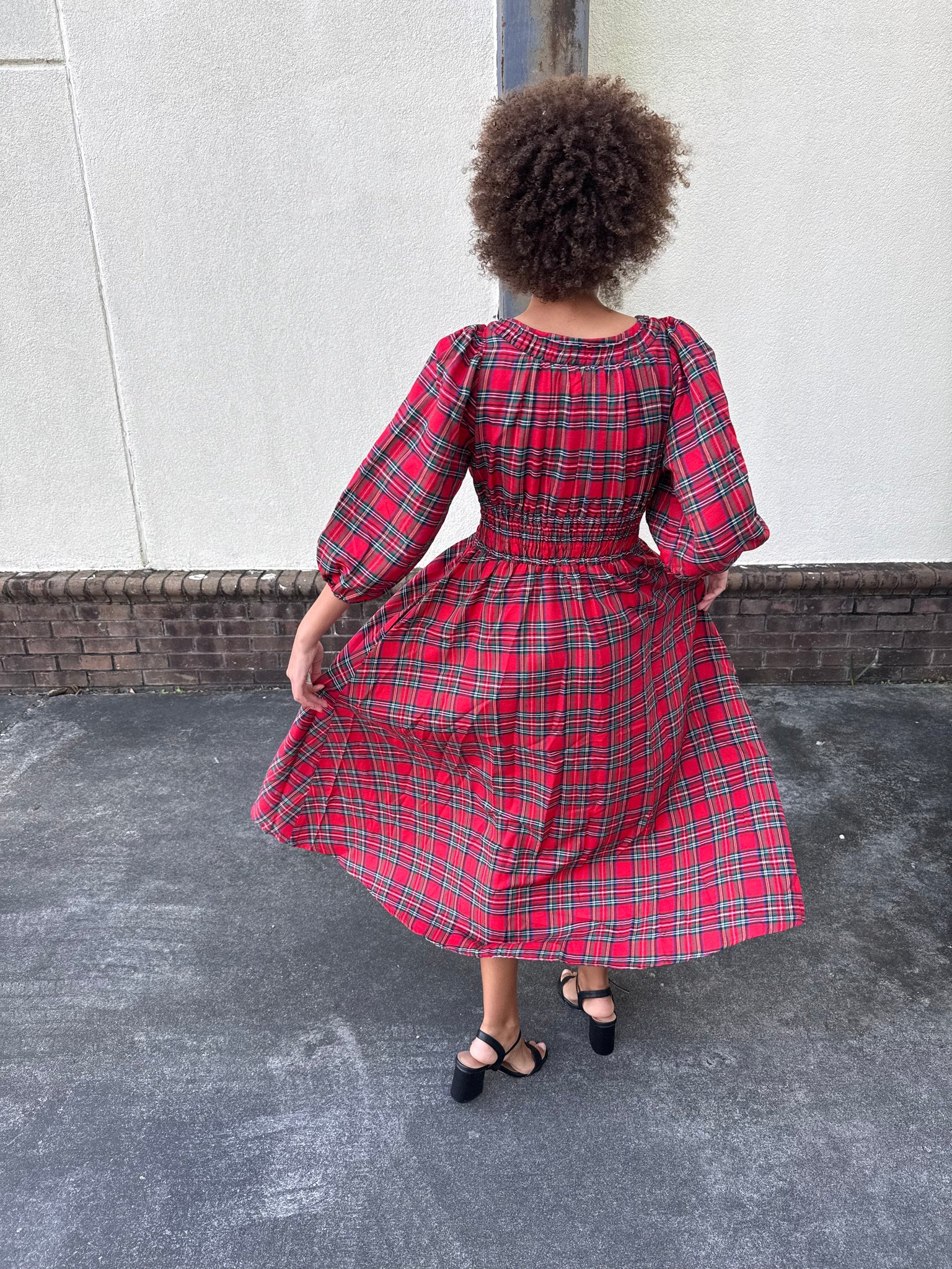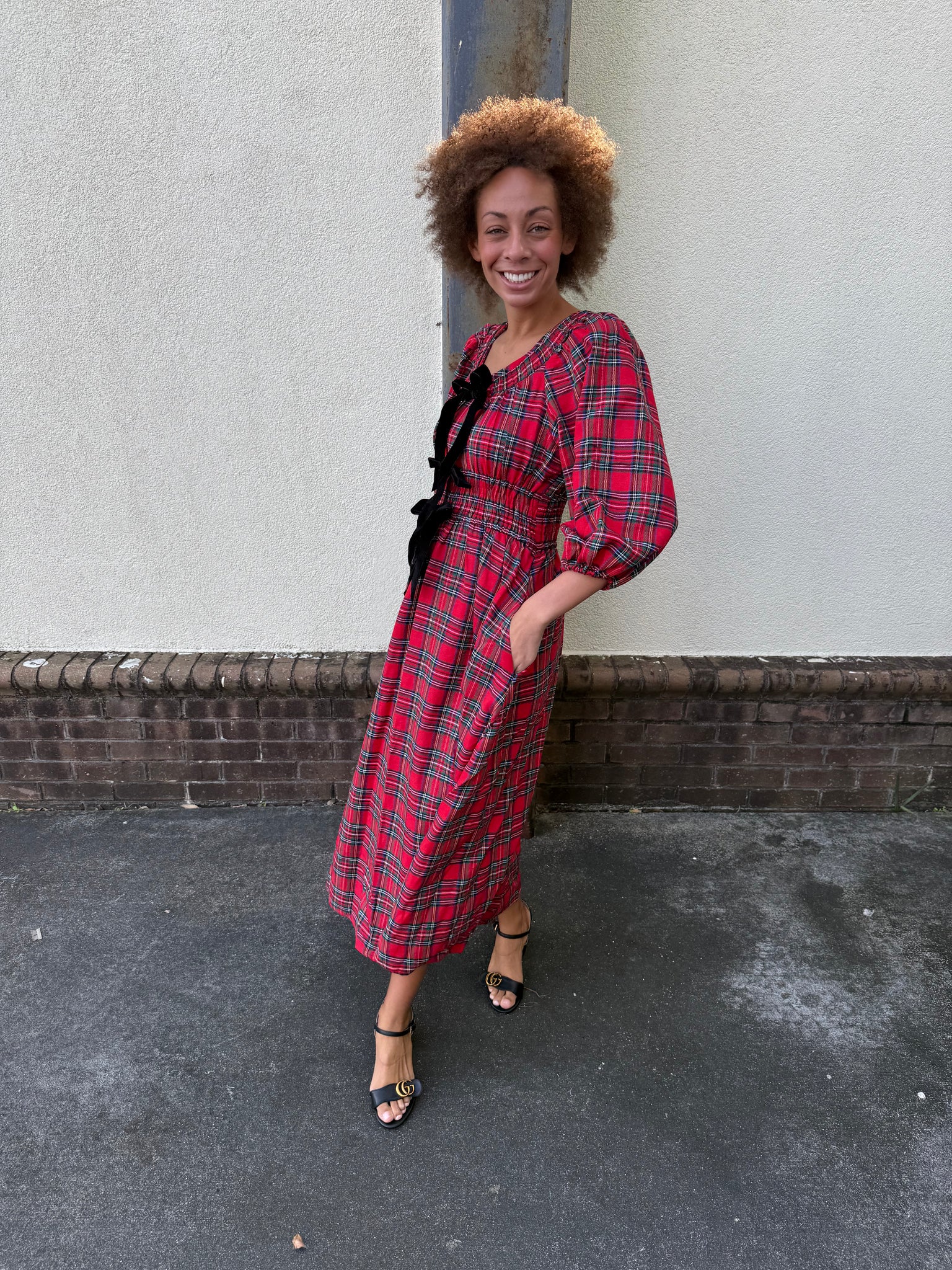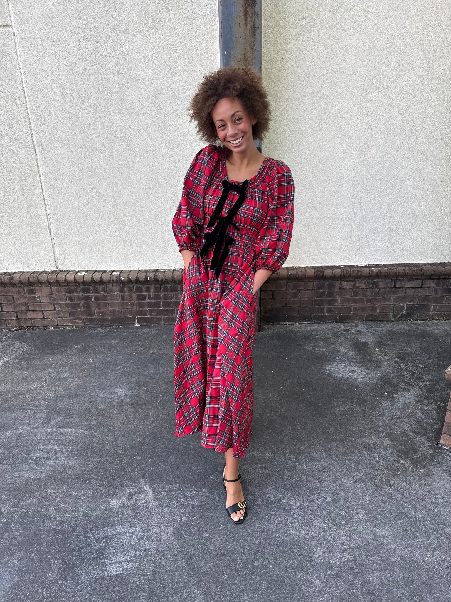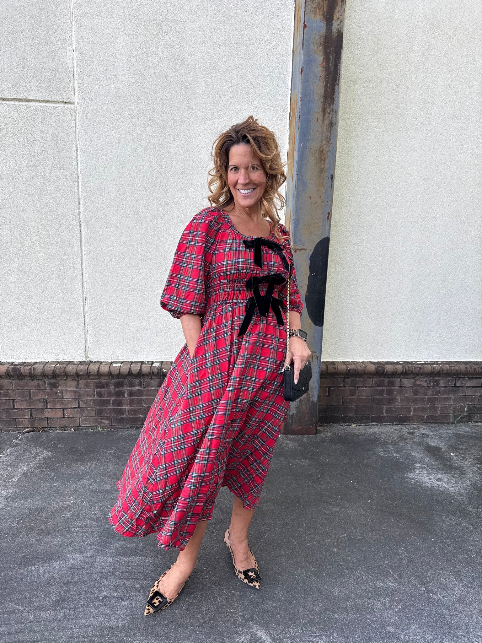 Classic holiday plaid meets timeless charm in this festive favorite. Designed with soft 3/4 puff sleeves, statement black velvet bows, and a comfortable elastic waist, this dress is lightweight, lined, and perfect for Christmas photos or cozy celebrations. Functional side pockets make it as practical as it is picture-perfect.