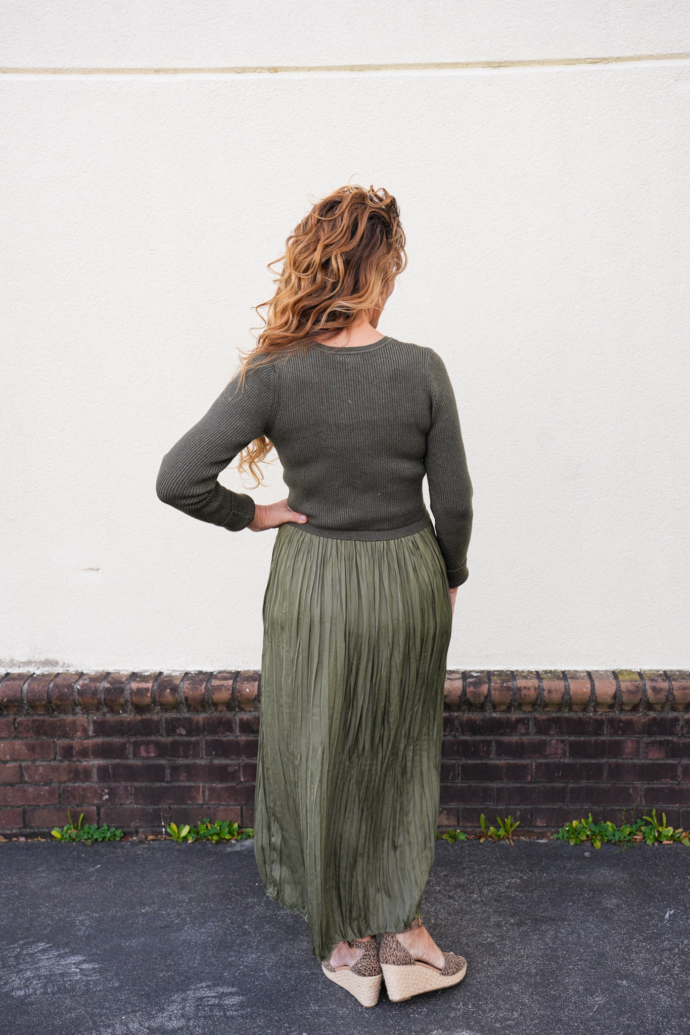 This elegant mixed-media maxi dress features a fitted sweater ribbed knit bodice paired with a softly pleated woven skirt for effortless movement and a flattering silhouette. Designed with long sleeves and a refined, timeless look, it transitions beautifully from day to evening with heels or boots. Polished yet comfortable, it’s a wardrobe staple for the cooler seasons.