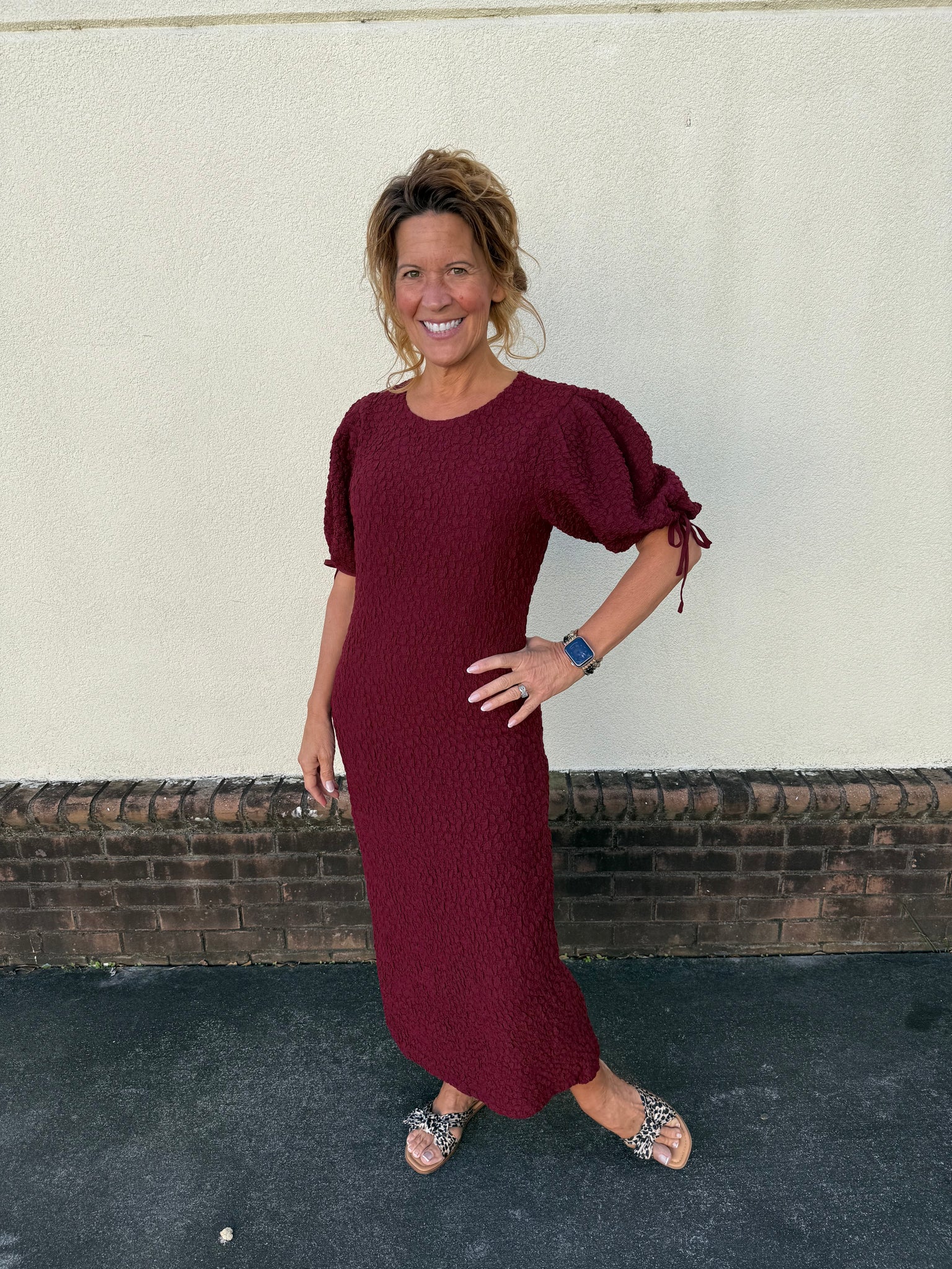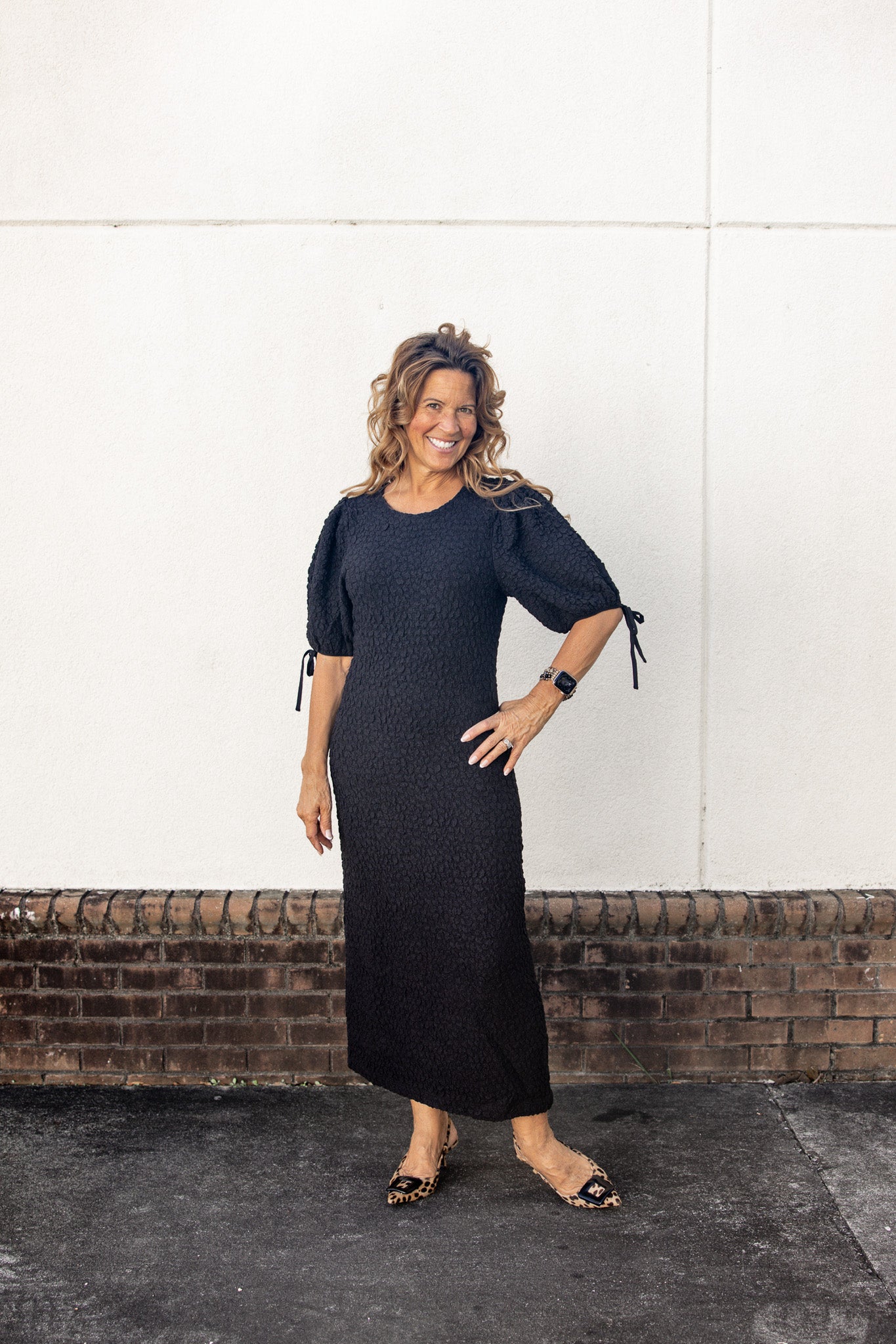 - A-line textured dress with puff sleeves that tie in a bow at the elbow.
