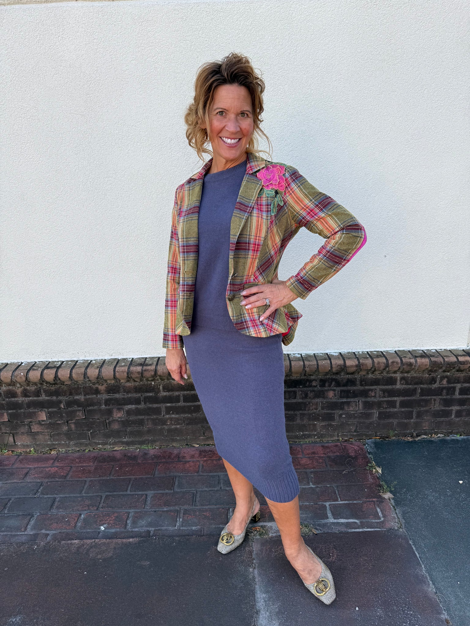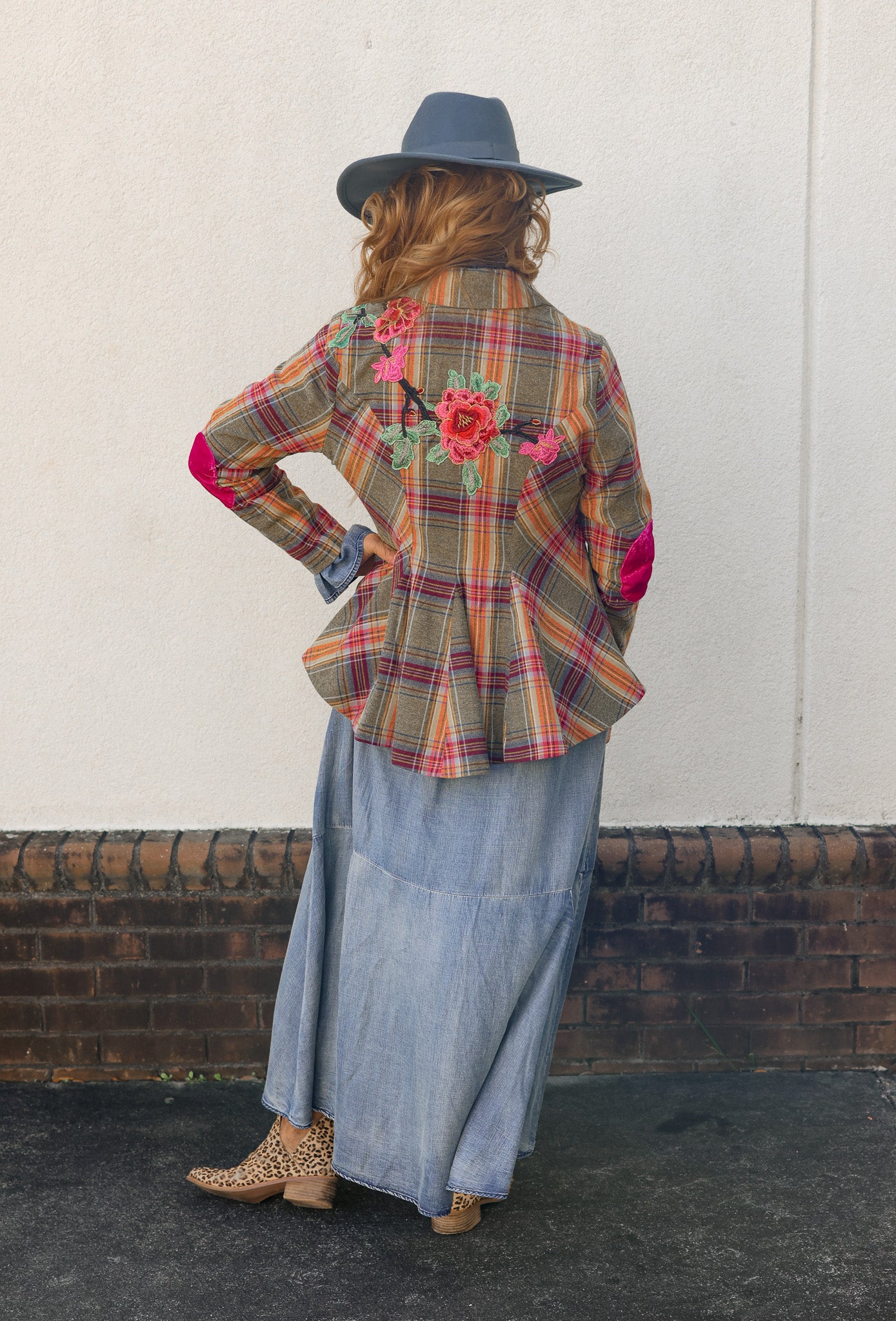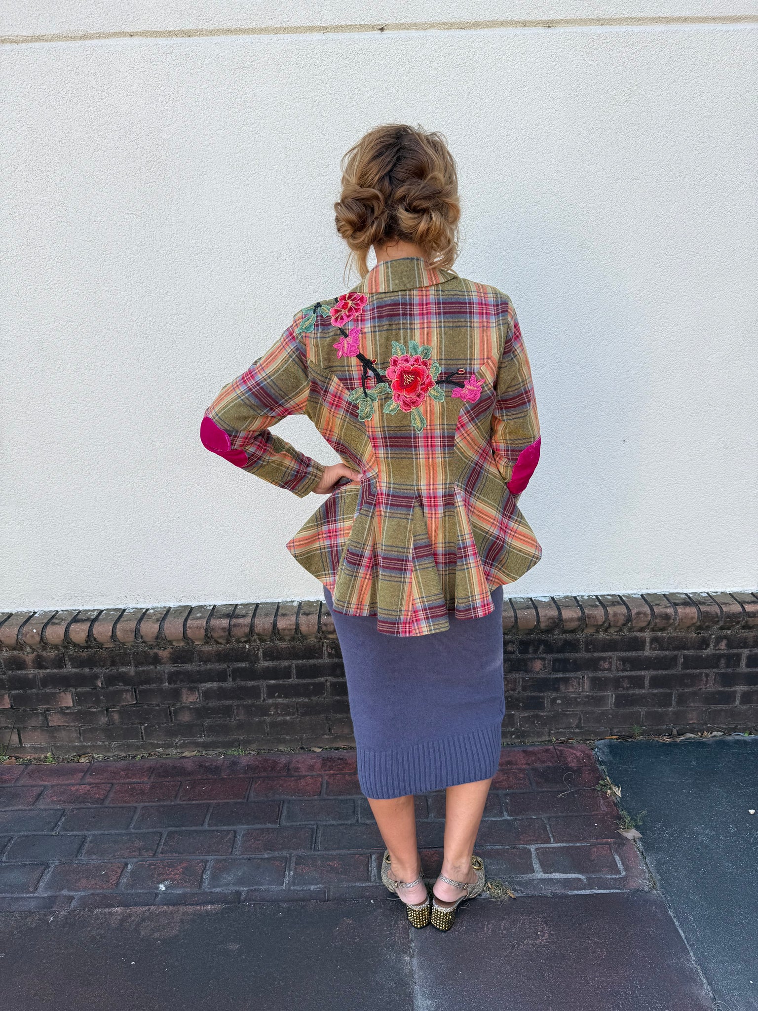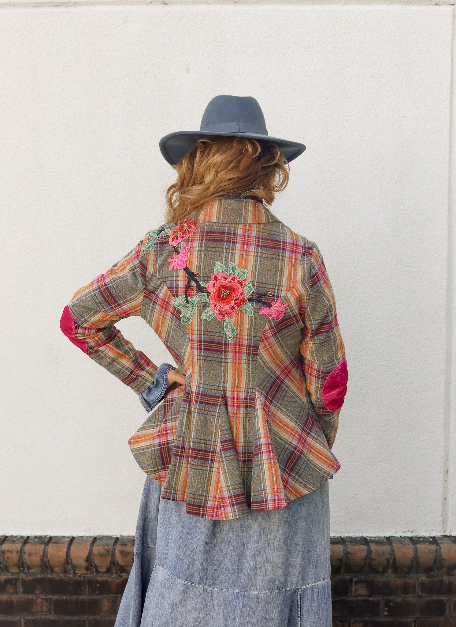 Effortlessly chic and full of personality, this plaid button-up blazer is a true statement piece. Designed in an olive plaid combo, it features stunning embroidered floral appliqués across the front and back shoulders for a feminine, artistic touch. Contrast velvet elbow patches in fuchsia add an unexpected pop of color, while a crystal button and floral tasseled pin at the center front elevate the tailored silhouette with whimsical charm.