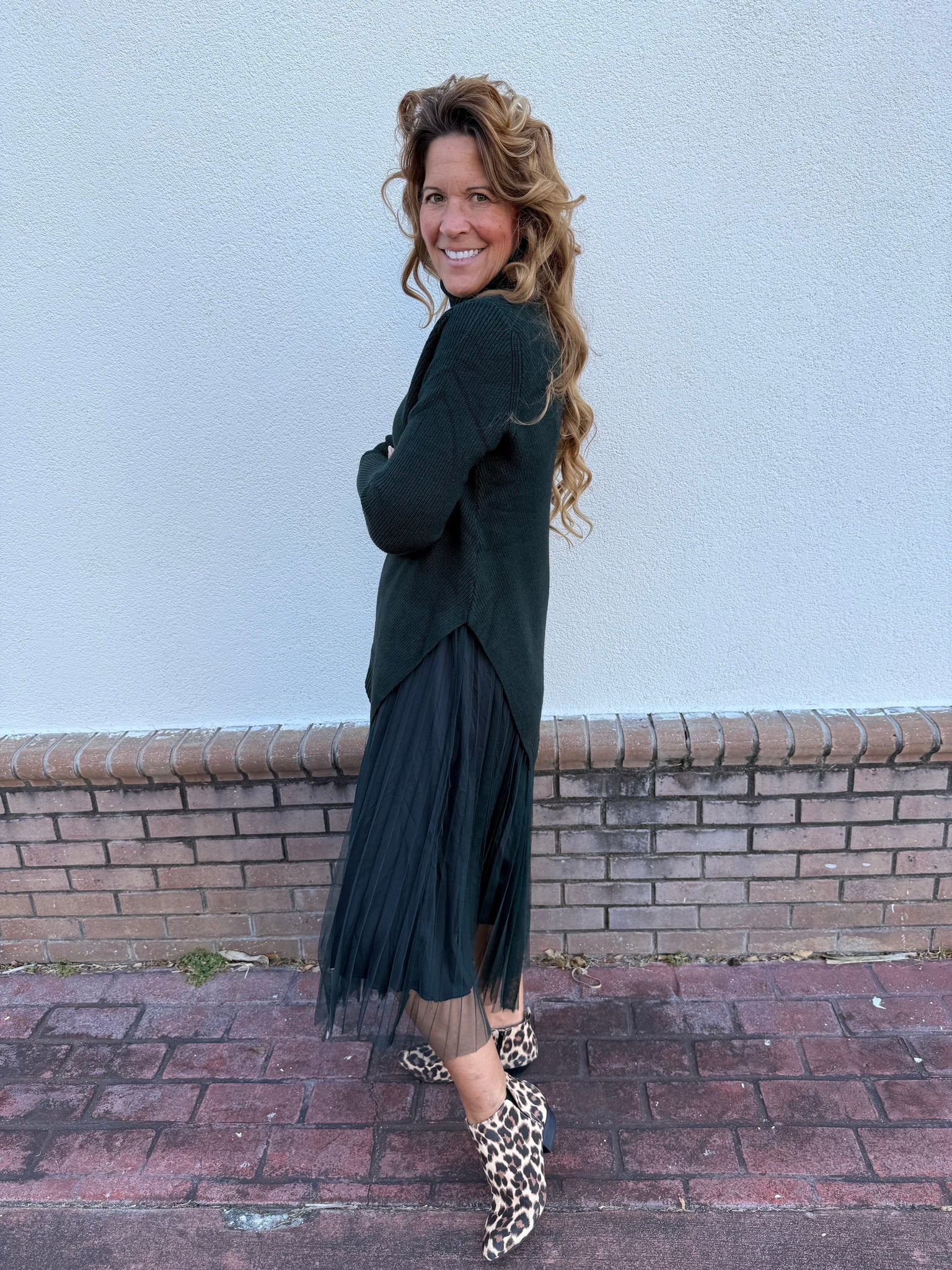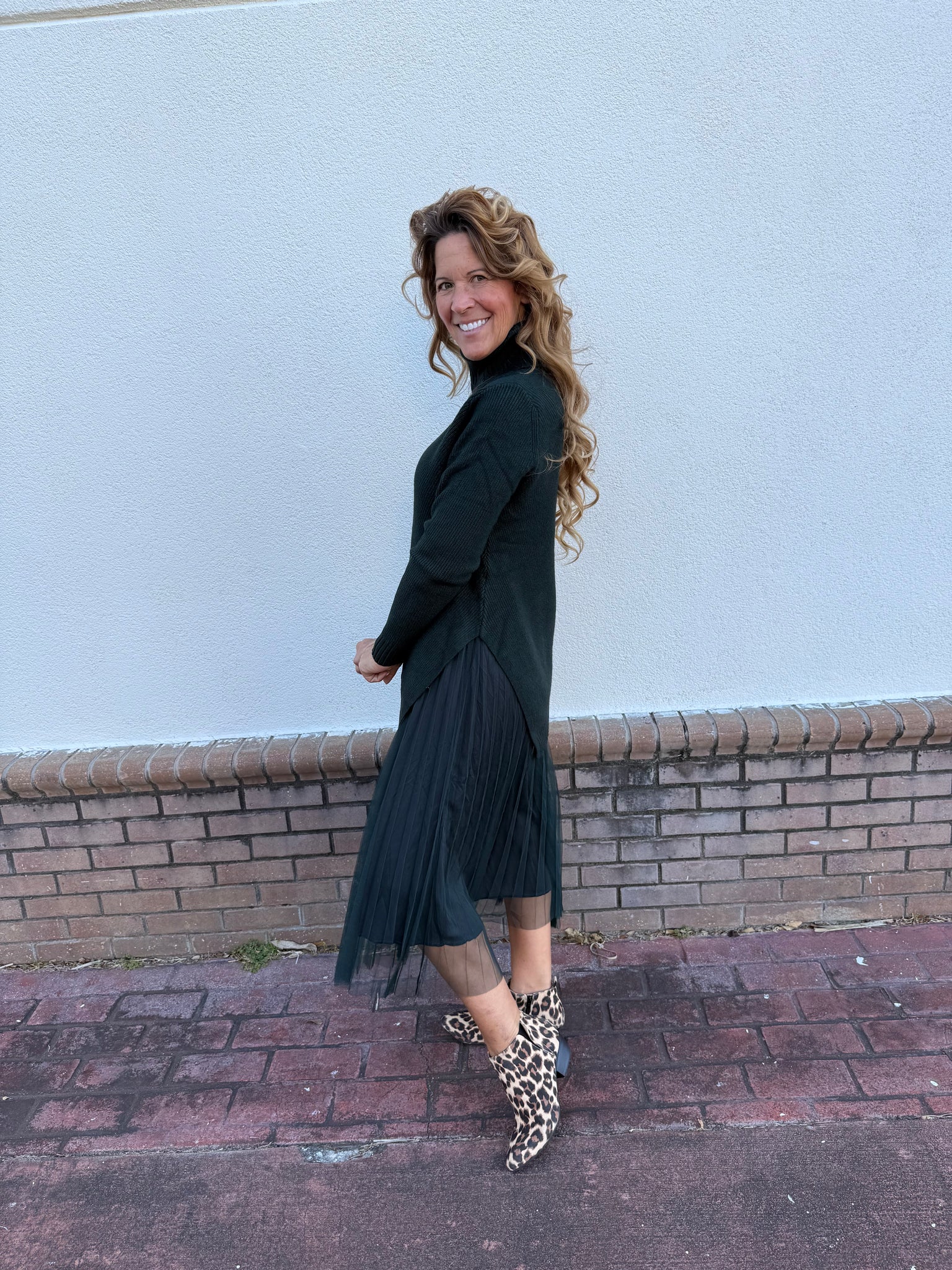 Chic meets cozy in this two-piece set featuring a soft turtleneck sweater with an asymmetric hem layered over a flowing pleated mesh dress. The effortless pairing creates a modern, feminine silhouette that’s perfect for fall and winter.