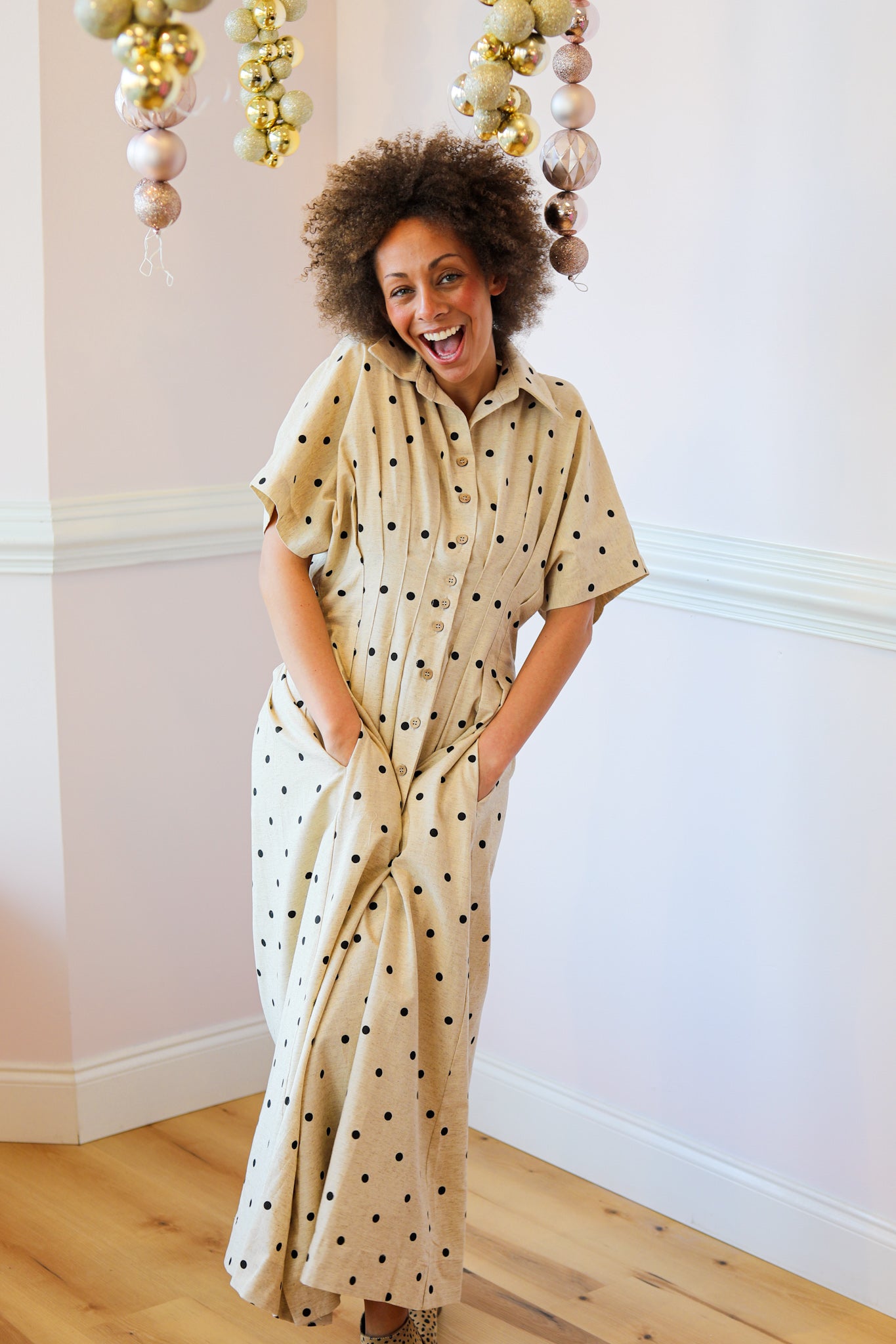 This timeless polka dot midi dress features a flattering button-front design with soft pleating through the waist and relaxed short sleeves. Crafted from a lightweight rayon-linen blend, it offers an easy, breathable fit with a feminine silhouette that’s perfect for spring and summer styling.