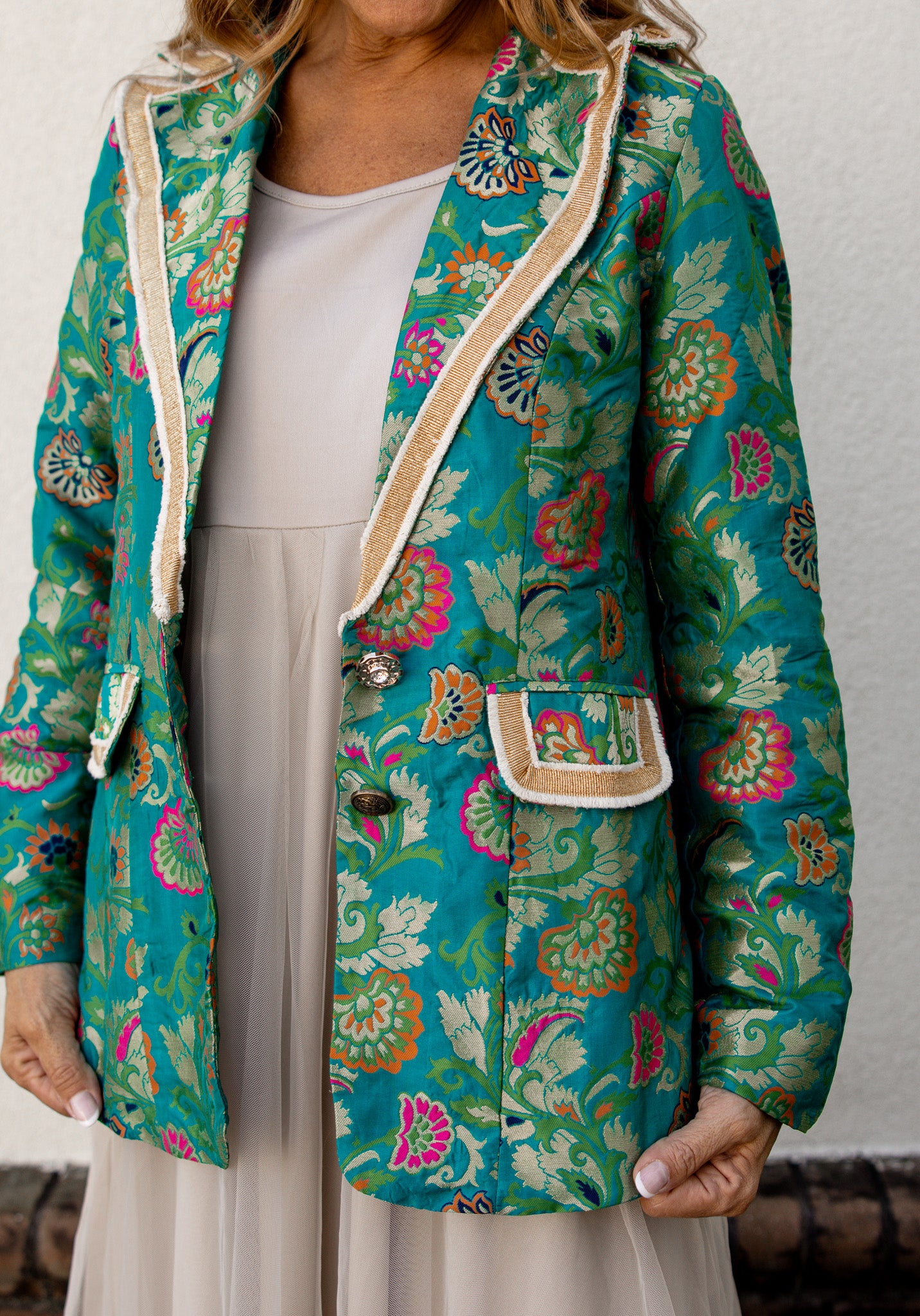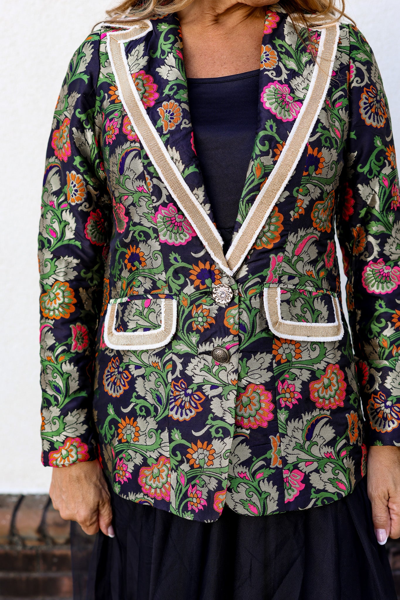 Turn heads in this exquisite floral jacquard silk-blend blazer, featuring a timeless black base with vibrant floral motifs woven throughout. Designed with a touch of old-world glamour, it’s finished with metallic gold trim outlining the collar, lapel, and flap pockets for a luxurious contrast. The blazer is lined with a Francois Boucher “Madame De Pompadour” print satin, adding a stunning artistic detail inside. A single decorative button completes the sophisticated silhouette.