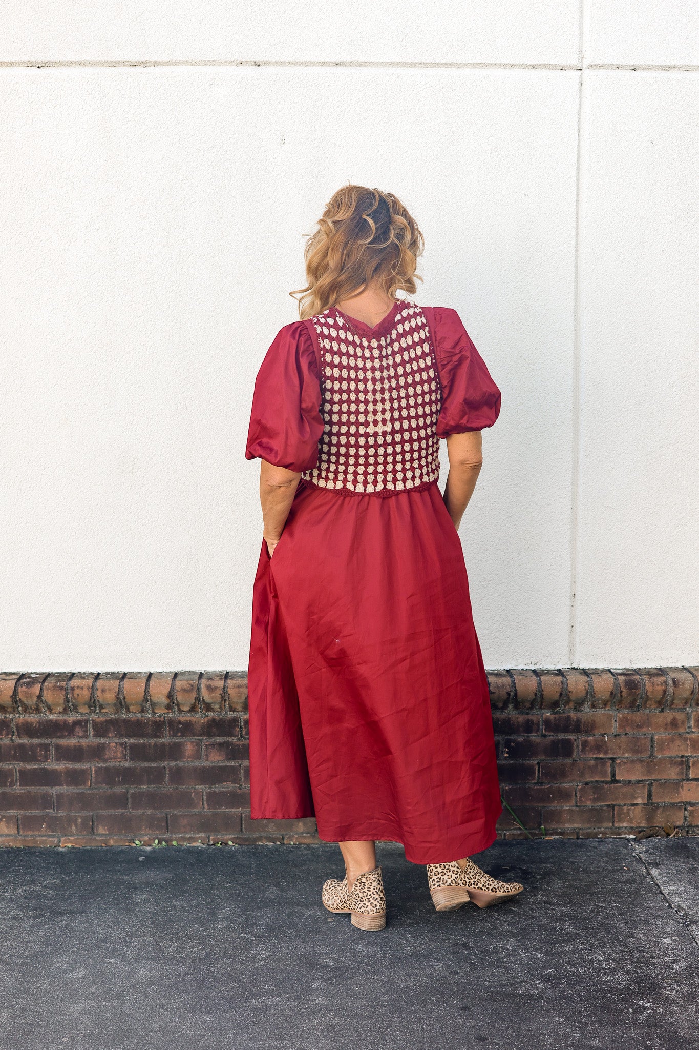Classic red midi dress featuring an A-line silhouette, bubble sleeves, and side seam pockets. Comes with a fully detachable vest, allowing you to wear it with or without for two looks in one. Designed with a knit bodice, woven sleeves, and skirt for structure and comfort.