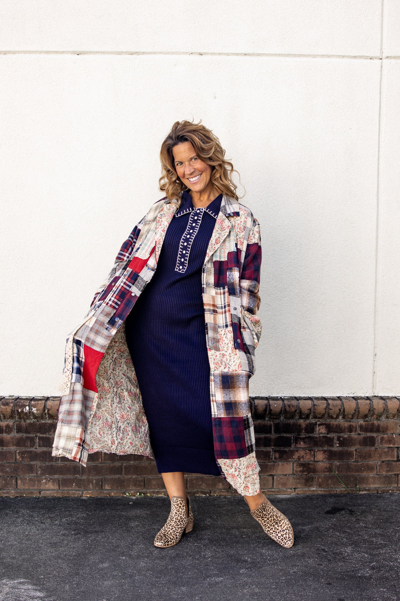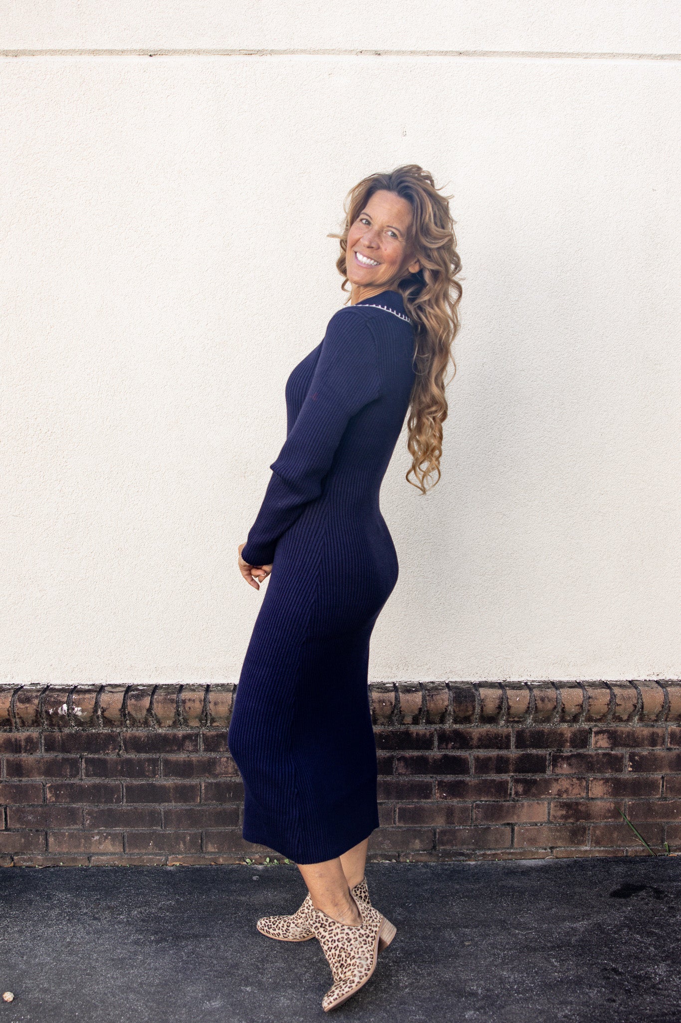 Effortlessly chic and cozy, this ribbed sweater midi dress features a collared neckline with button-down placket and contrast blanket stitching for a touch of detail. The long fitted sleeves and body-skimming rib knit create a flattering silhouette that transitions perfectly from day to night. Midi length makes it versatile for work, church, or dinner plans, while the soft sweater knit keeps you comfortable all season long.