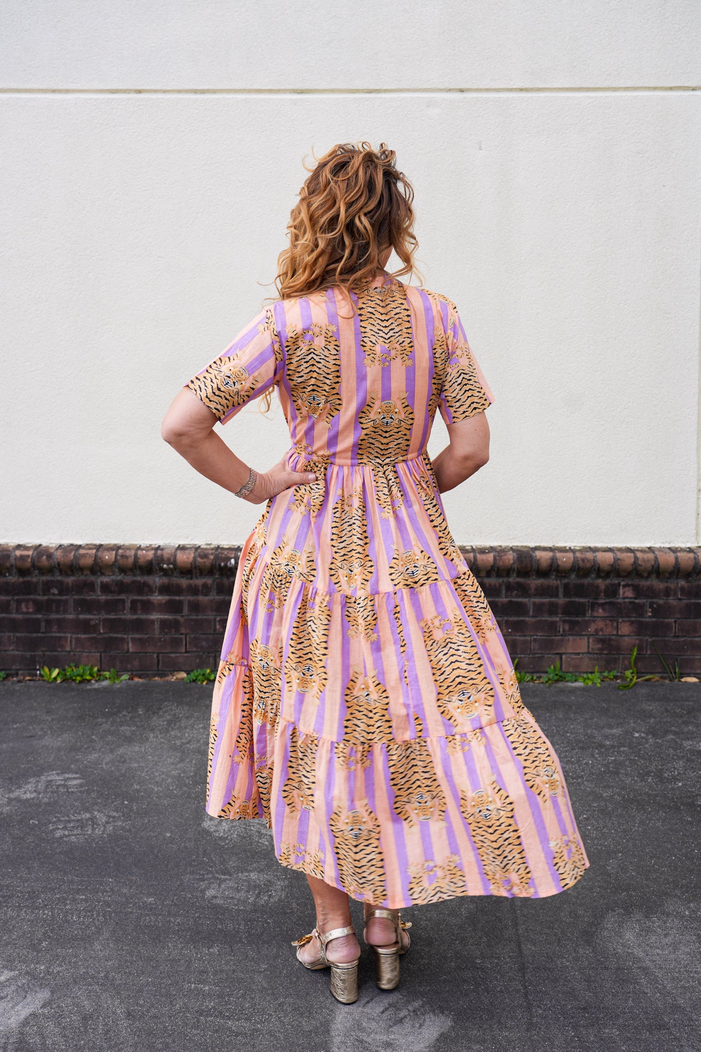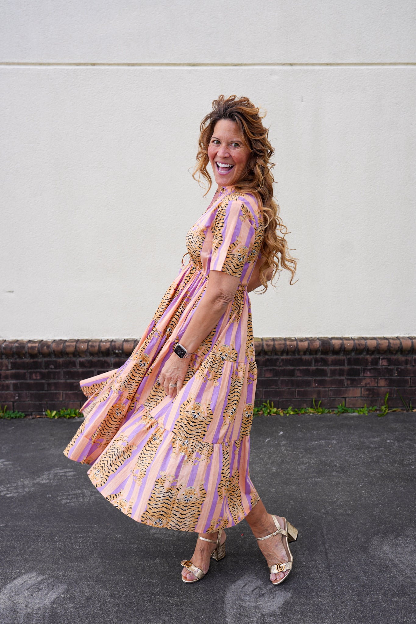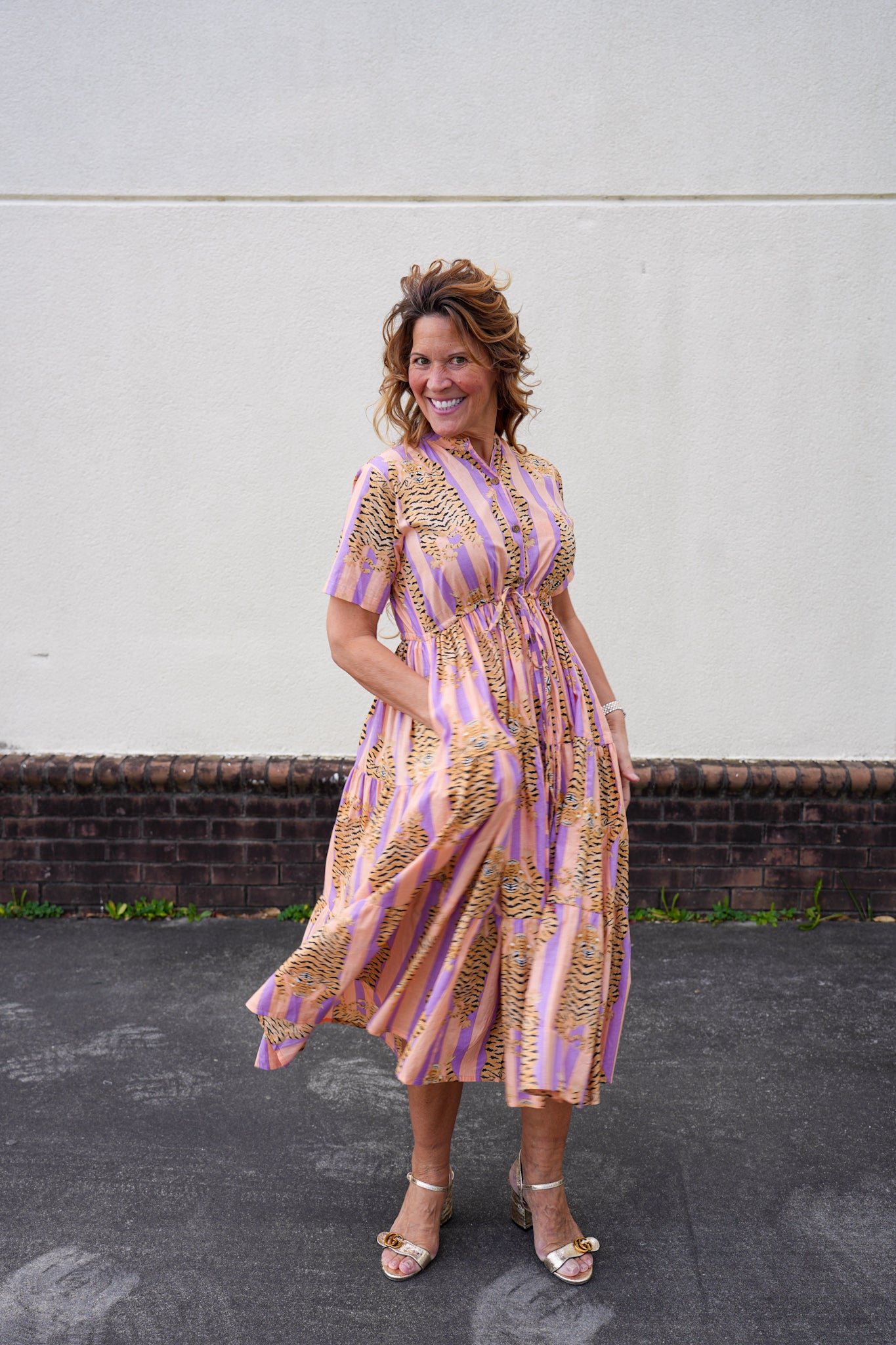 This midi dress features a striking tiger-inspired print with soft vertical striping for a bold yet feminine look. Designed with a relaxed silhouette, adjustable drawstring waist, and flowy tiered skirt, it’s effortlessly flattering and comfortable for all-day wear. An easy statement piece you can dress up or down.