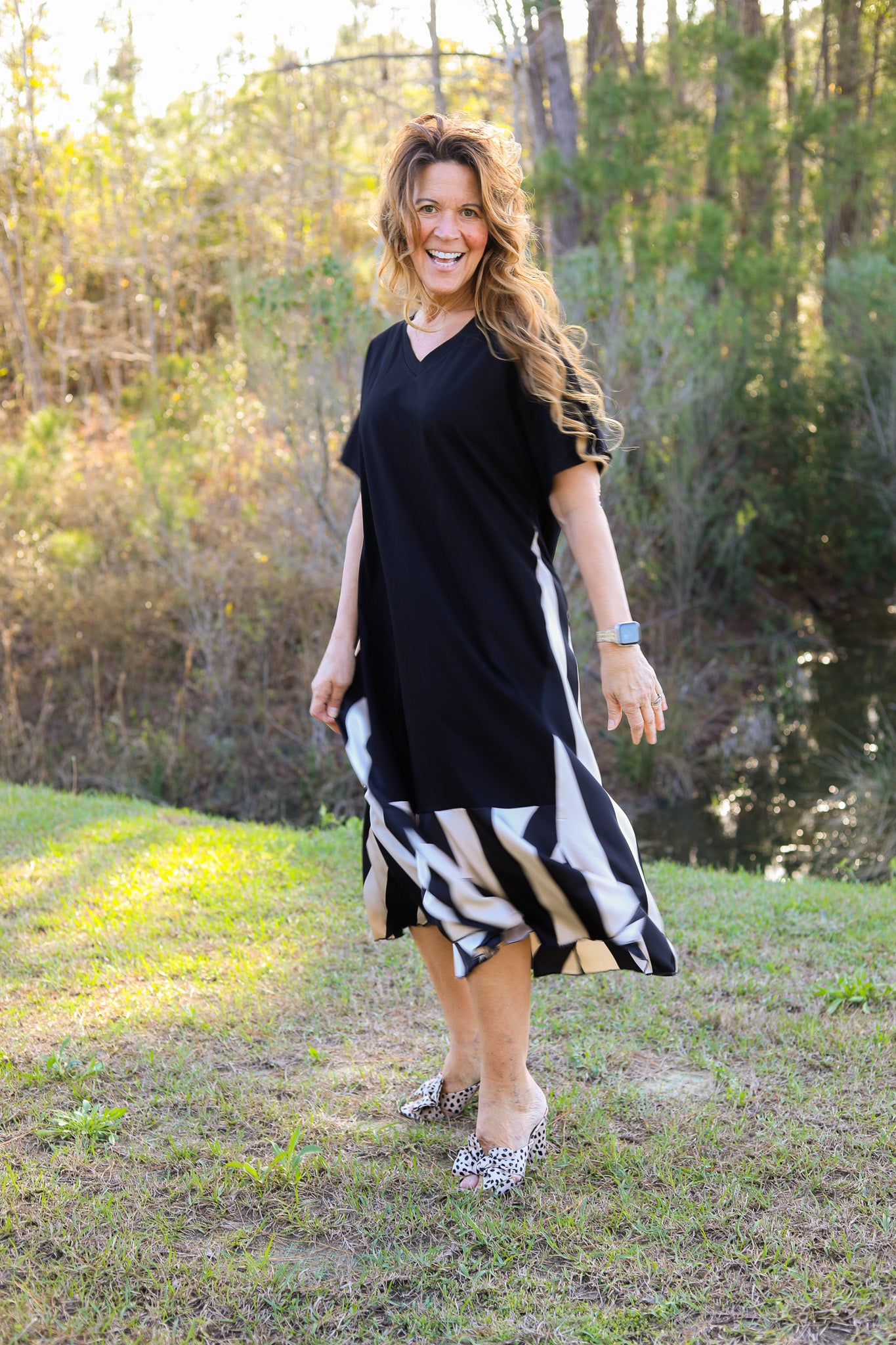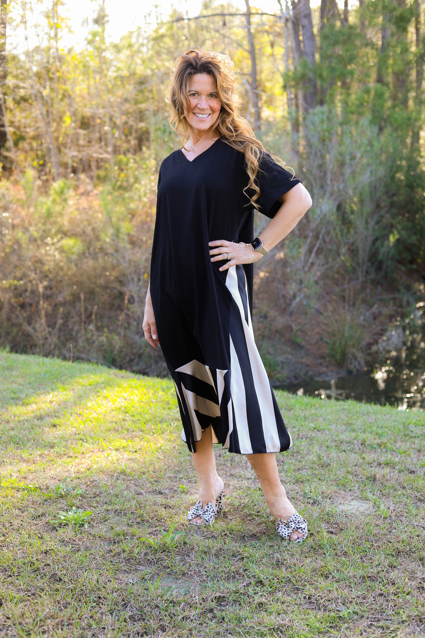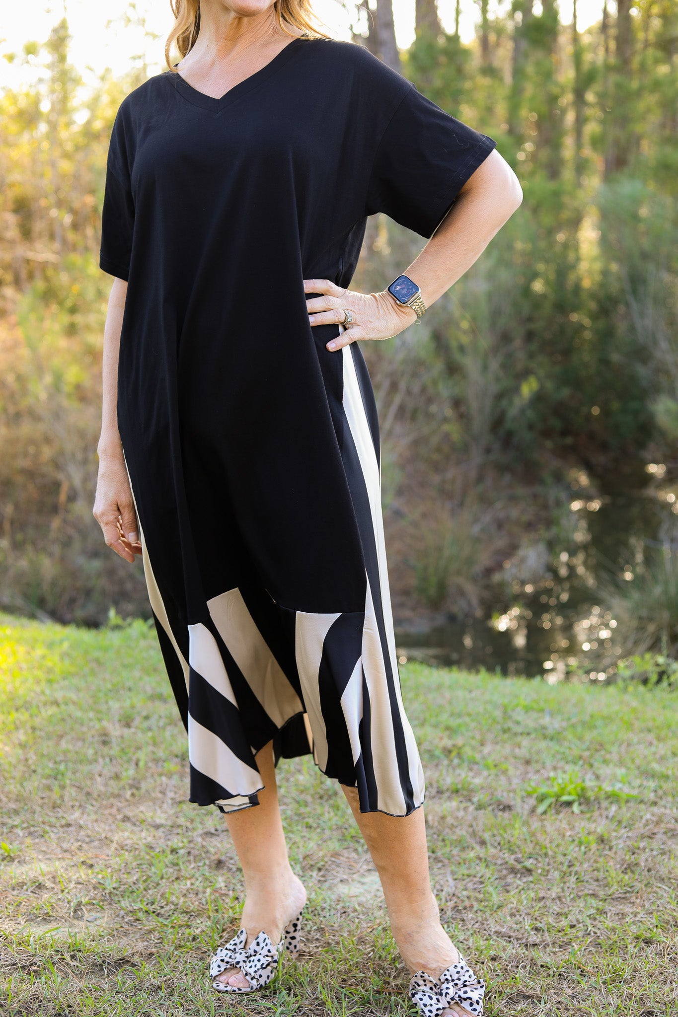 Modern and effortless, this maxi dress features a soft T-shirt knit bodice with a relaxed silhouette and short sleeves. The contrast striped silk skirt panel adds movement and a bold statement detail, creating a stylish mixed-media look that’s both comfortable and elevated.