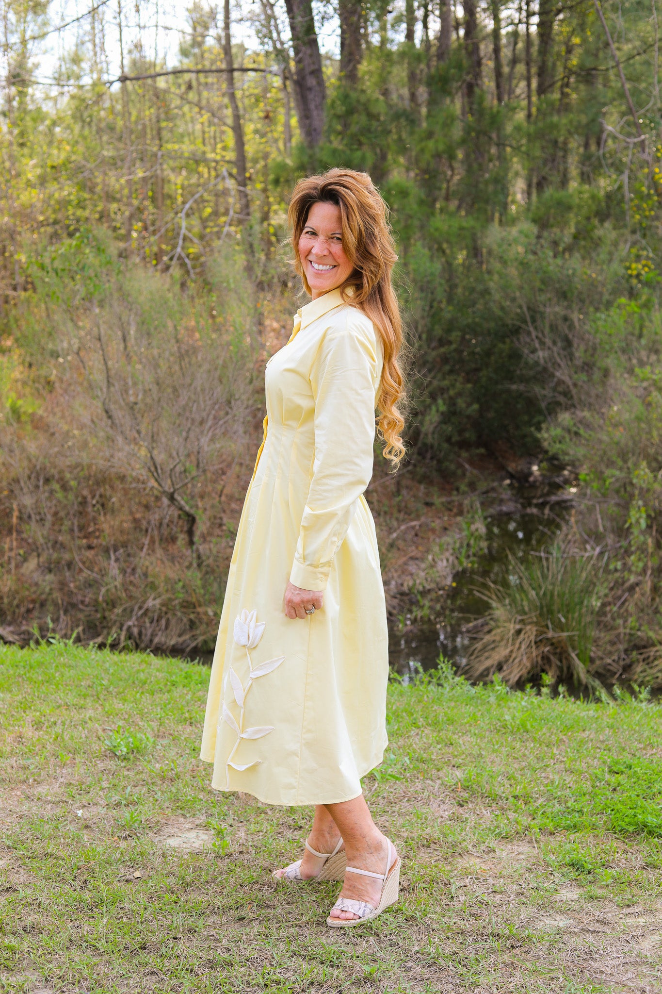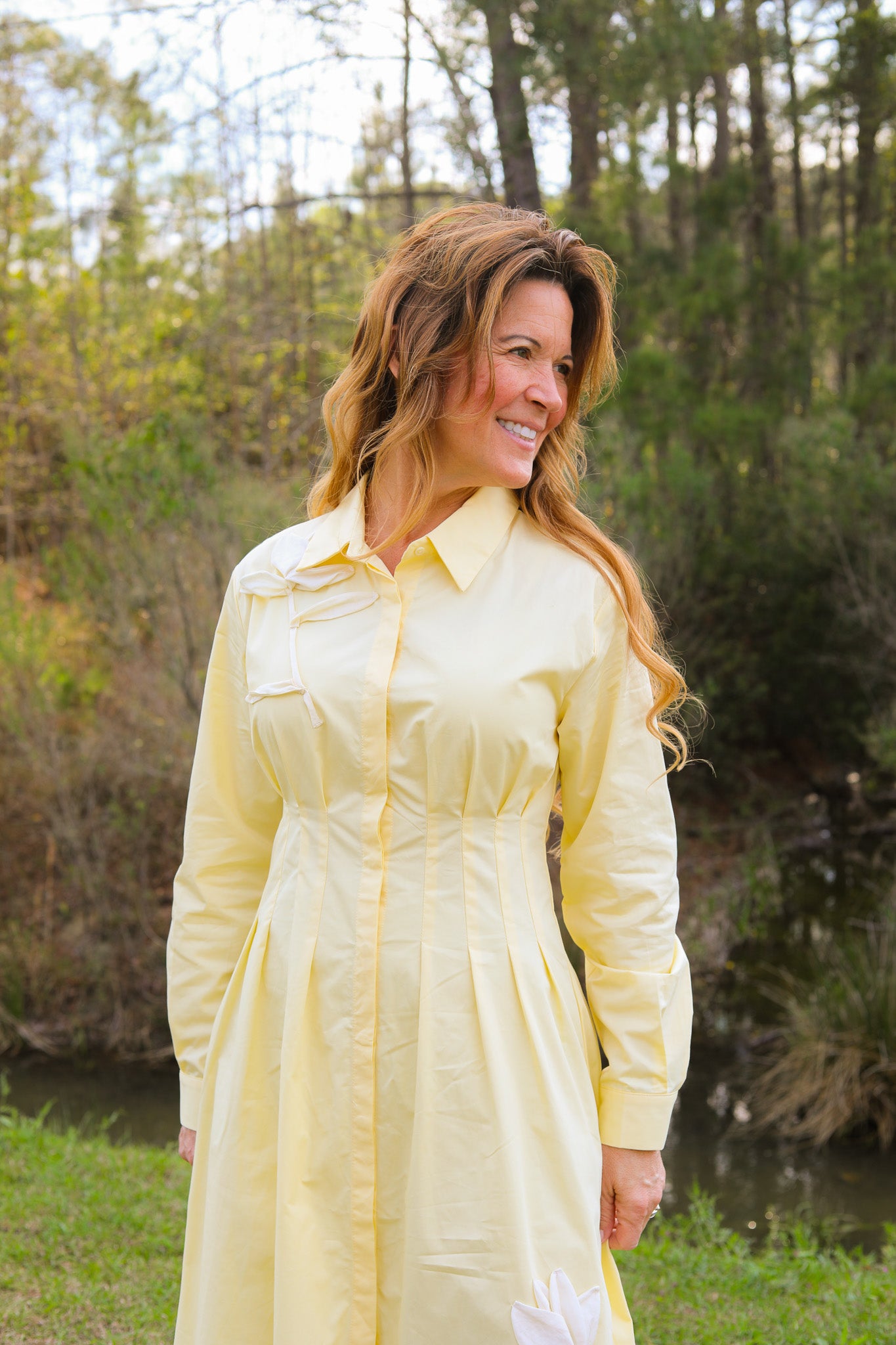 Soft, feminine, and effortlessly refined—this butter yellow cotton shirt dress is a true standout. Designed with a classic button-down front and tailored silhouette, it features delicate appliqué floral details along the shoulder and a statement bloom at the hem for a touch of artistry. The structured shirt style meets graceful movement, making it perfect for both polished days and special moments.