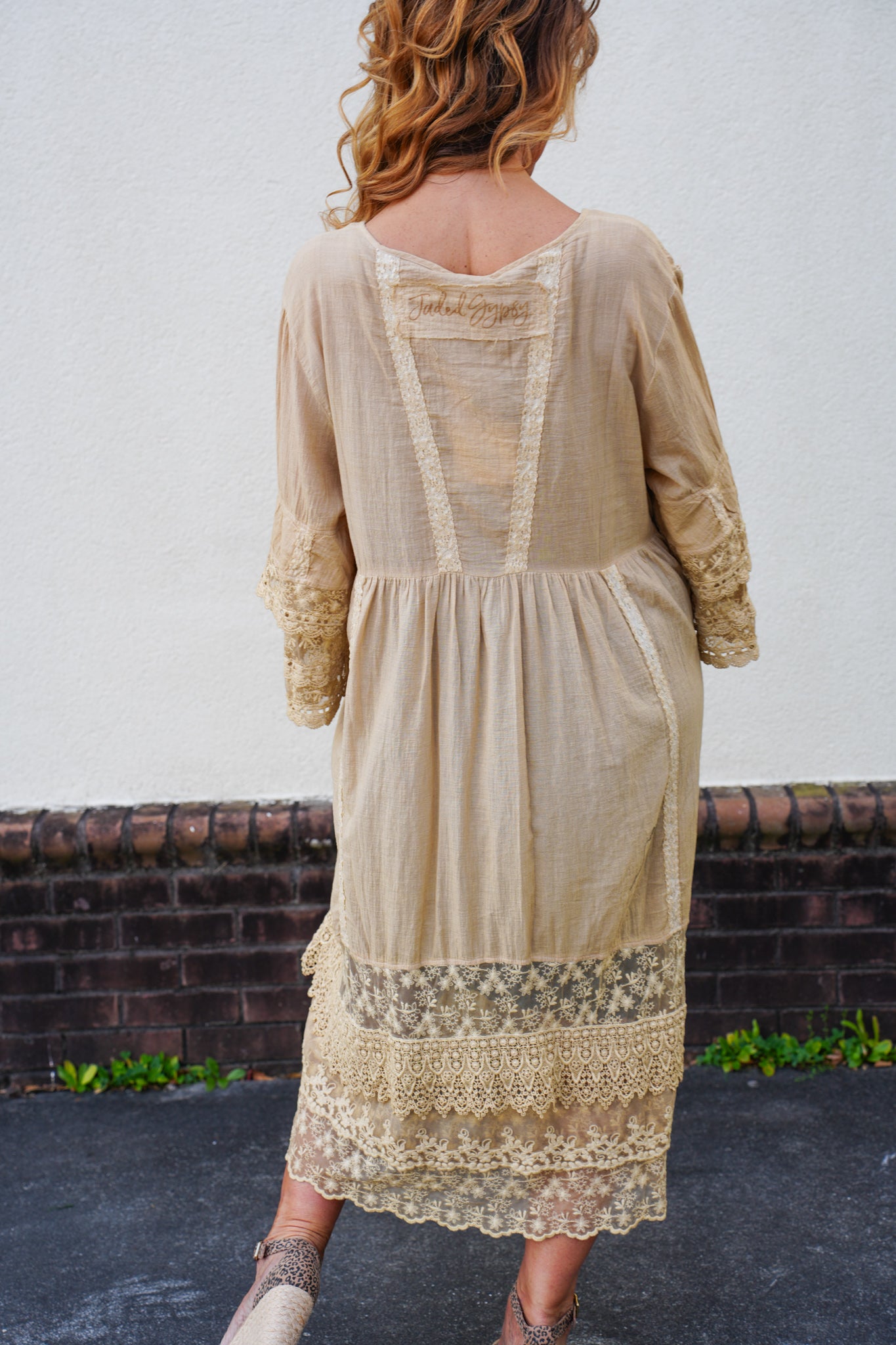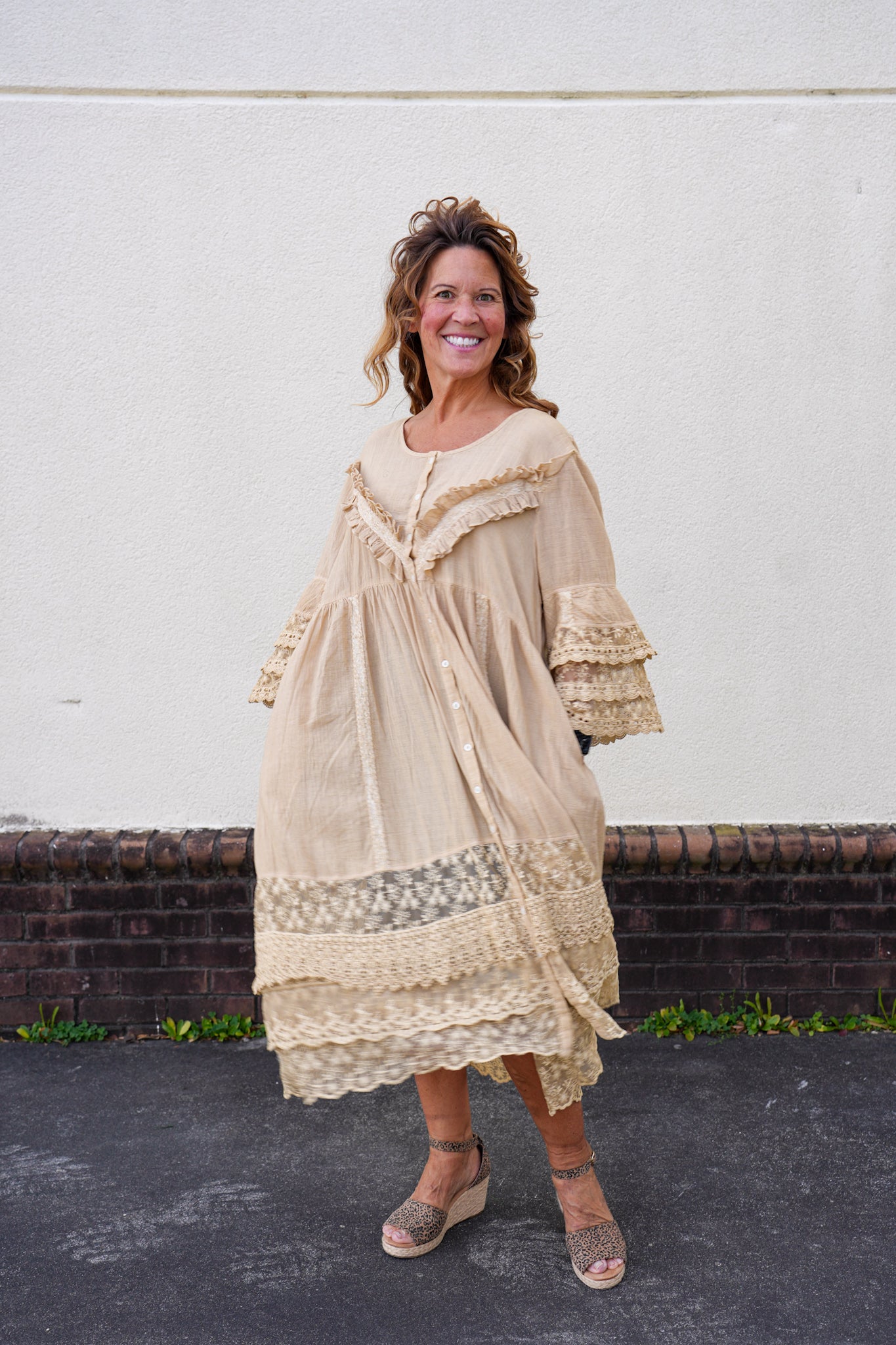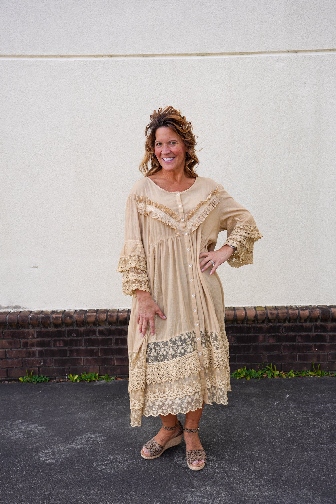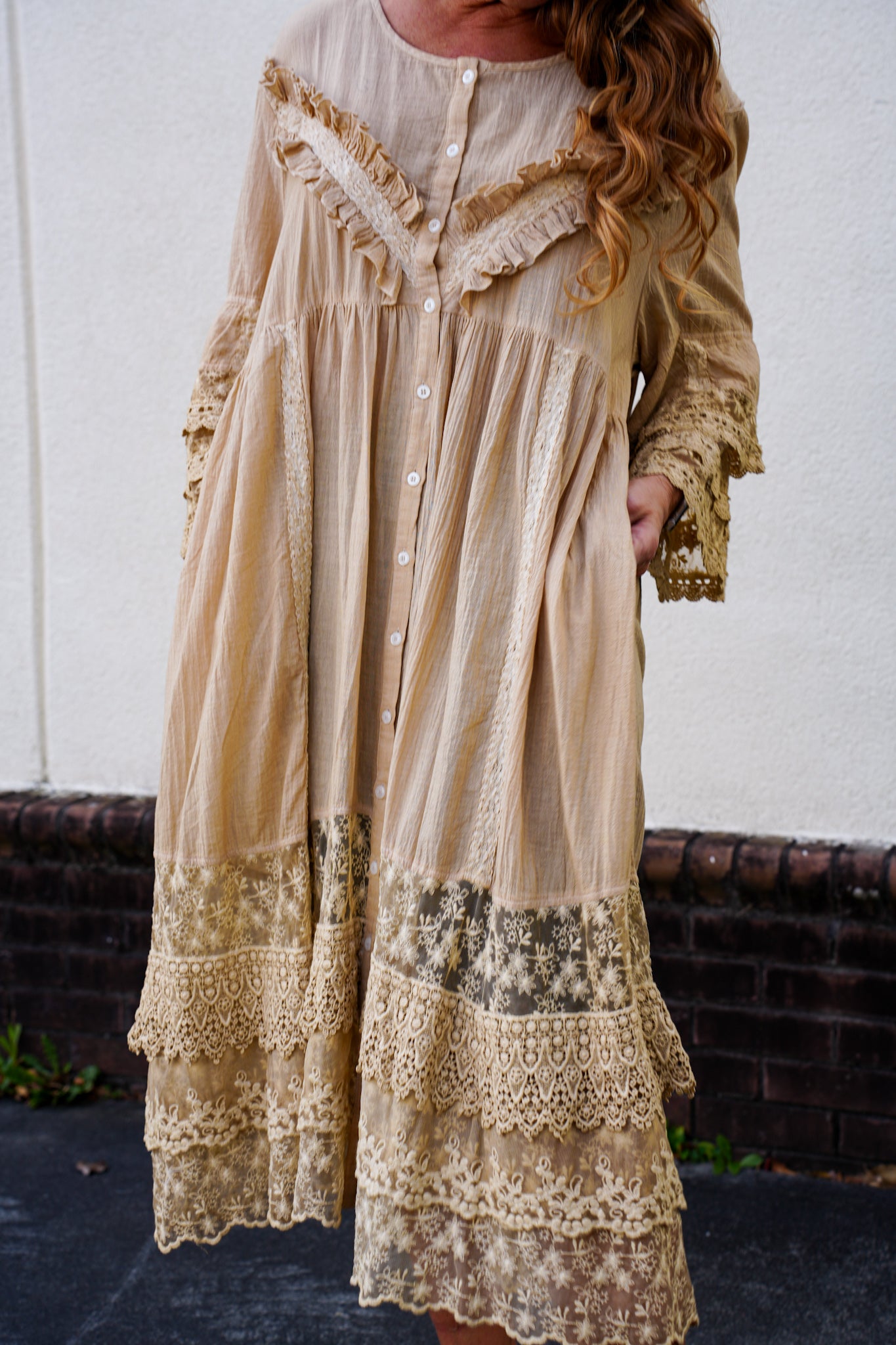 Soft, romantic, and effortlessly versatile, this lace-trim duster dress is designed to be worn open as a flowing layering piece or buttoned up as a lightweight dress. Featuring delicate lace detailing, a relaxed silhouette, and airy fabric, it adds beautiful texture to any outfit.