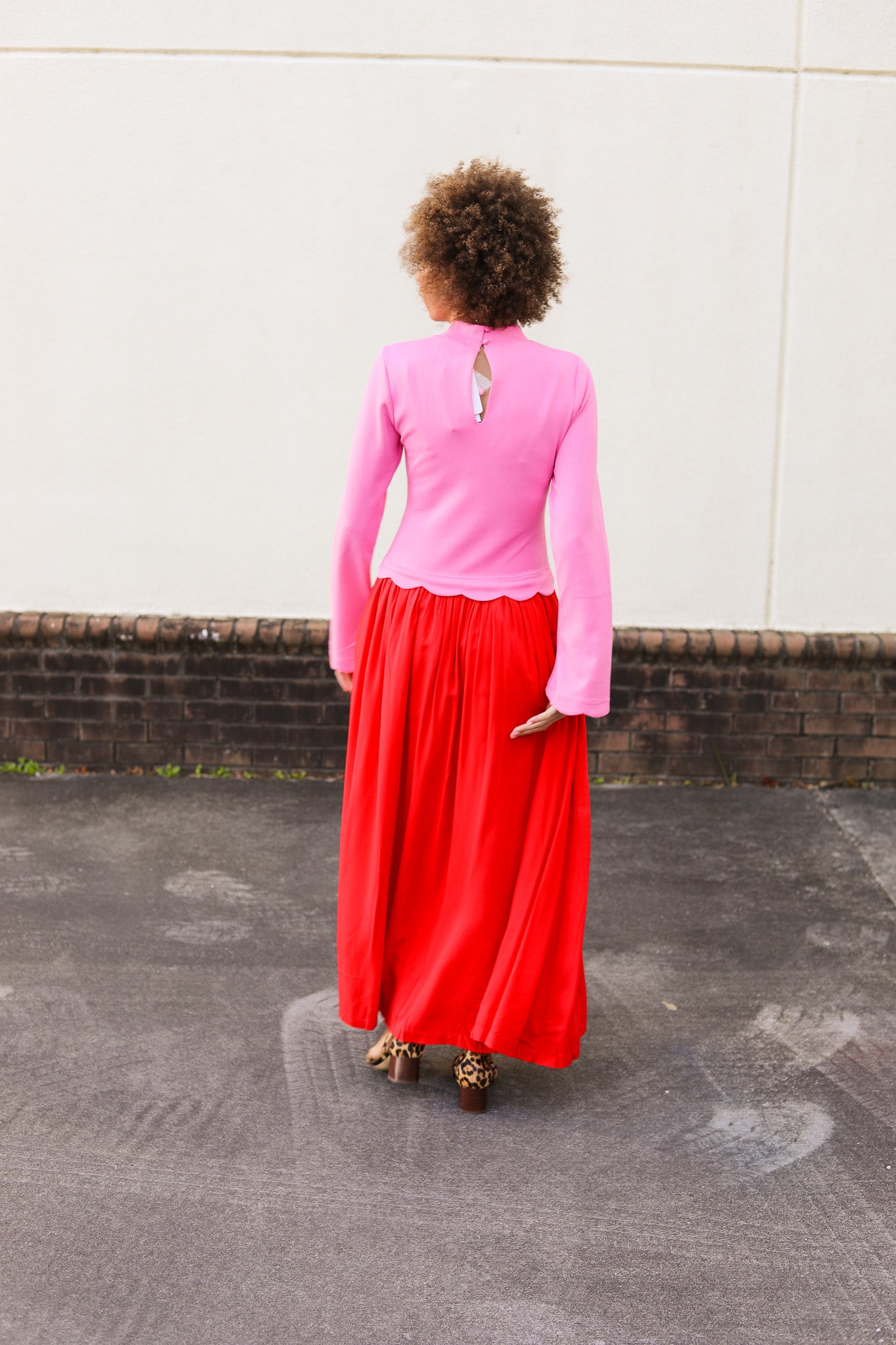 From holiday parties to Valentine’s dates, this stunning color block dress is a showstopper in every season. Featuring a scalloped hemline, long sleeves, and a striking pink-and-red contrast, it blends modern charm with timeless femininity. The knit top meets a flowing maxi skirt for a beautifully flattering silhouette that moves effortlessly with you.