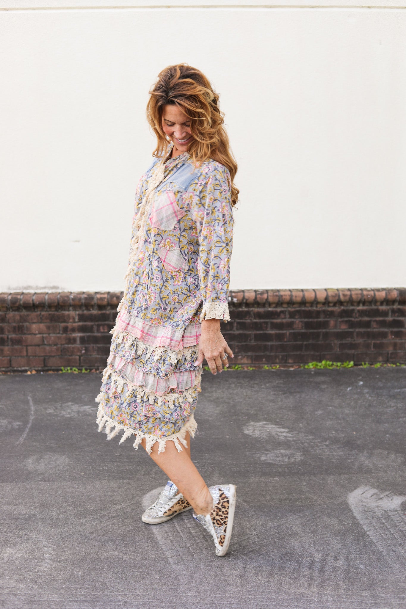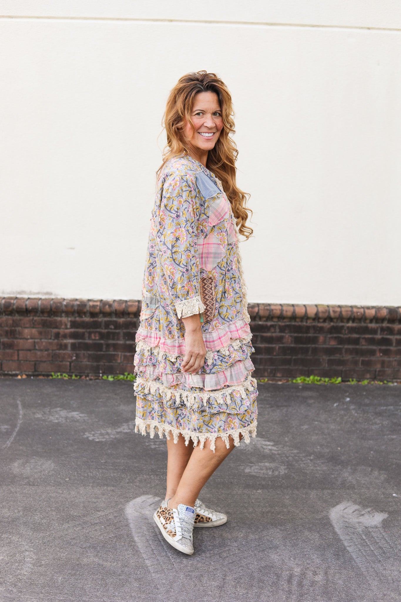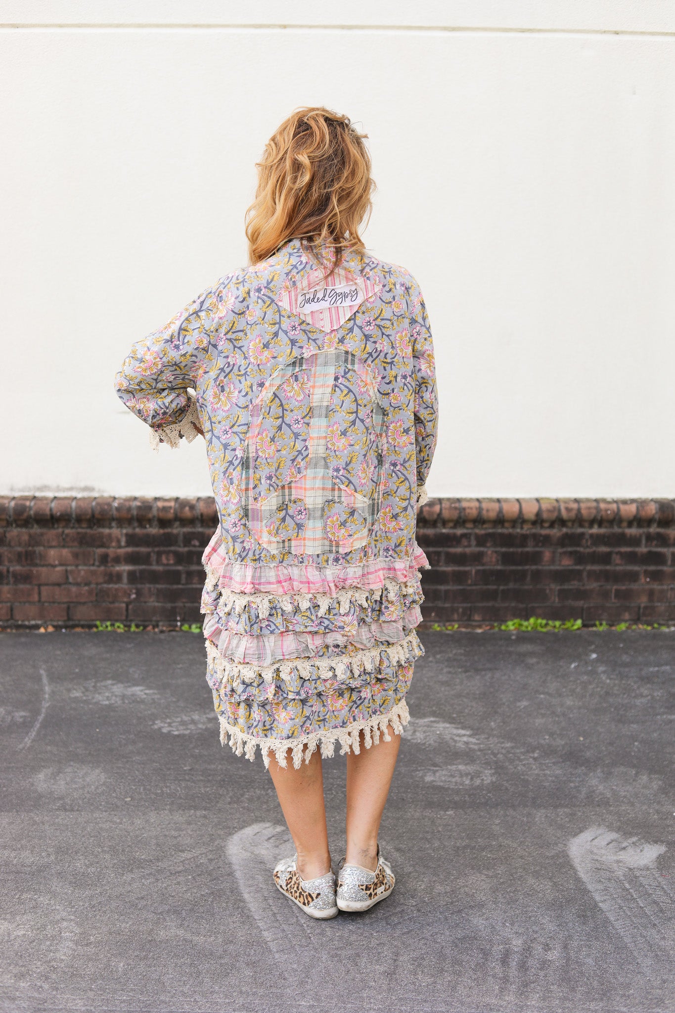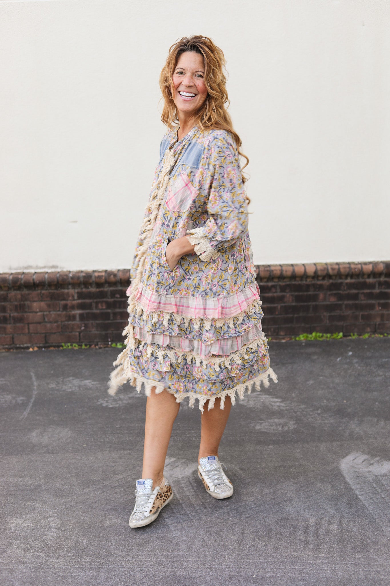 A romantic, boho-inspired dress featuring patchwork florals, soft pastel tones, and layers of fringe and ruffle trim. Lightweight and easy to wear for a touch of cottage core charm. This dress was a duster, but we hand sewed up the front seam to turn it into a dress.