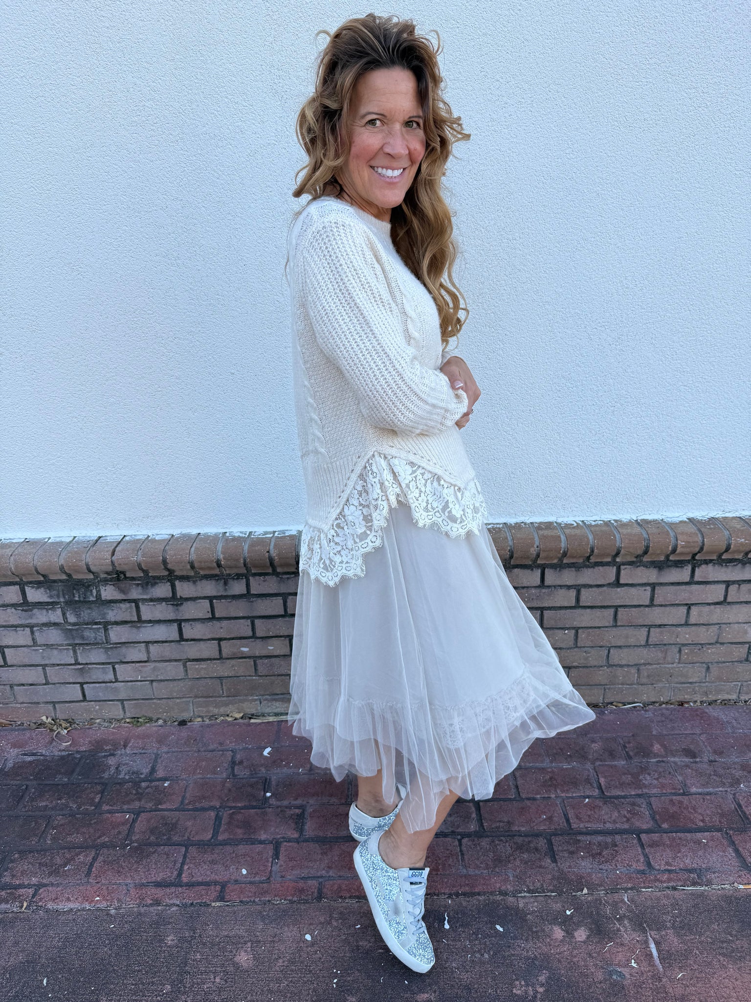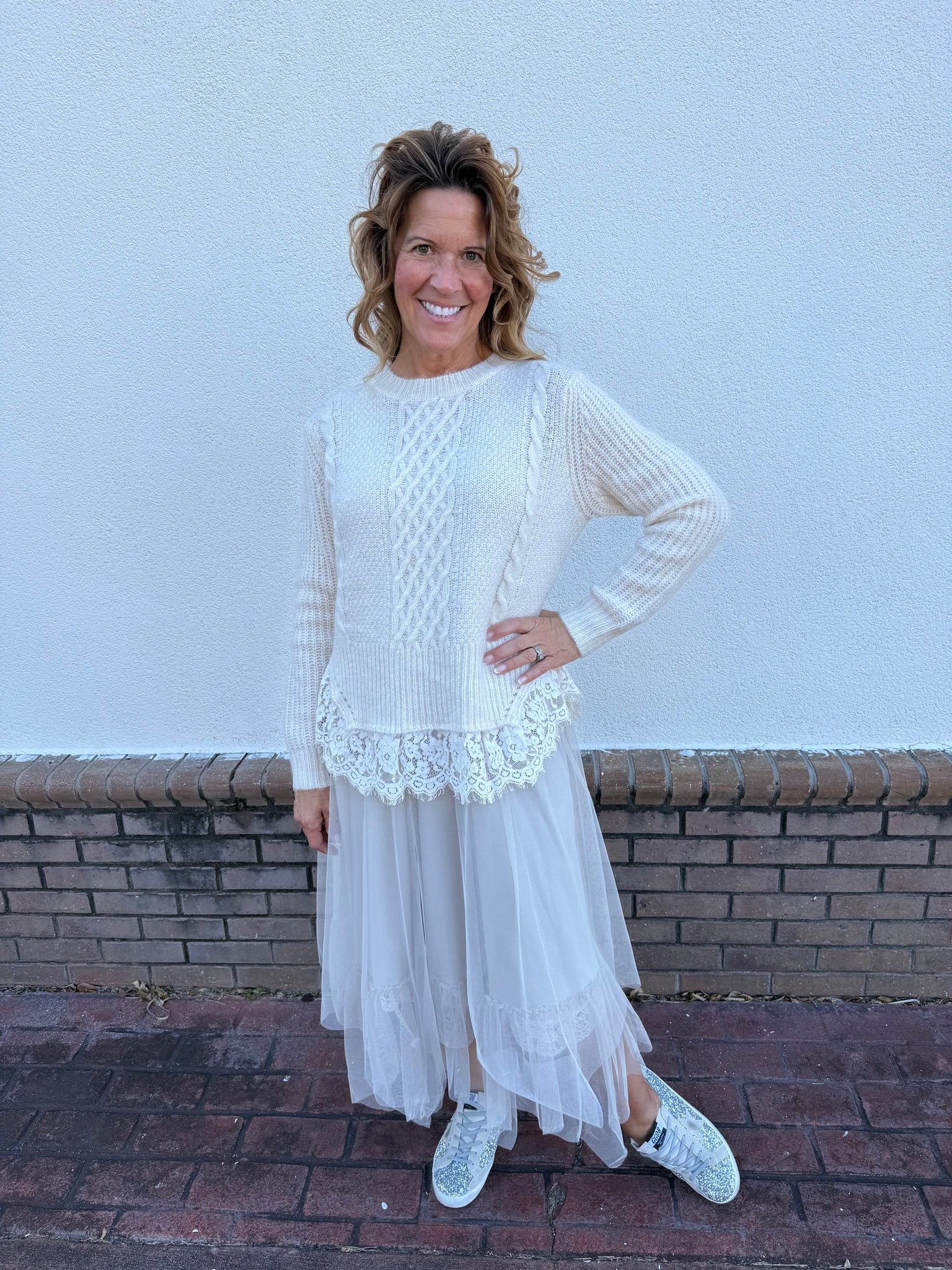 Soft, feminine, and effortlessly chic — this cozy cable knit sweater features a delicate lace hem for a layered look without the bulk.