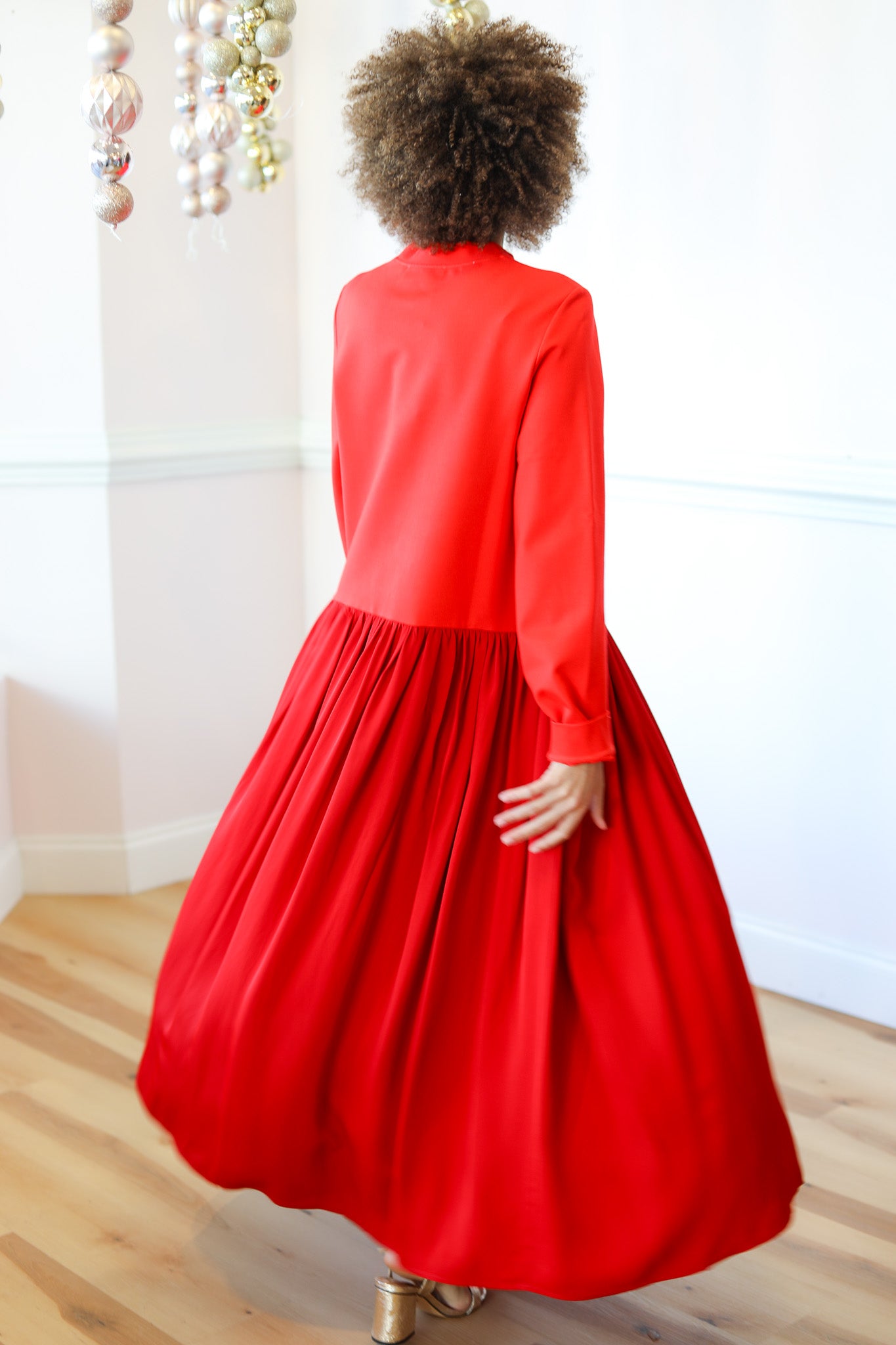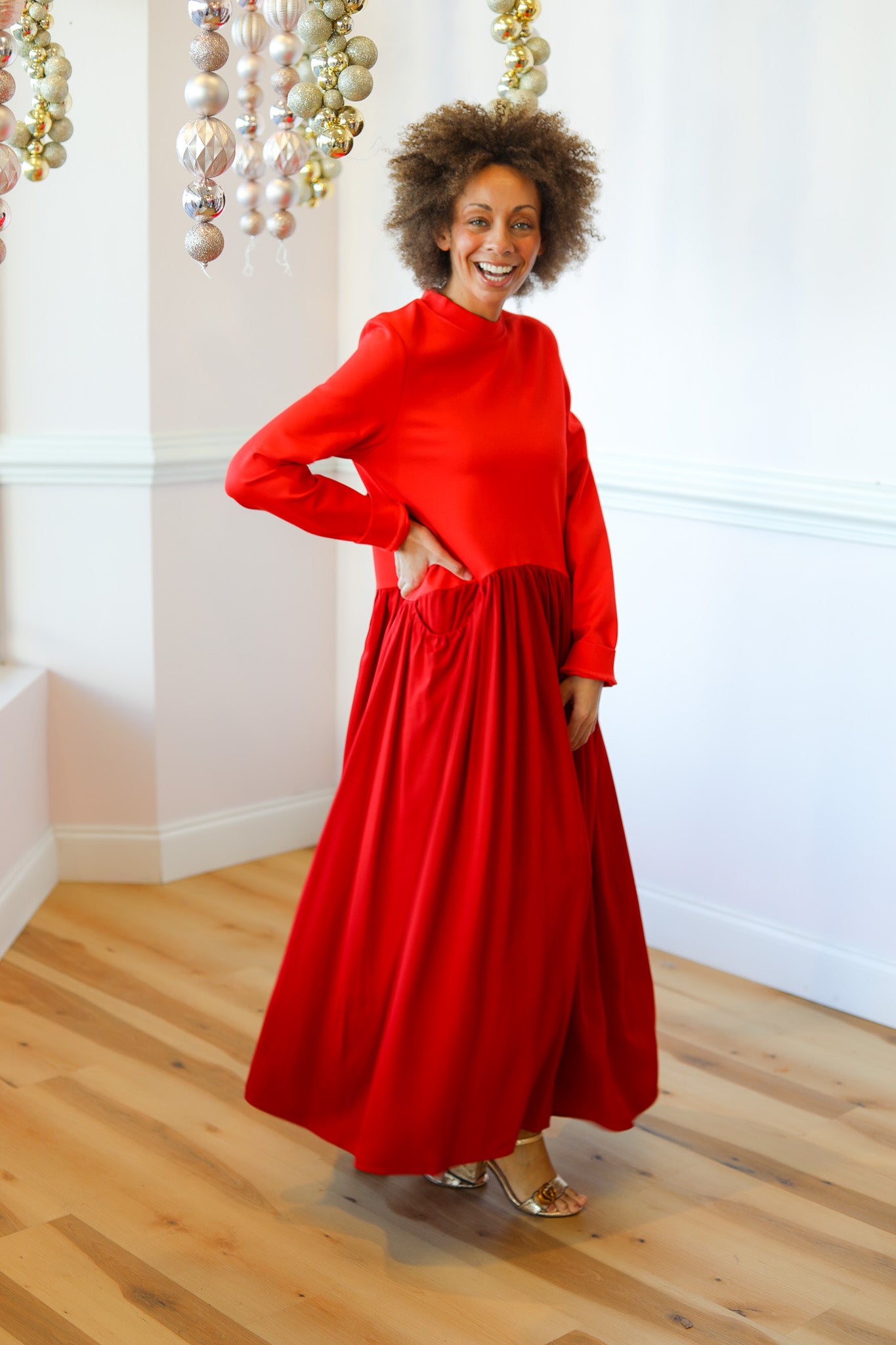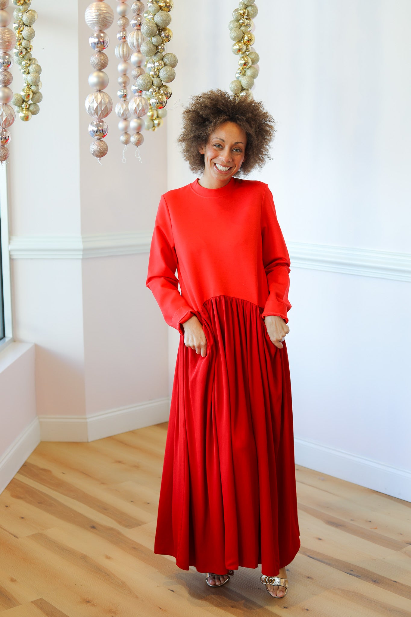 A relaxed-fit maxi dress designed with a soft knit bodice and a flowing pleated skirt for effortless, everyday elegance. Featuring long sleeves and functional front pockets, this dress offers a comfortable silhouette with beautiful movement—easy to dress up or down.