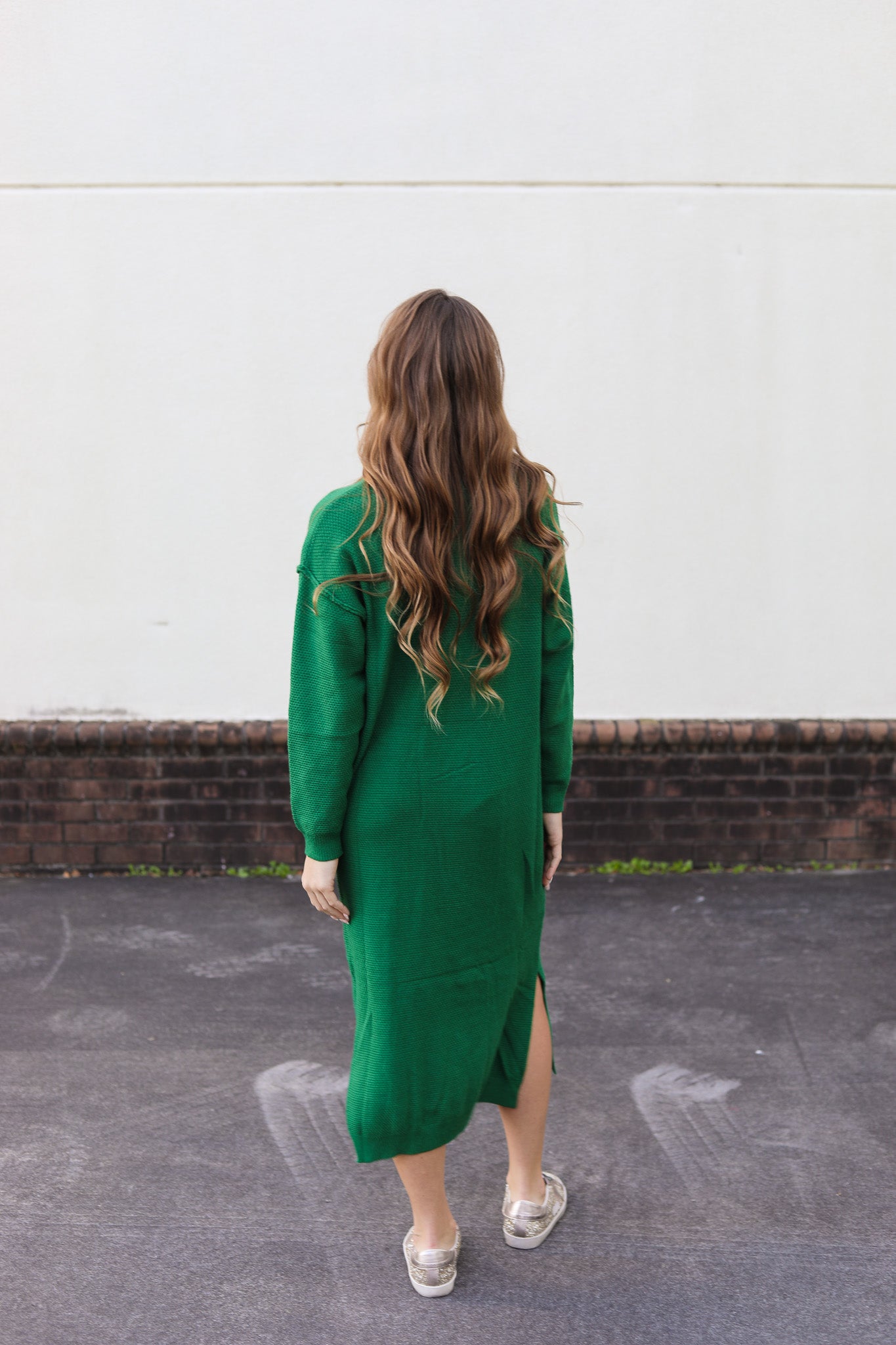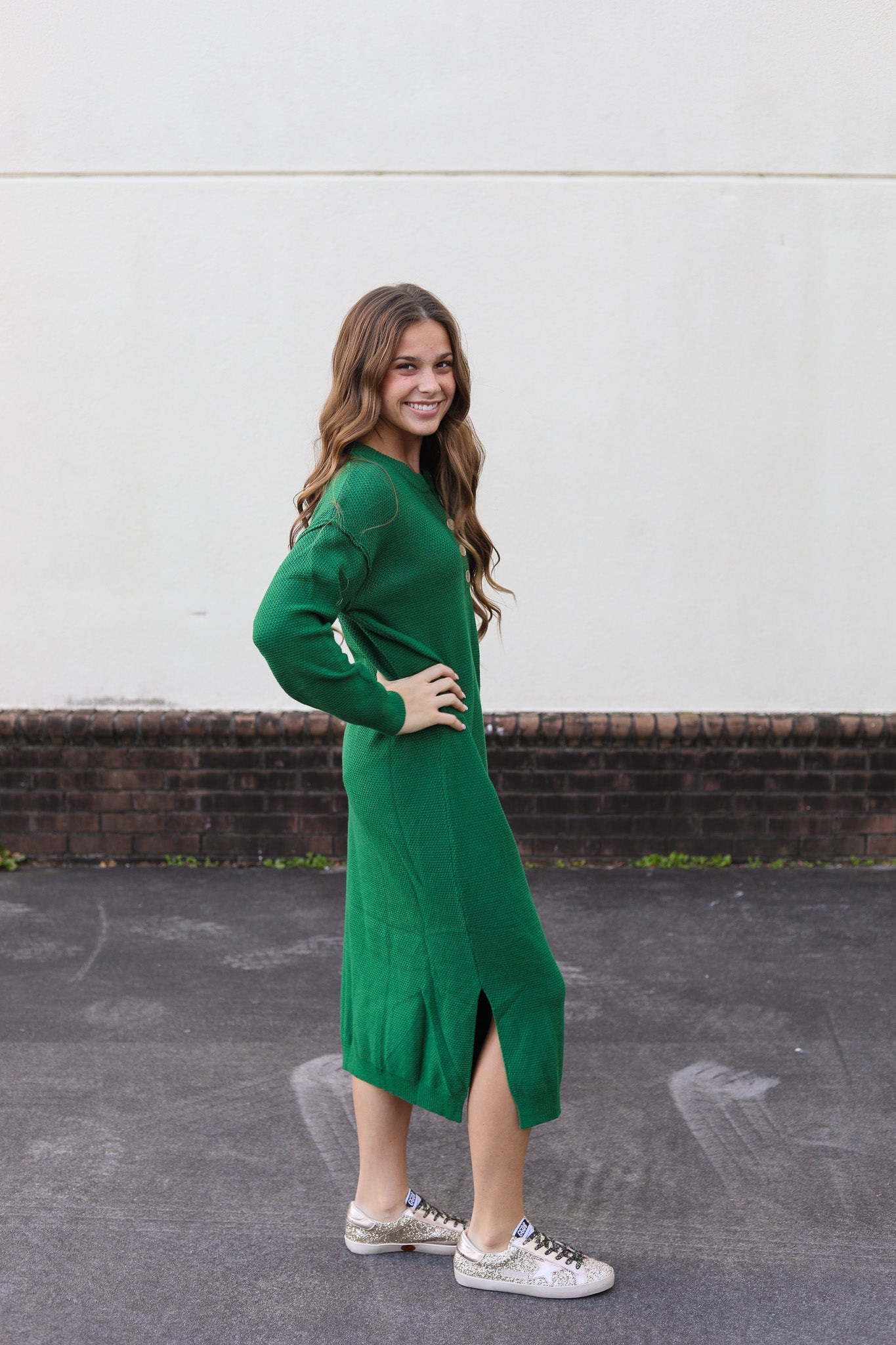 Cozy meets chic in this waffle-knit midi sweater dress. Designed with a relaxed, slightly oversized fit, it features a ribbed crew neckline, drop shoulders, and a front button placket for an effortless touch of style.