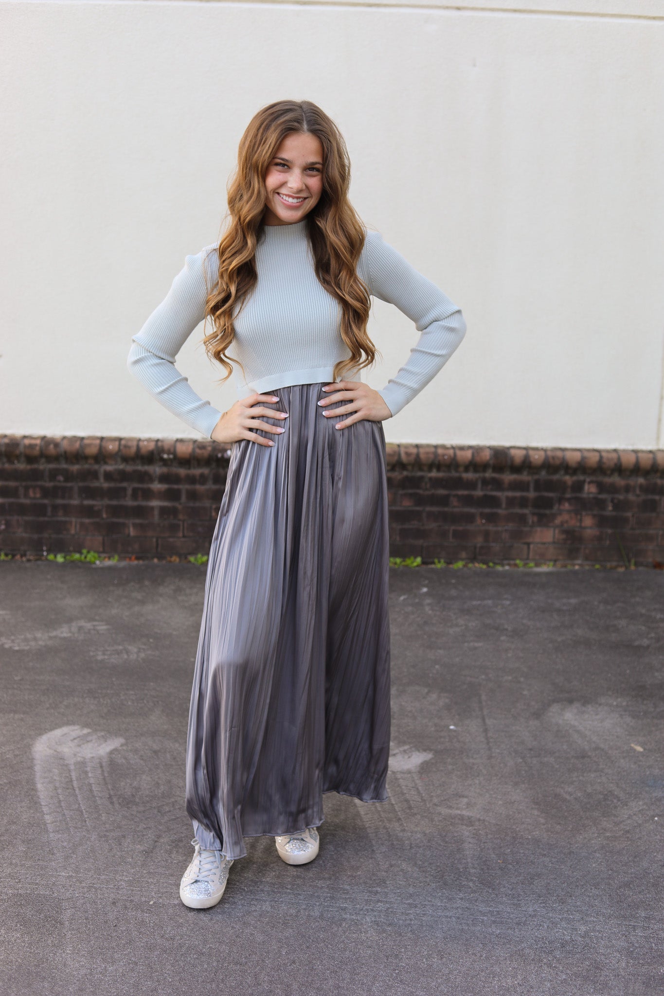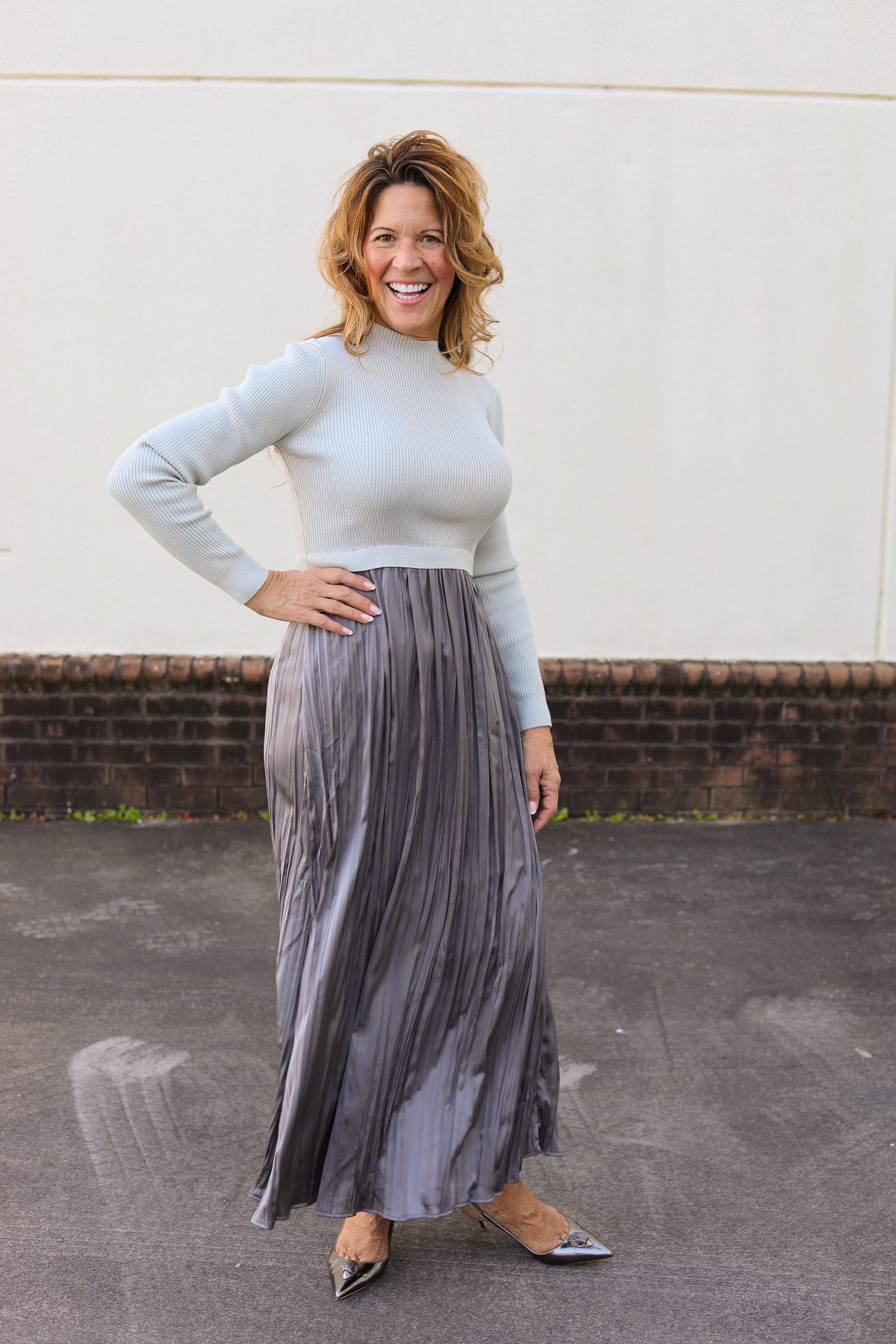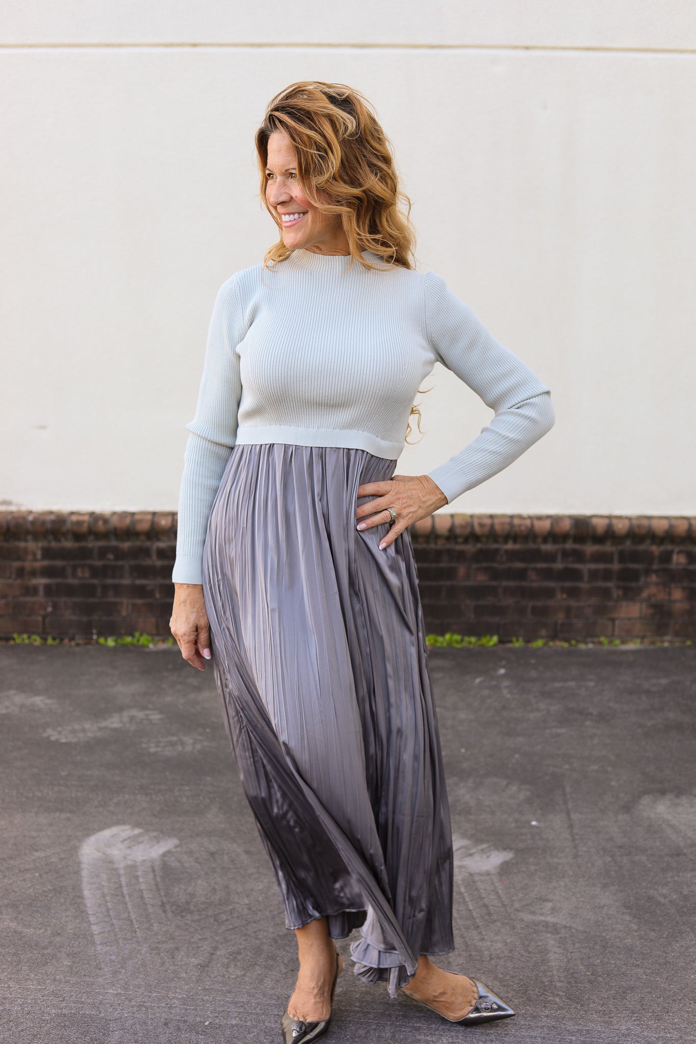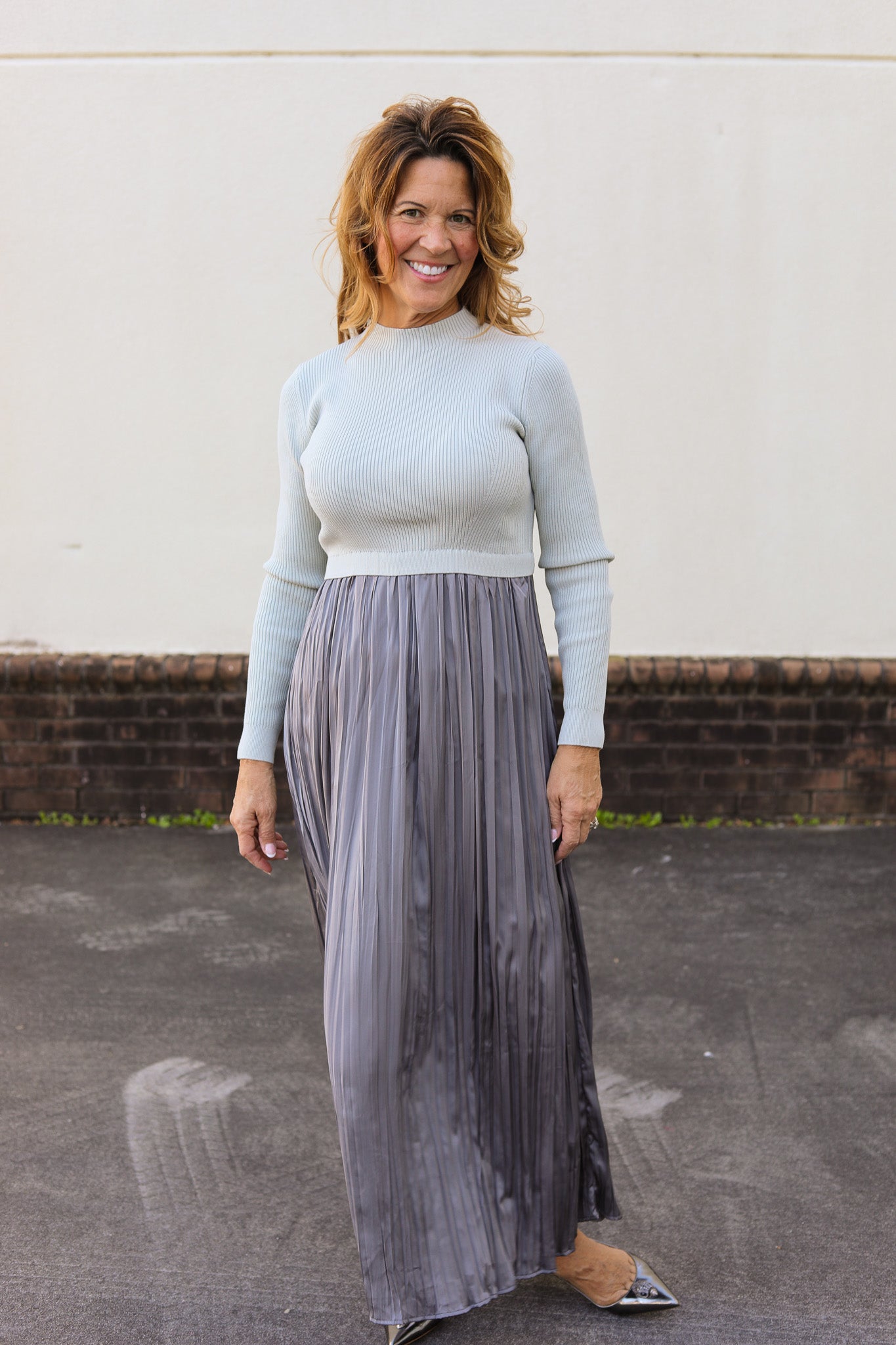 Sophisticated yet cozy, this A-line maxi dress features a soft knit bodice with long sleeves and a flowy pleated skirt for an effortlessly polished look. The mock neckline adds a touch of refinement, making it perfect for holiday gatherings or winter evenings out.