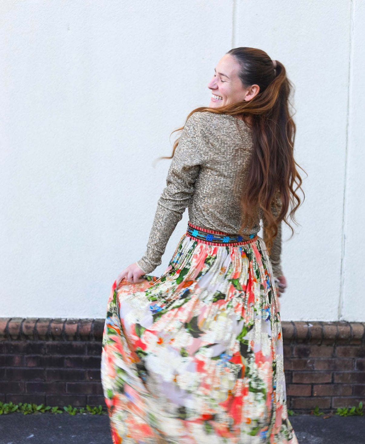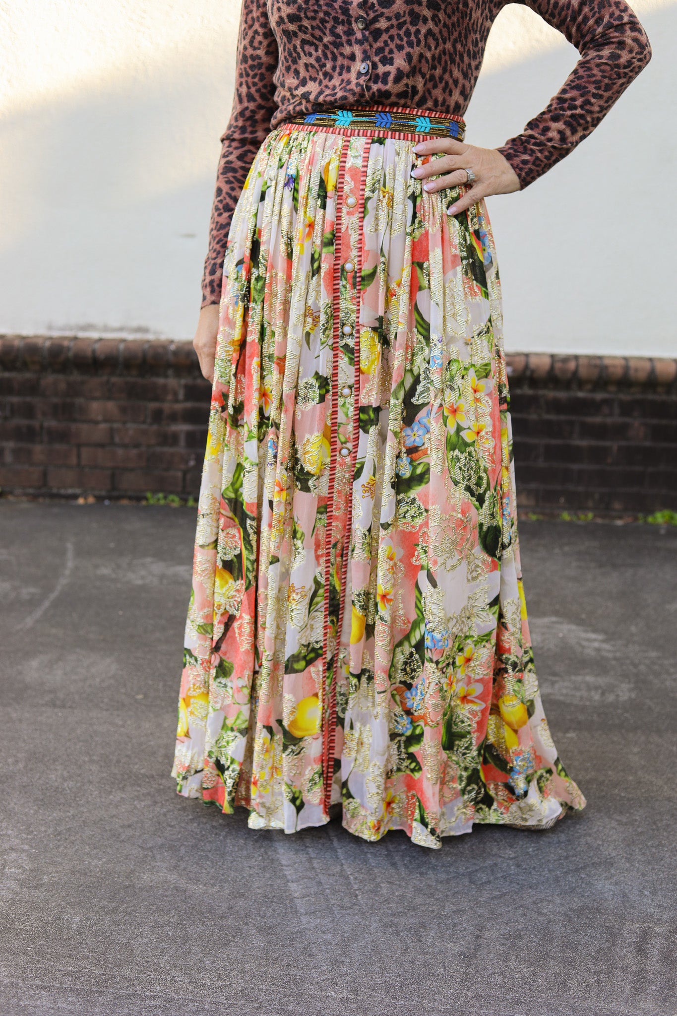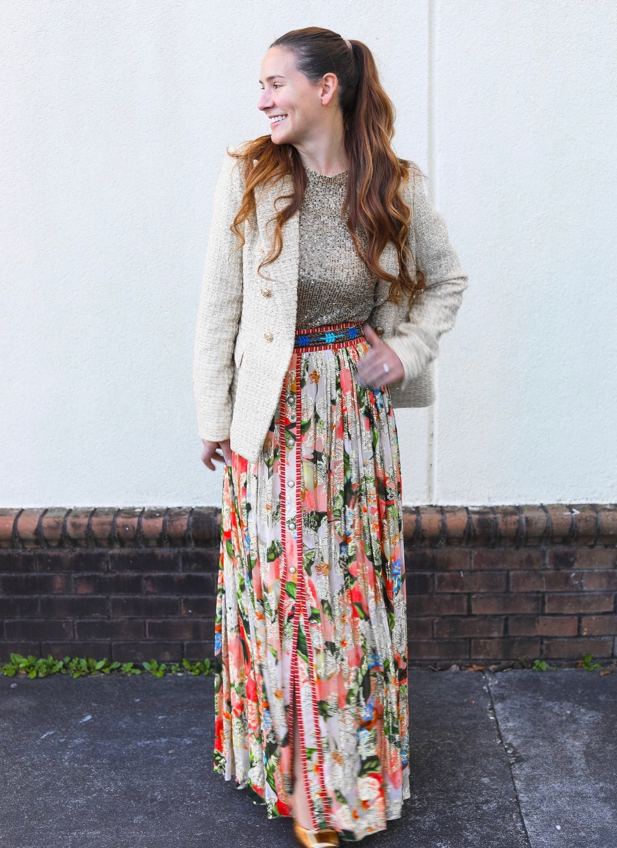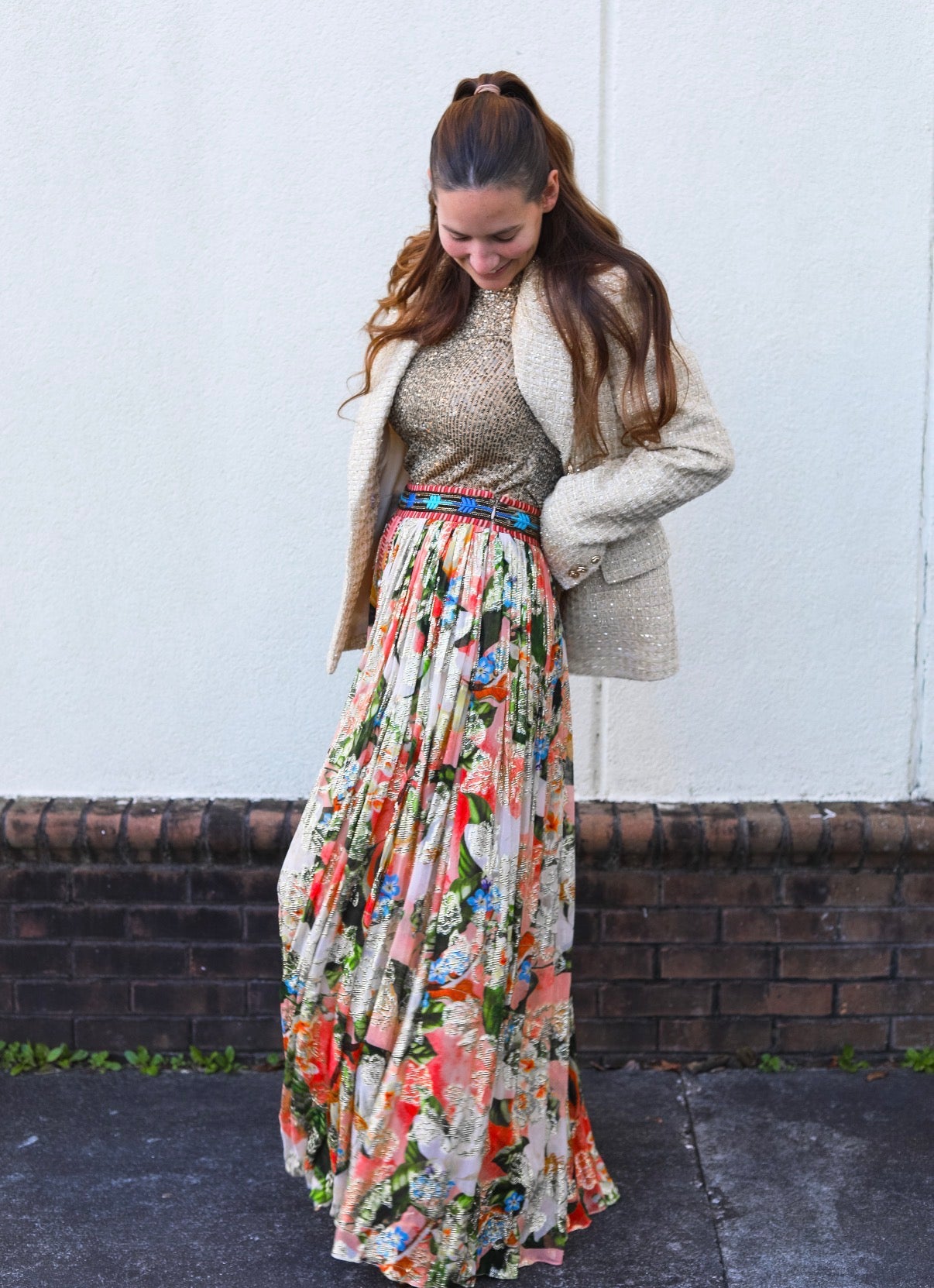 Turn heads in the Hailey Skirt, a flowy, floral maxi crafted from shimmer-threaded viscose lurex georgette. With a flattering front slit and vibrant spring hues, this statement piece adds sparkle and sophistication to any look. Features a beaded band waist with a side zipper.