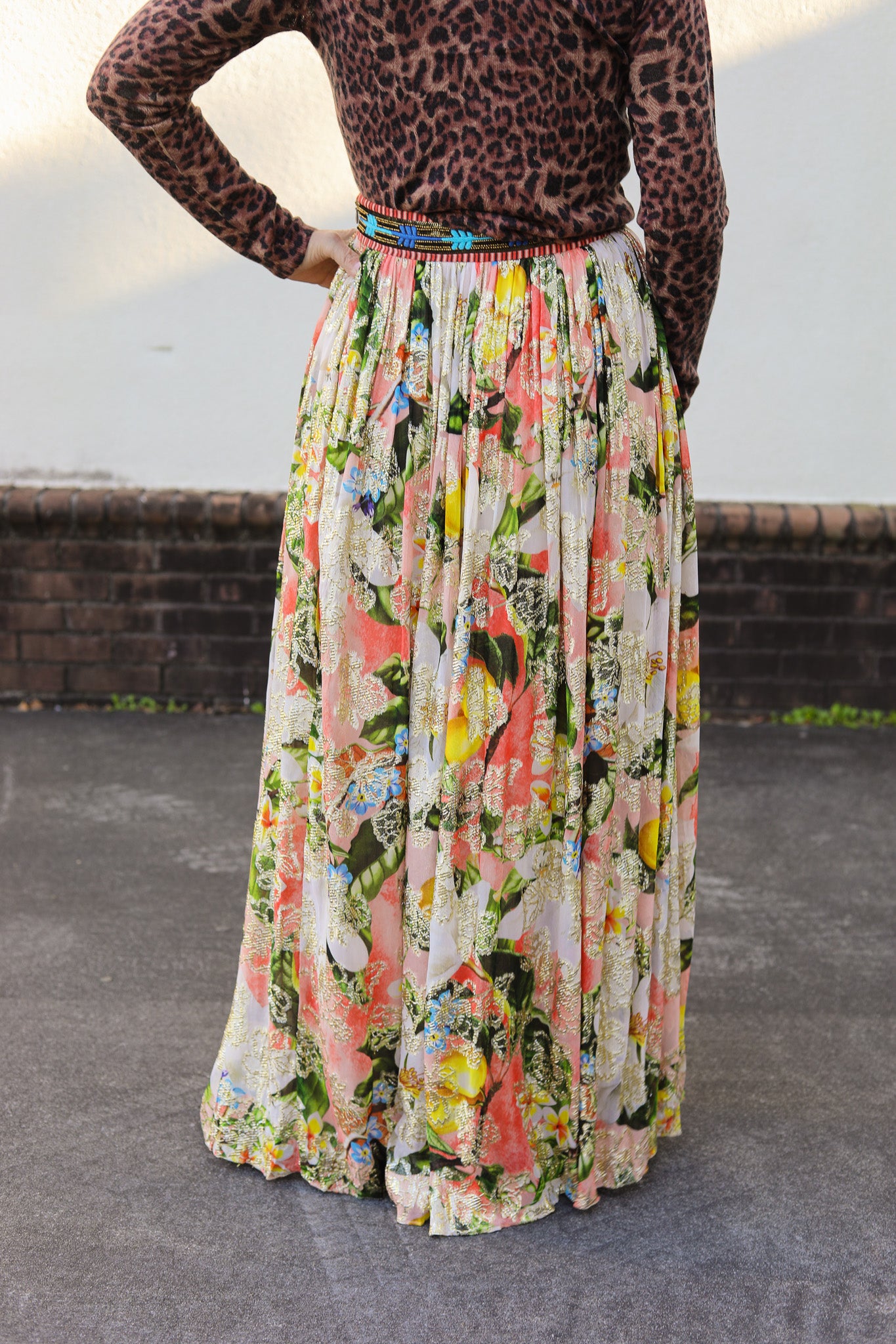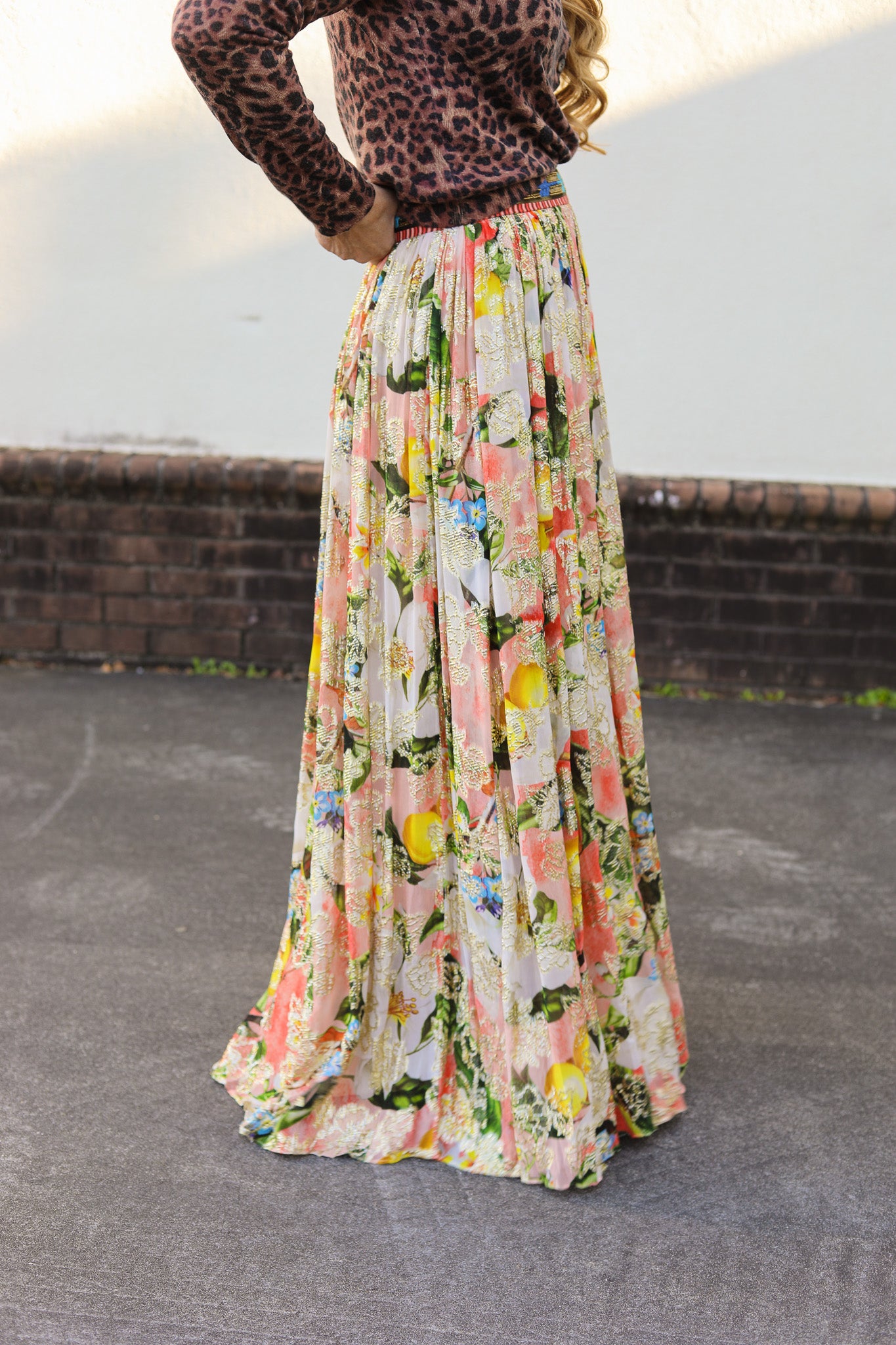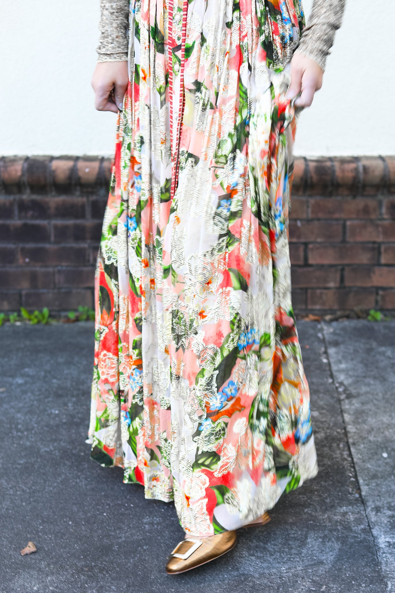 Turn heads in the Hailey Skirt, a flowy, floral maxi crafted from shimmer-threaded viscose lurex georgette. With a flattering front slit and vibrant spring hues, this statement piece adds sparkle and sophistication to any look. Features a beaded band waist with a side zipper.