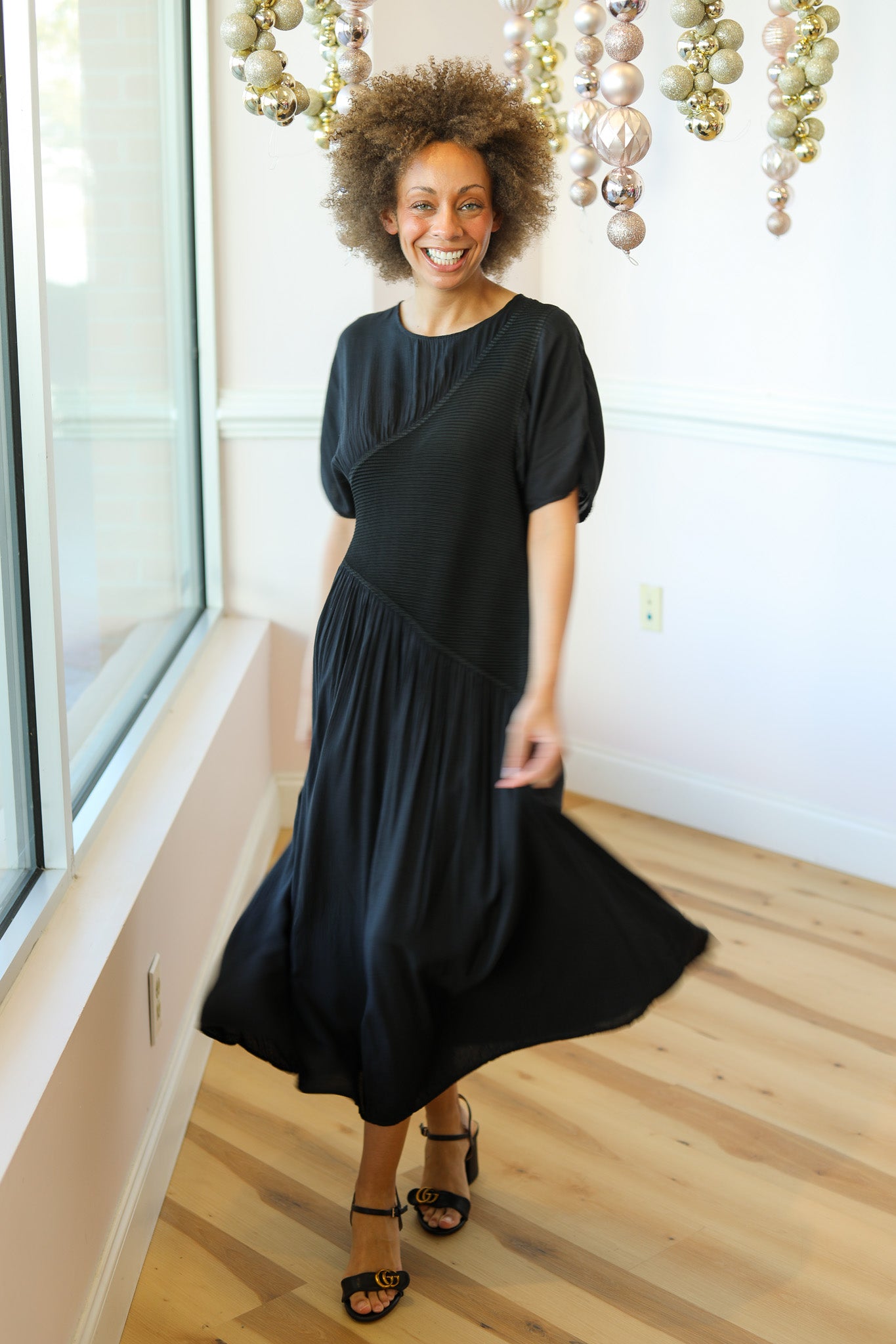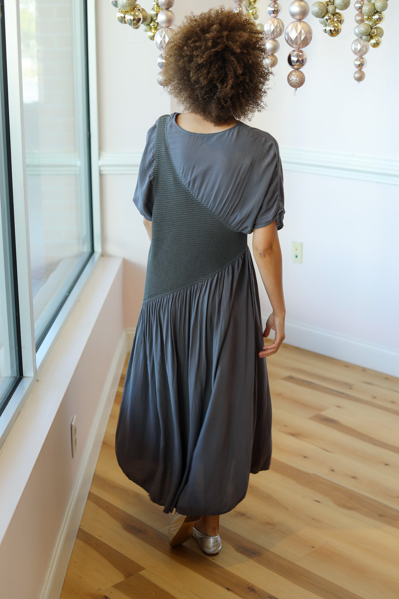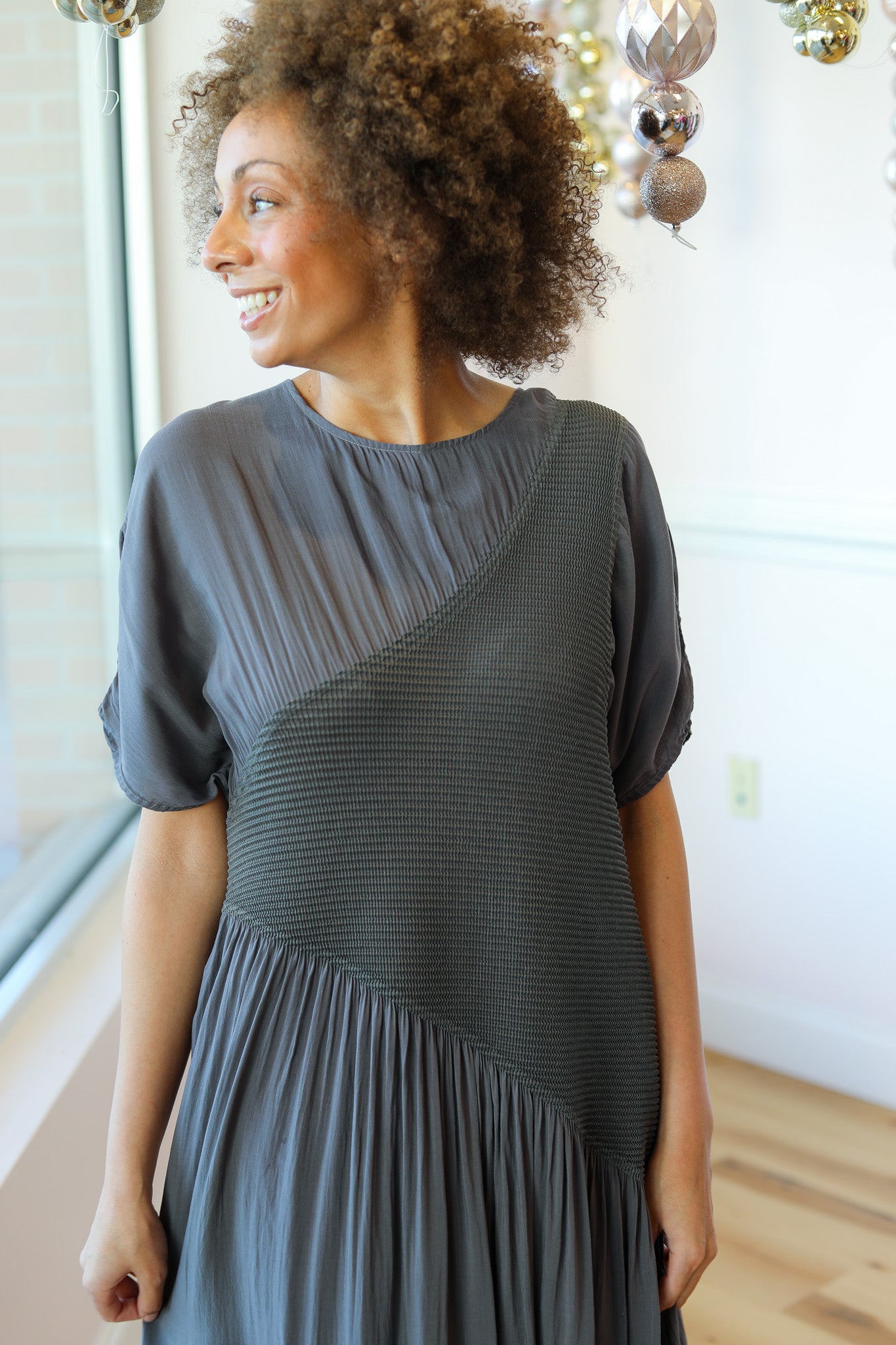 A relaxed-fit midi dress featuring soft pleated detailing across the bodice and an asymmetrical seam that creates beautiful movement. Designed with an easy silhouette and subtle texture, this piece blends comfort and quiet sophistication.