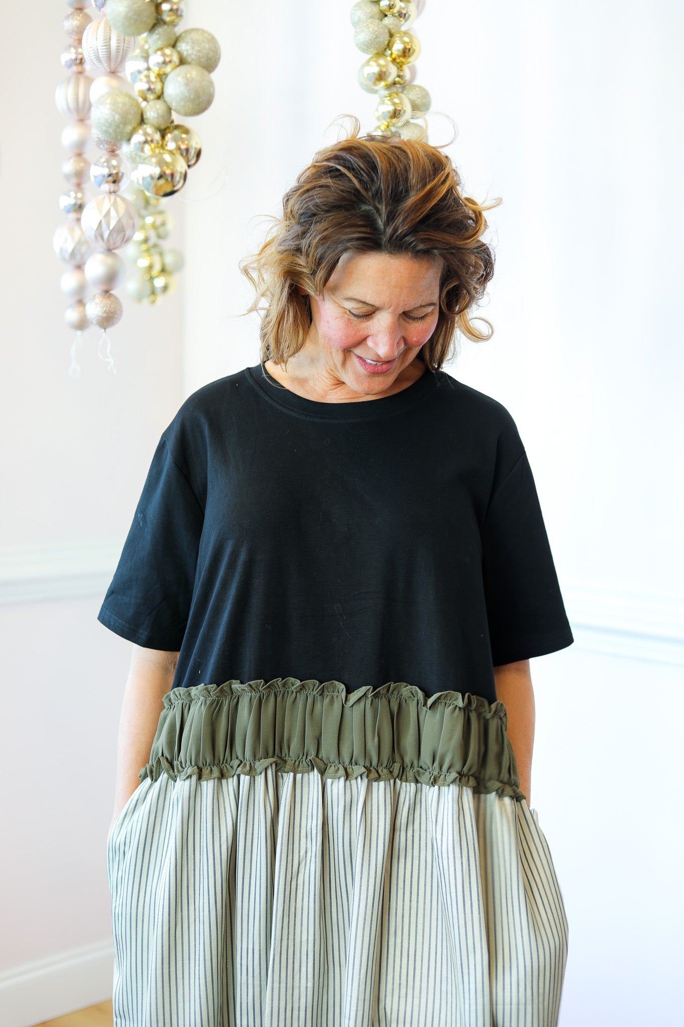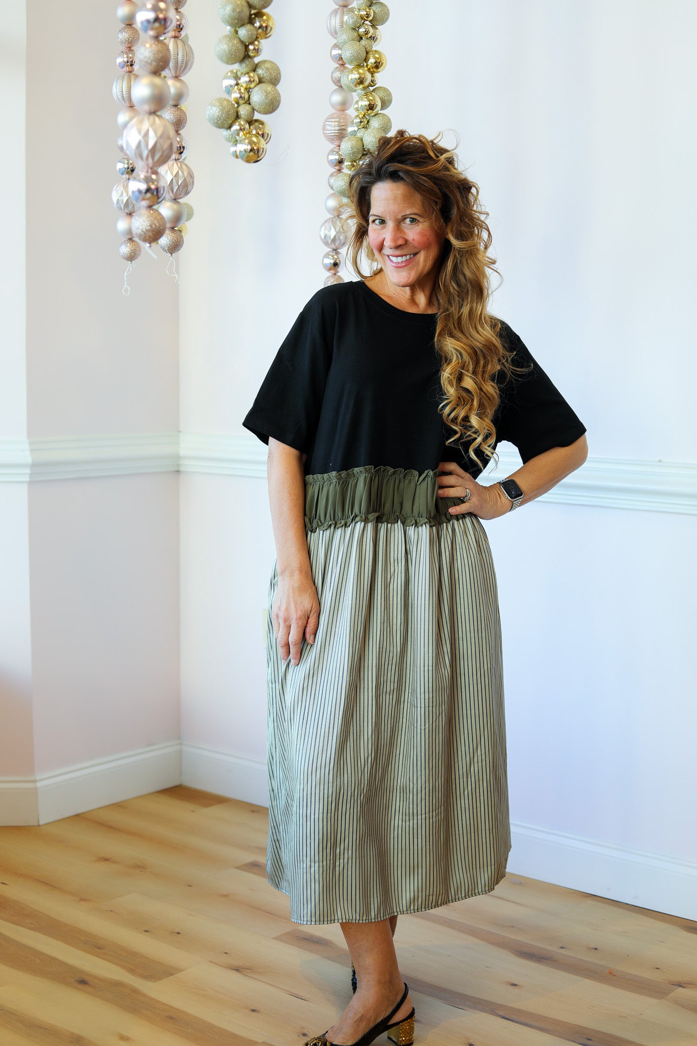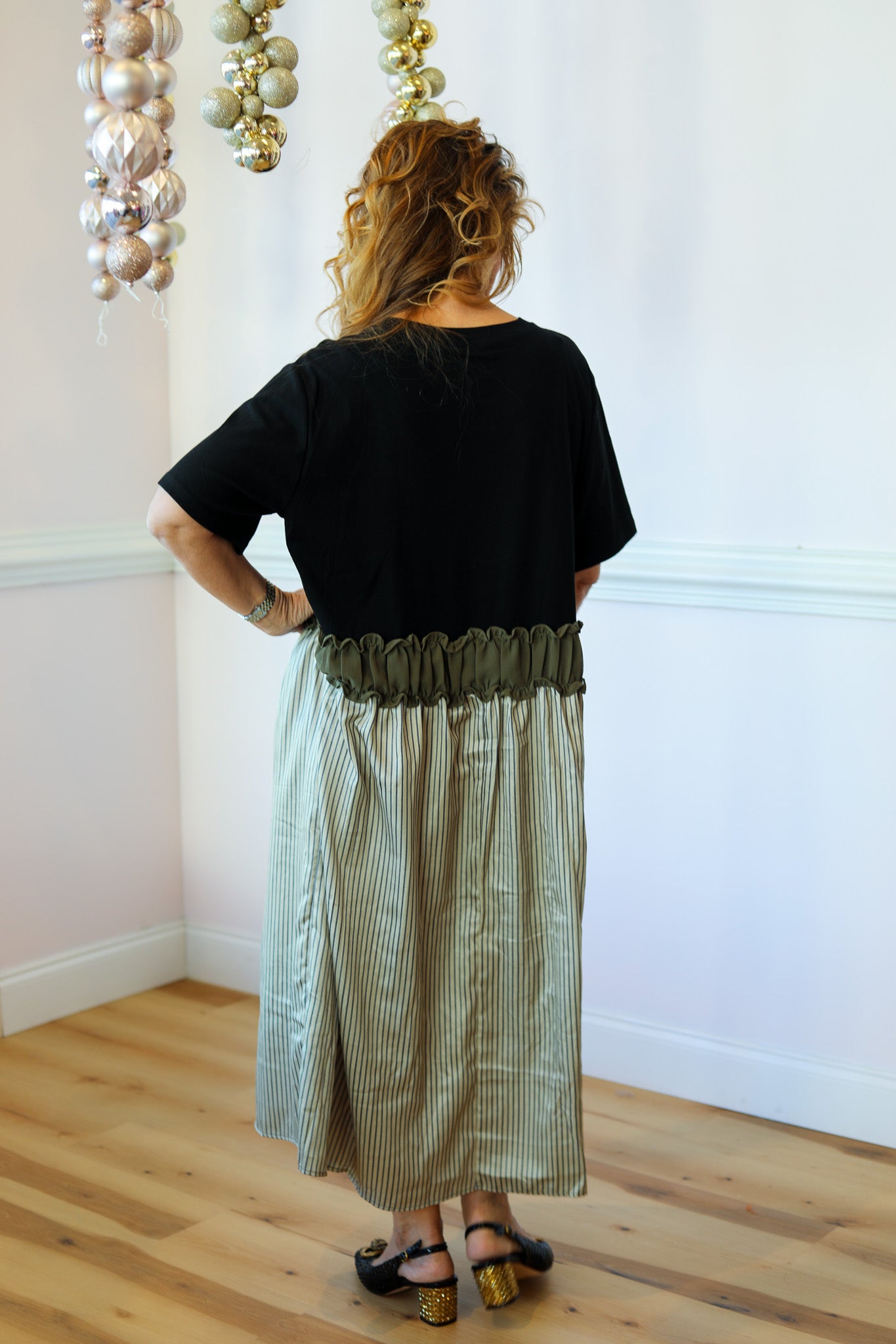 An effortlessly relaxed maxi dress featuring a soft knit bodice and a flowing striped silky skirt with beautiful movement. Designed with a gathered waist detail for subtle shape and an easy silhouette, this piece blends comfort and modern charm.