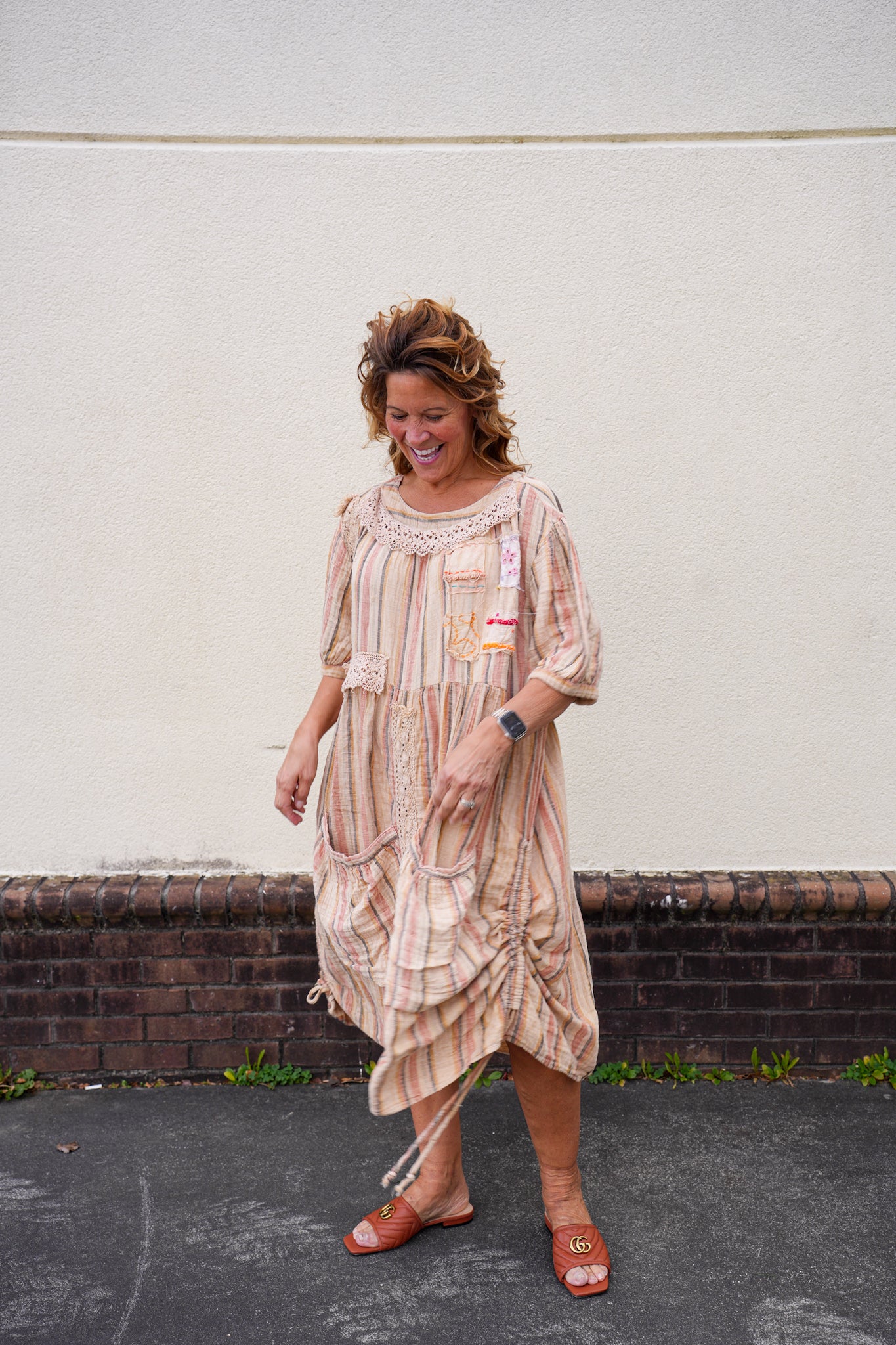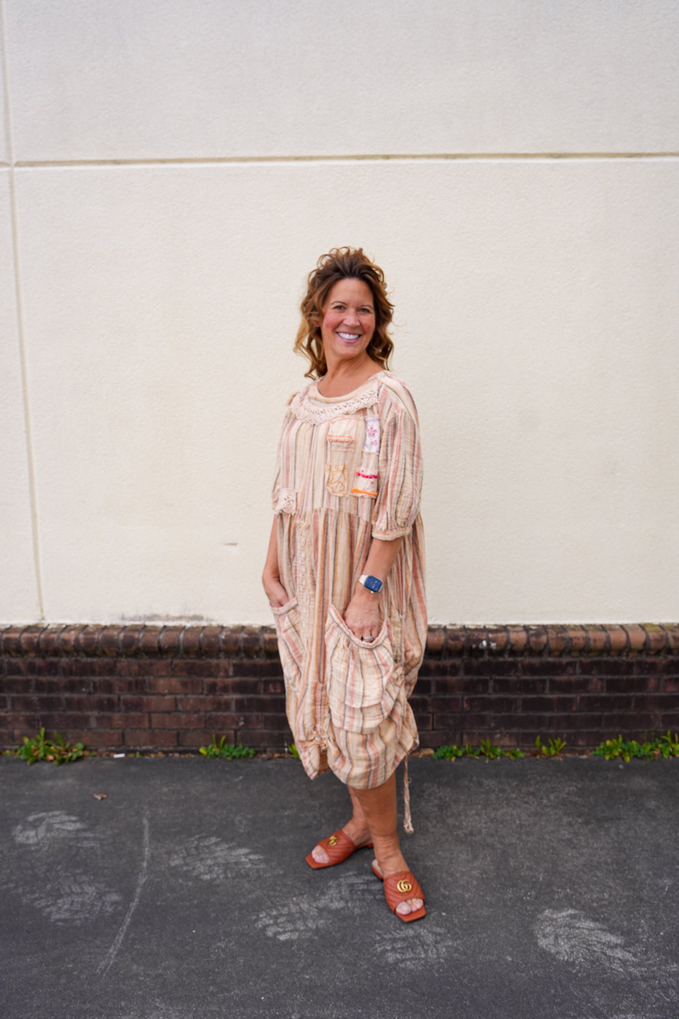 Full of character and handcrafted charm, this patchwork stripe boho dress features a relaxed silhouette with soft gathers, lace trim, and mixed-pattern detailing throughout. The lightweight fabric and easy fit make it comfortable for everyday wear, while the pockets and subtle drawstring hem add both function and visual interest. A true statement piece that feels collected, soulful, and effortlessly worn-in.