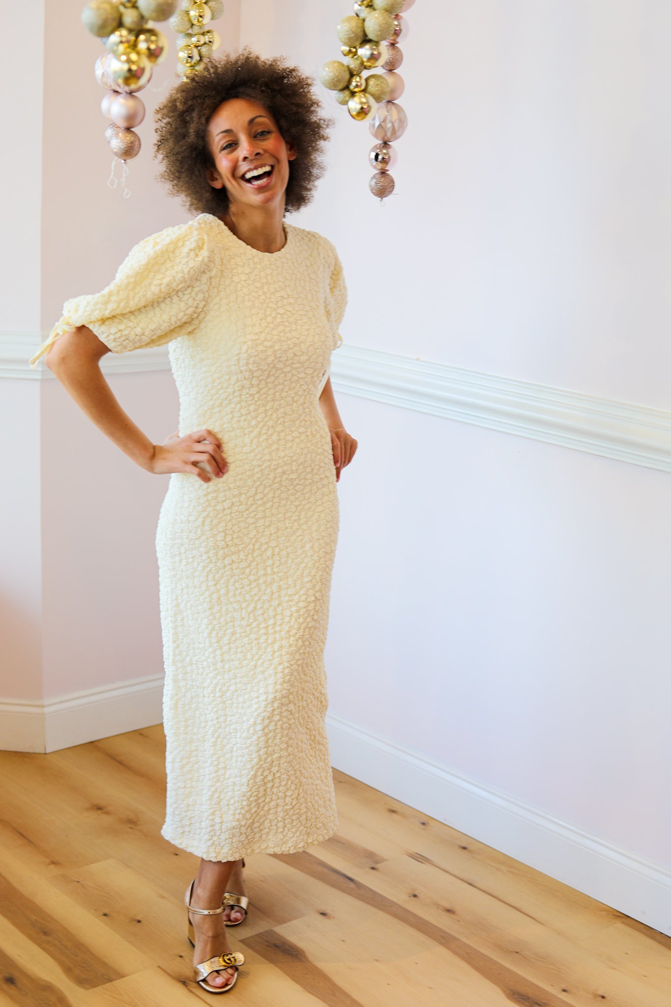 - A-line textured dress with puff sleeves that tie in a bow at the elbow.