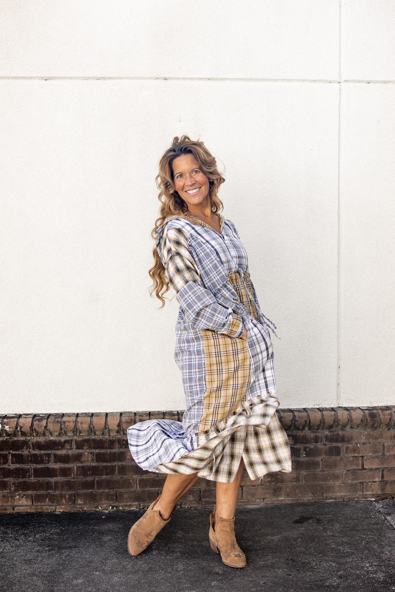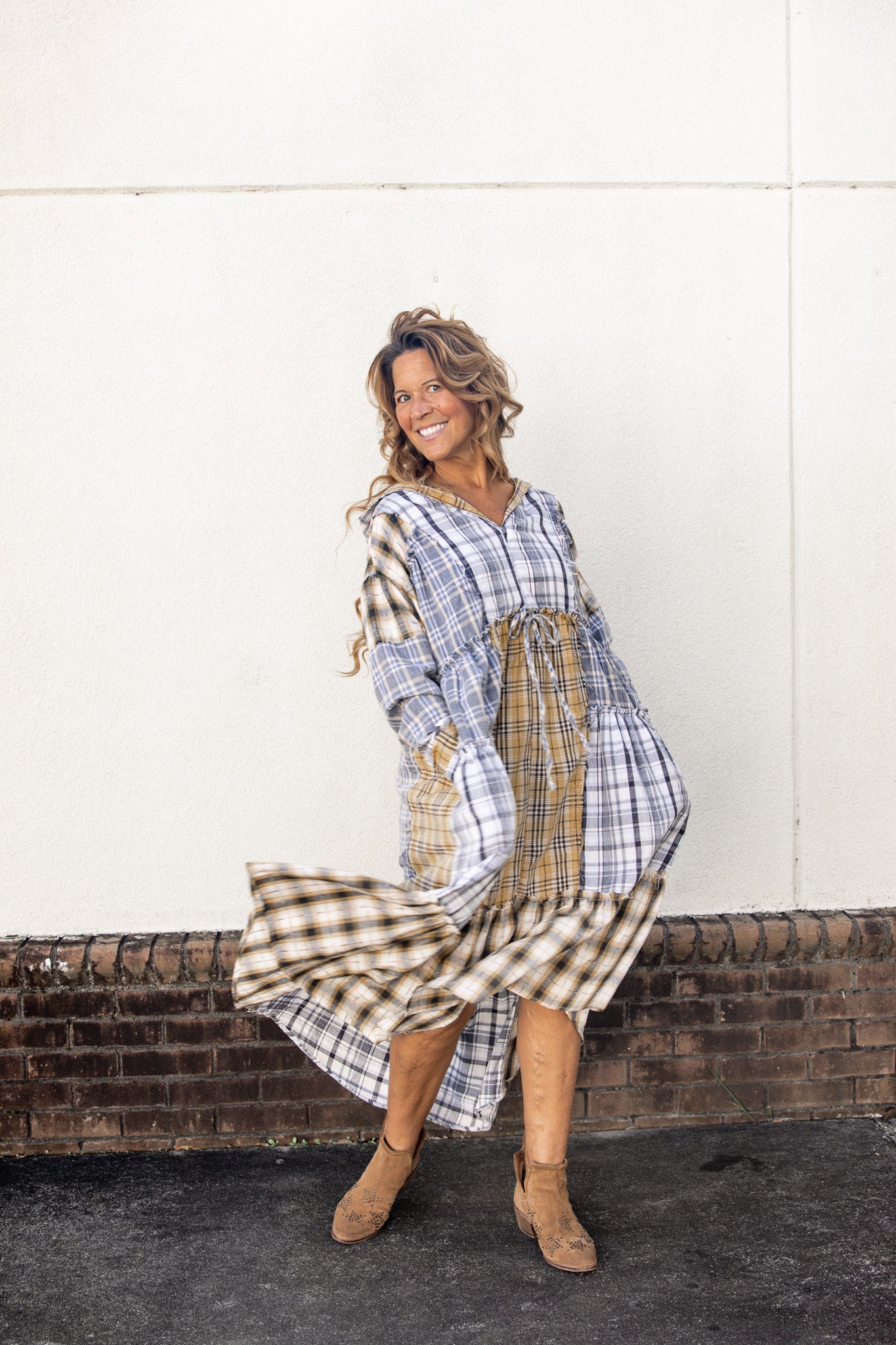 This long sleeve dress features a mixed plaid patchwork design with a mineral wash finish, relaxed fit, and functional hood. Side pockets and tie-front detail add both style and practicality.