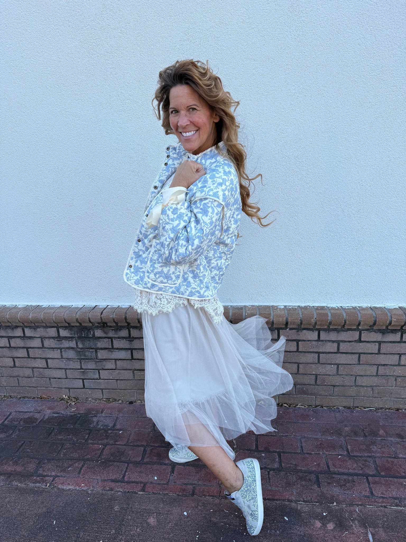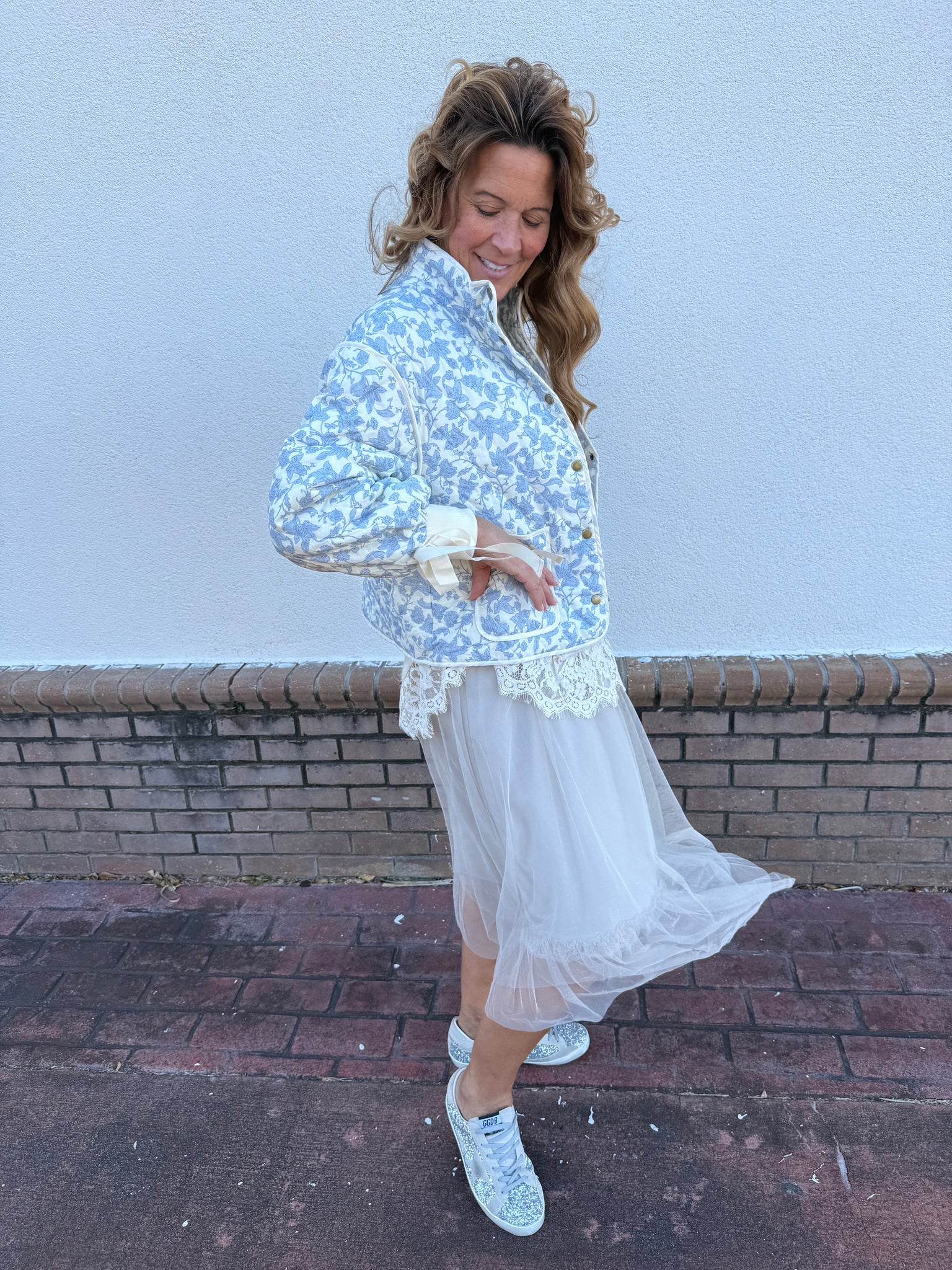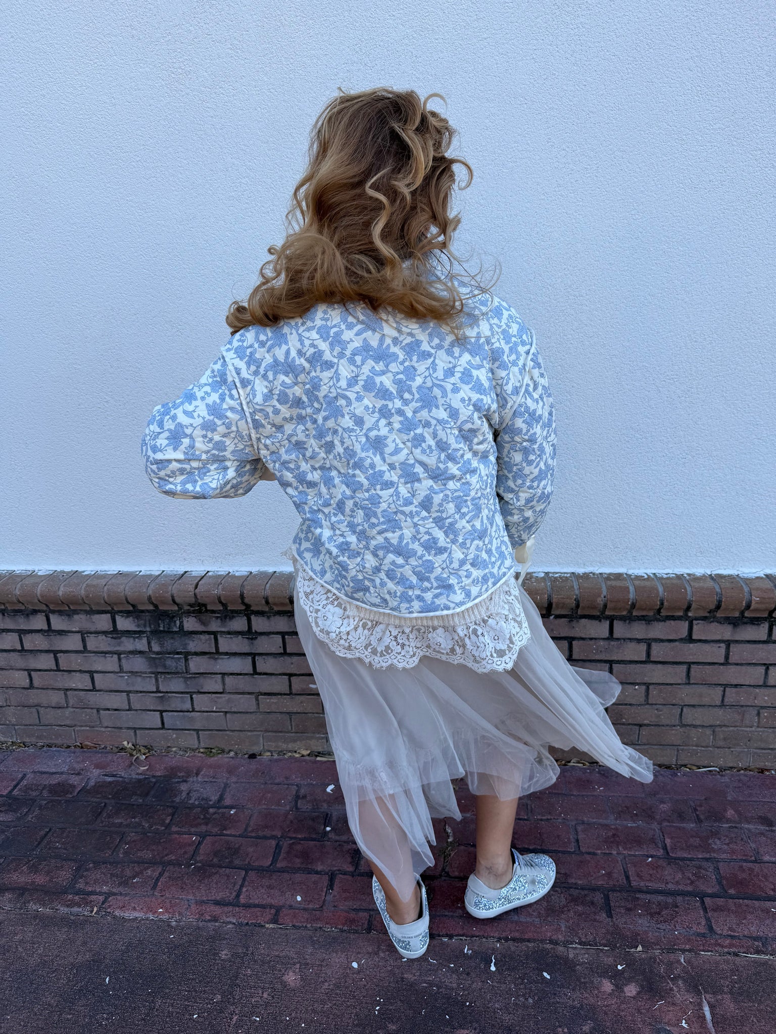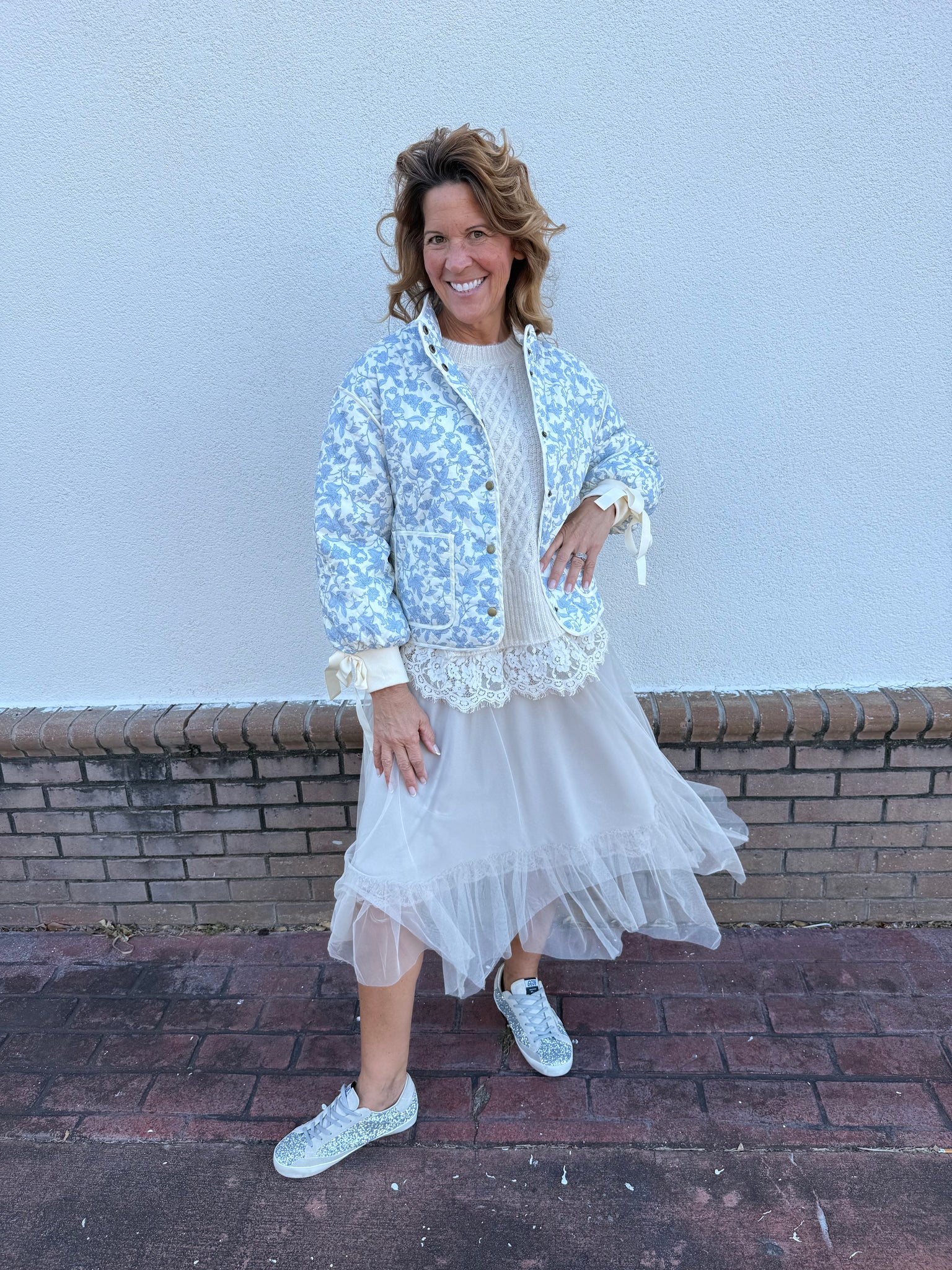 A feminine twist on cozy! This quilted floral jacket features balloon sleeves, contrast trim, and sweet ribbon ties at the ribbed cuffs for a romantic finish. Lightweight yet warm — perfect for layering through fall and winter.