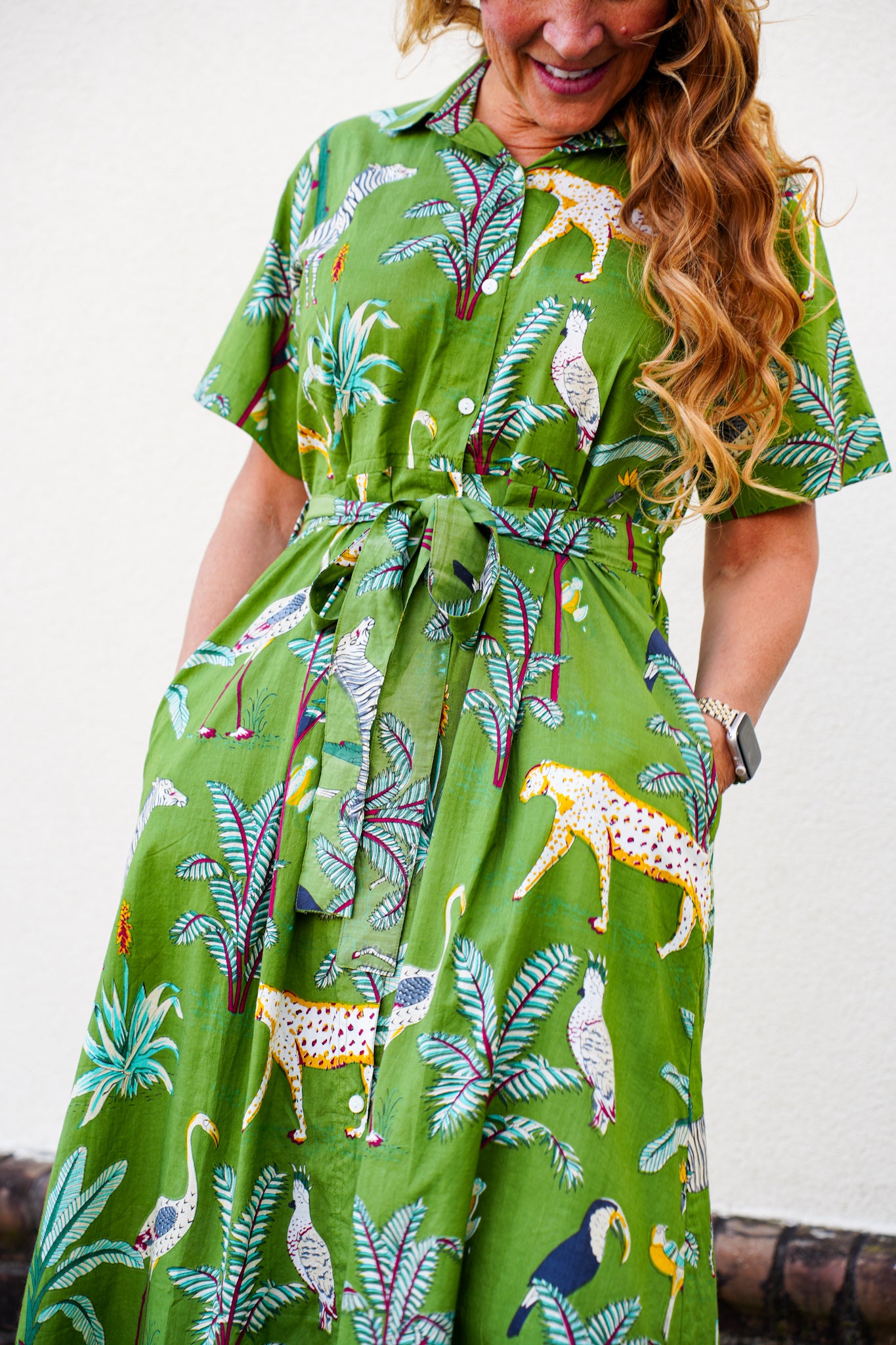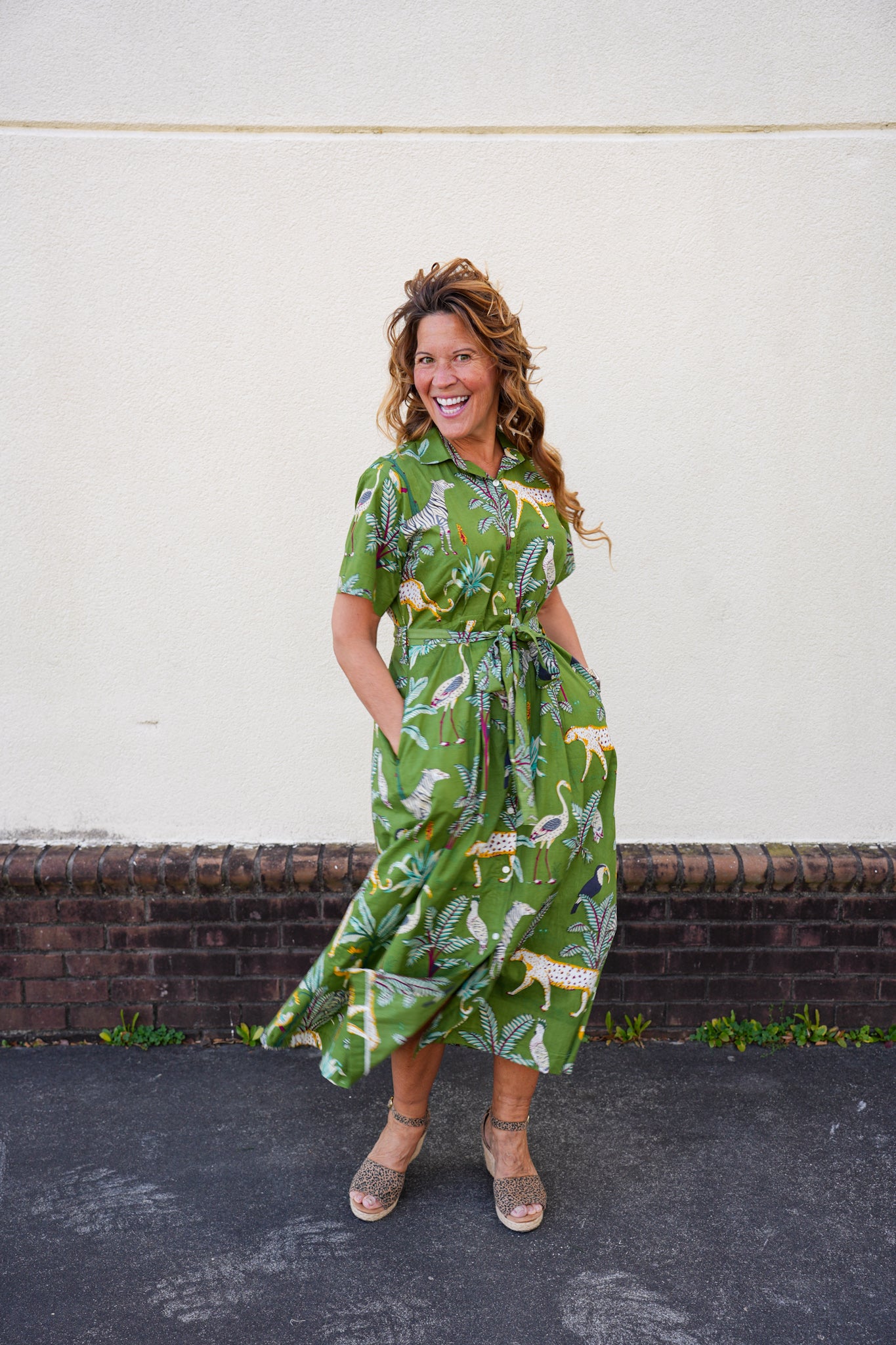 A statement piece with effortless bohemian charm, this hand block-printed maxi dress is crafted from breathable organic cotton for a soft, lightweight feel. Featuring a relaxed, flowy silhouette with tiered detailing, it moves beautifully while offering all-day comfort. The rich green base and whimsical animal print make this dress truly one-of-a-kind—perfect for casual days, travel, or styled up with boots and layers for a standout look.