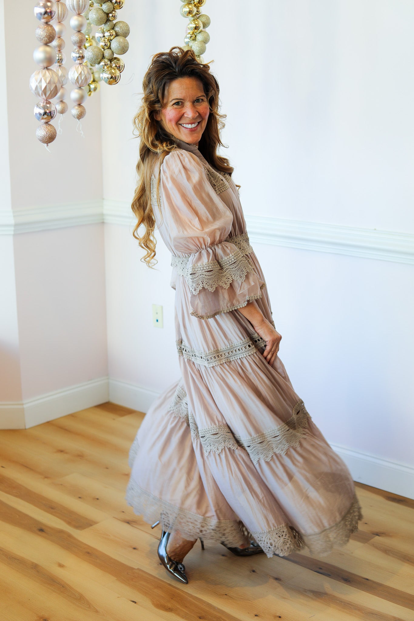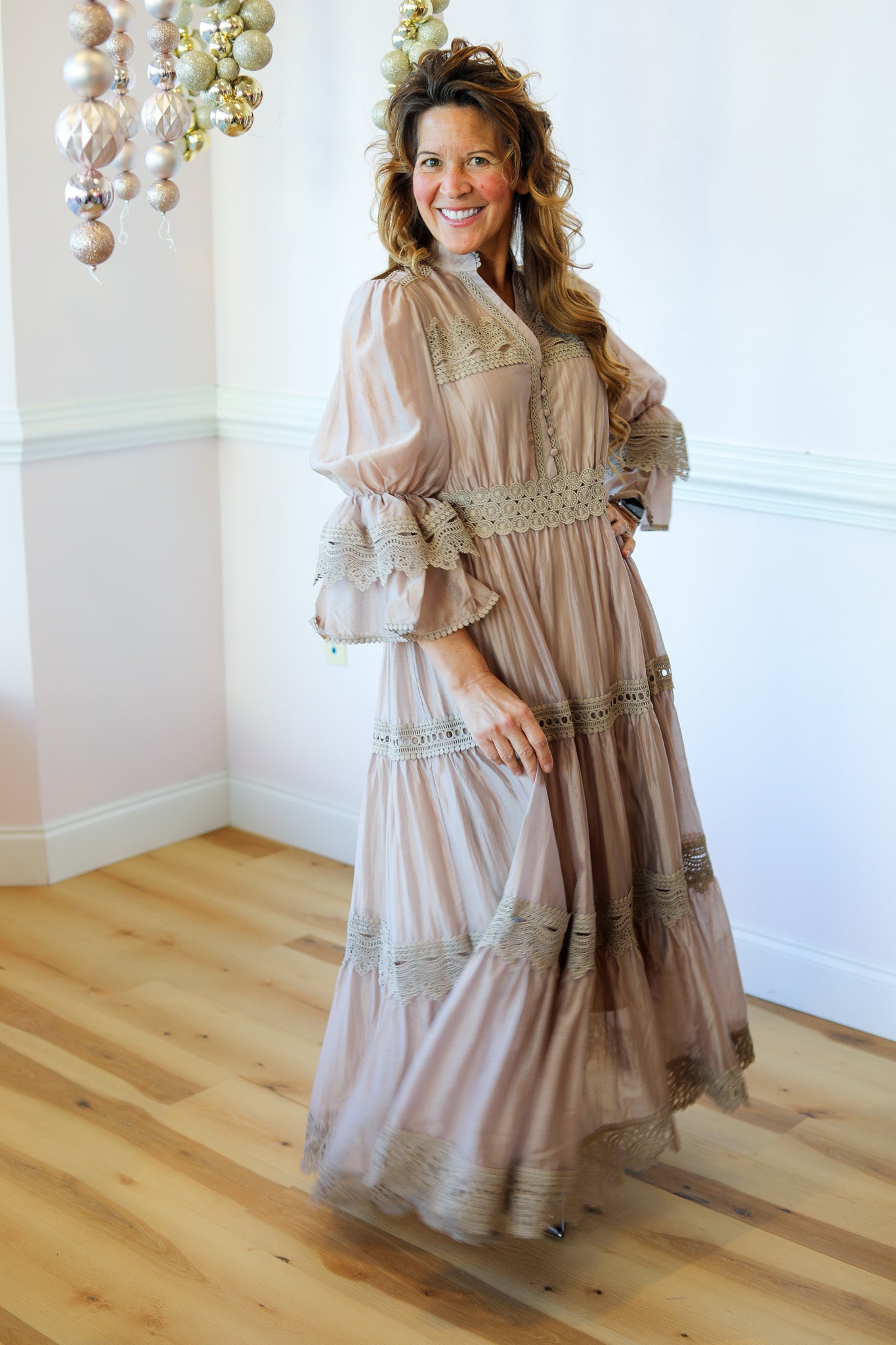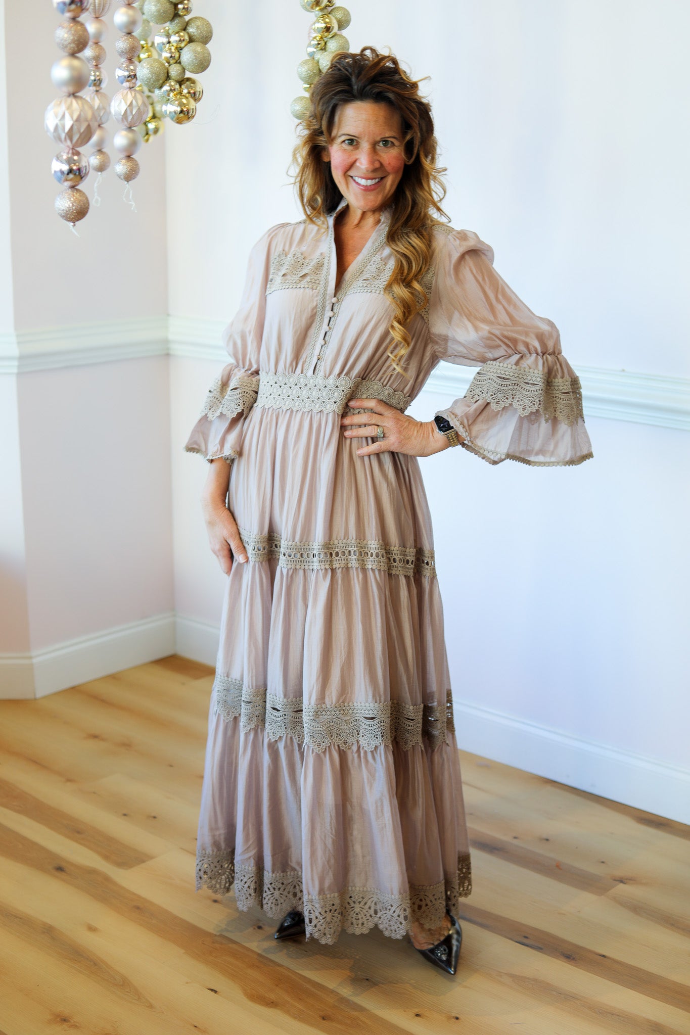 A romantic tiered maxi dress designed with delicate lace trim, soft gathered layers and tiers.