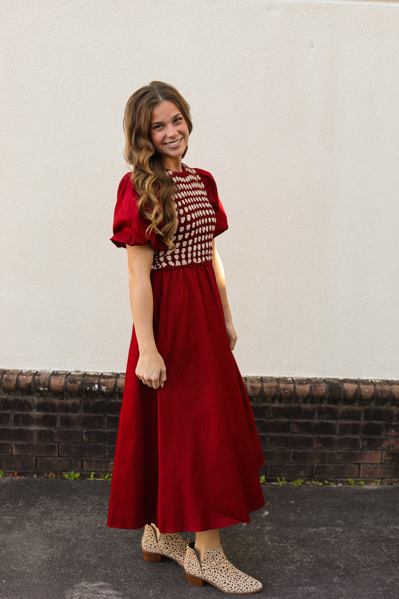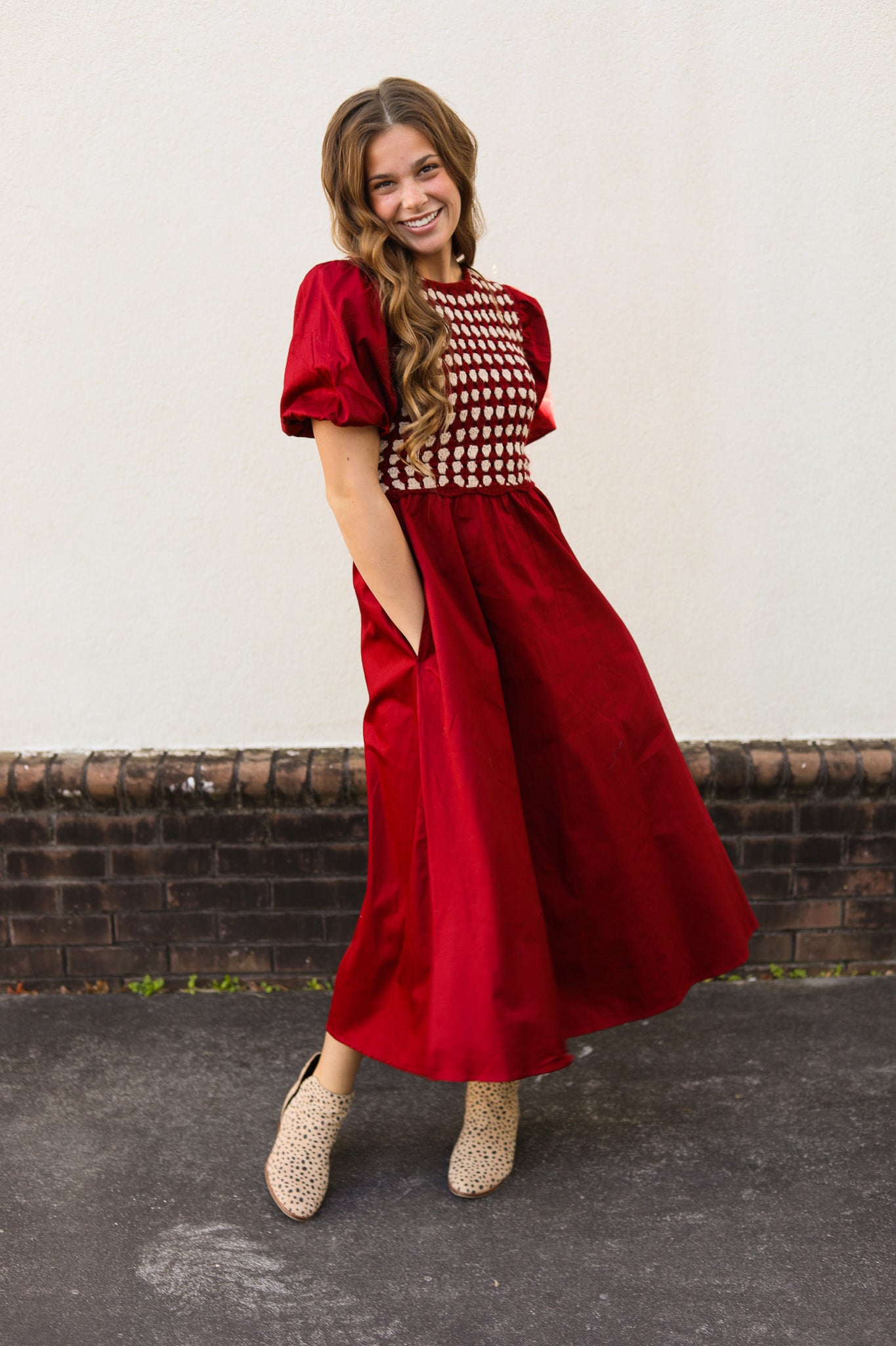Classic red midi dress featuring an A-line silhouette, bubble sleeves, and side seam pockets. Comes with a fully detachable vest, allowing you to wear it with or without for two looks in one. Designed with a knit bodice, woven sleeves, and skirt for structure and comfort.