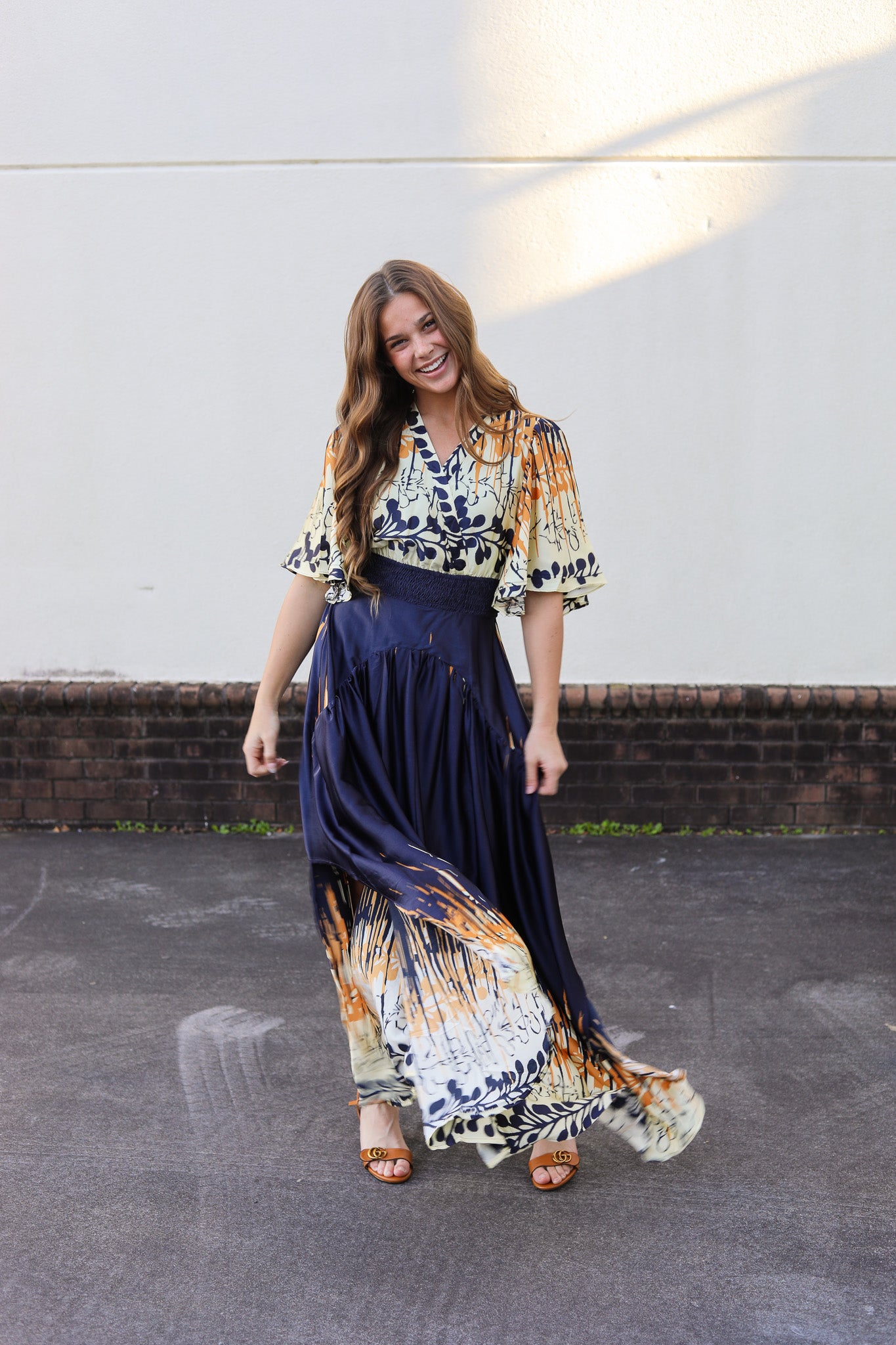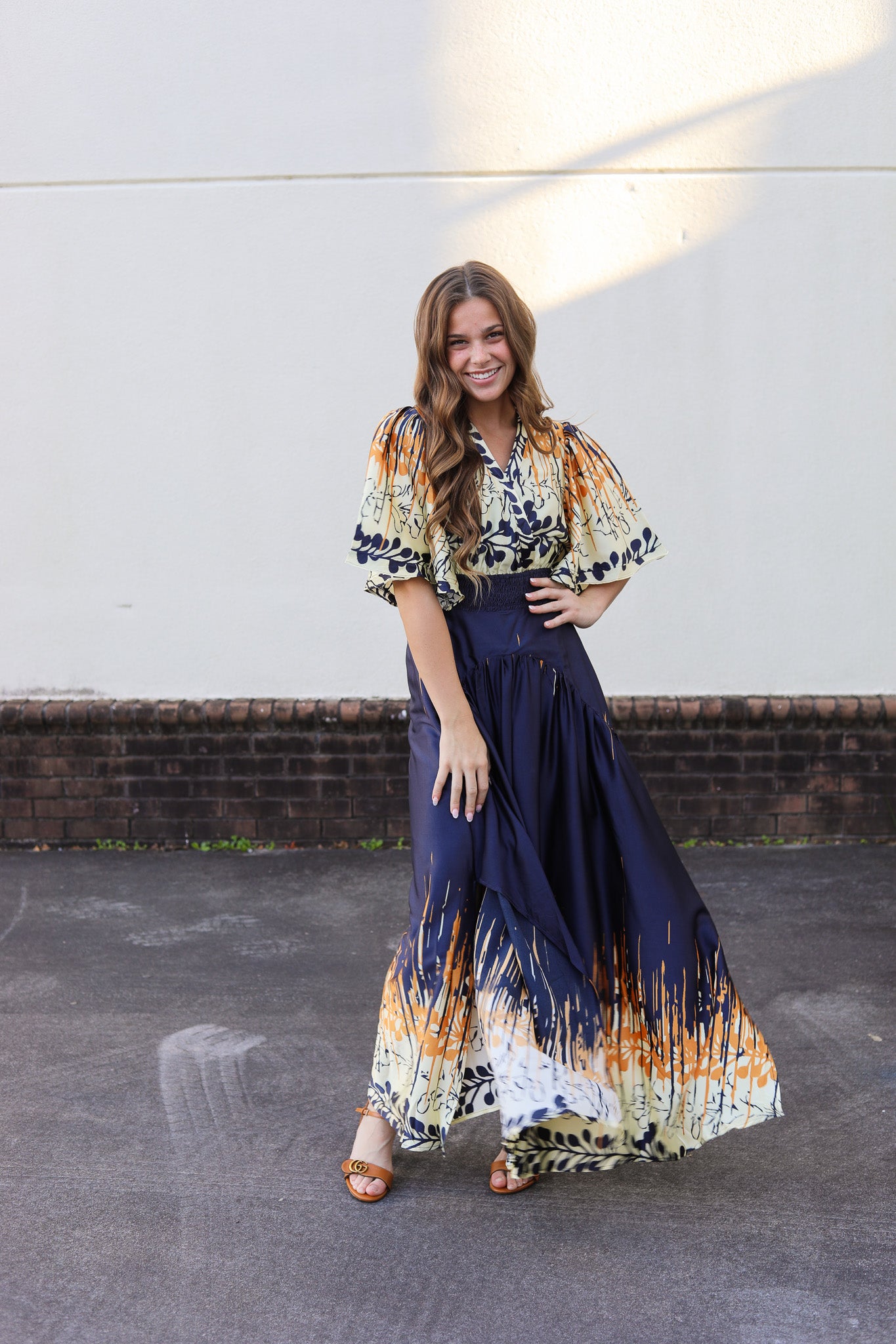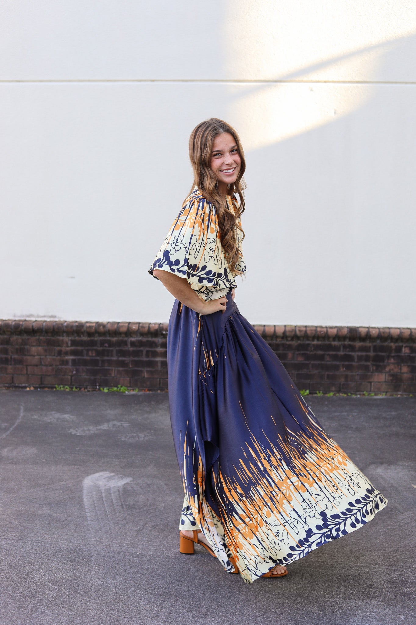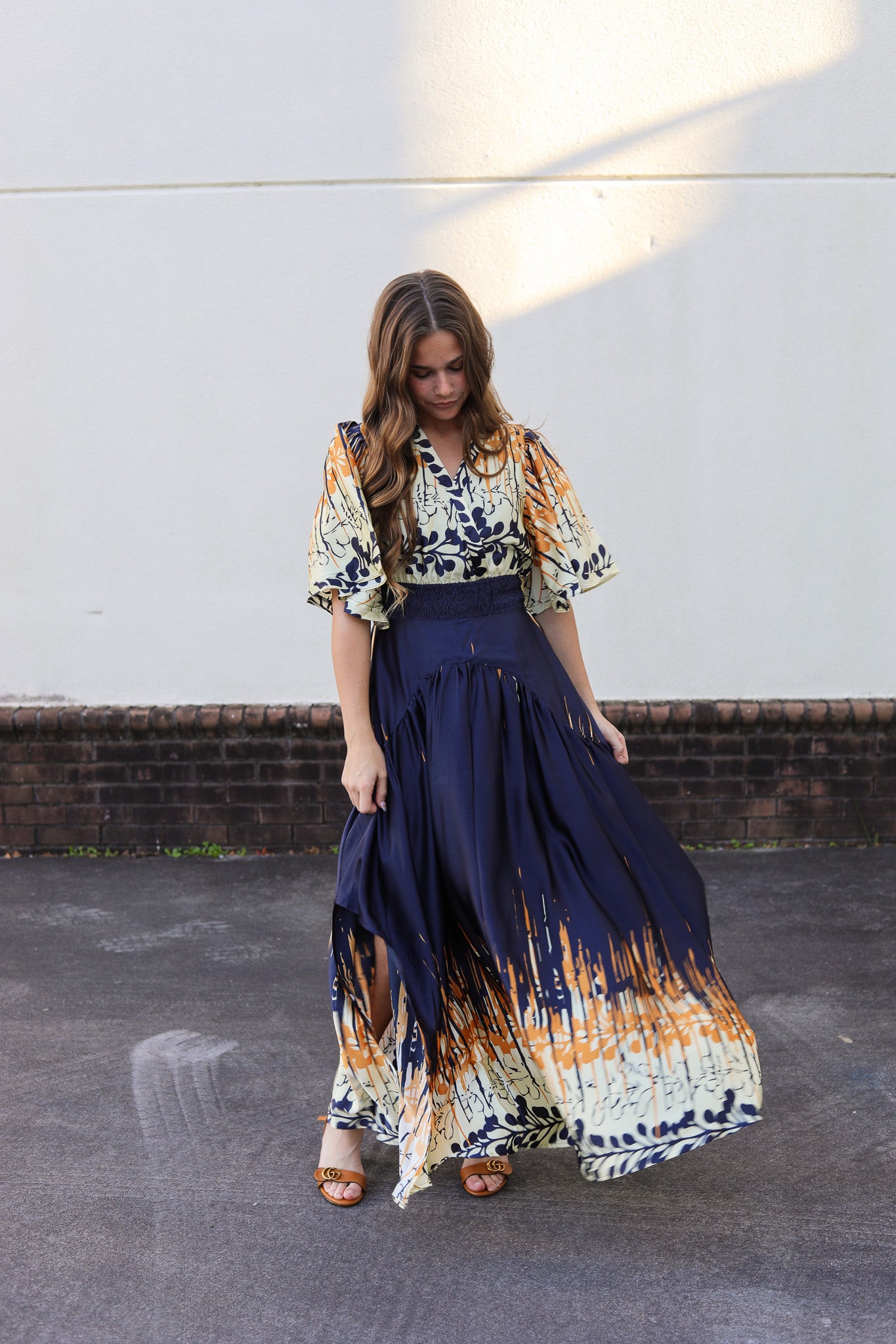 Make a statement in this stunning border print maxi dress featuring a deep V-neckline, elegant elbow-length sleeves, and a flattering high waistband. The flowing skirt moves beautifully with every step, perfect for dressy dinners or special occasions.