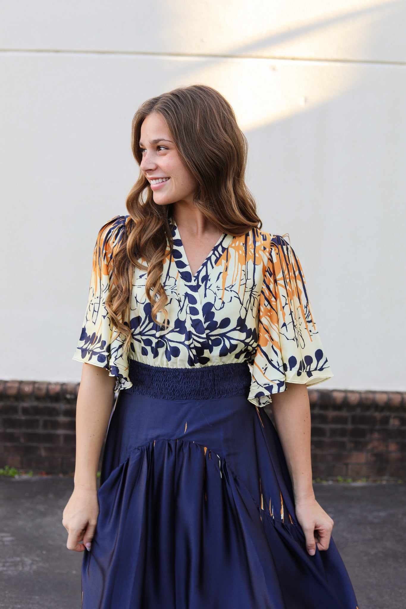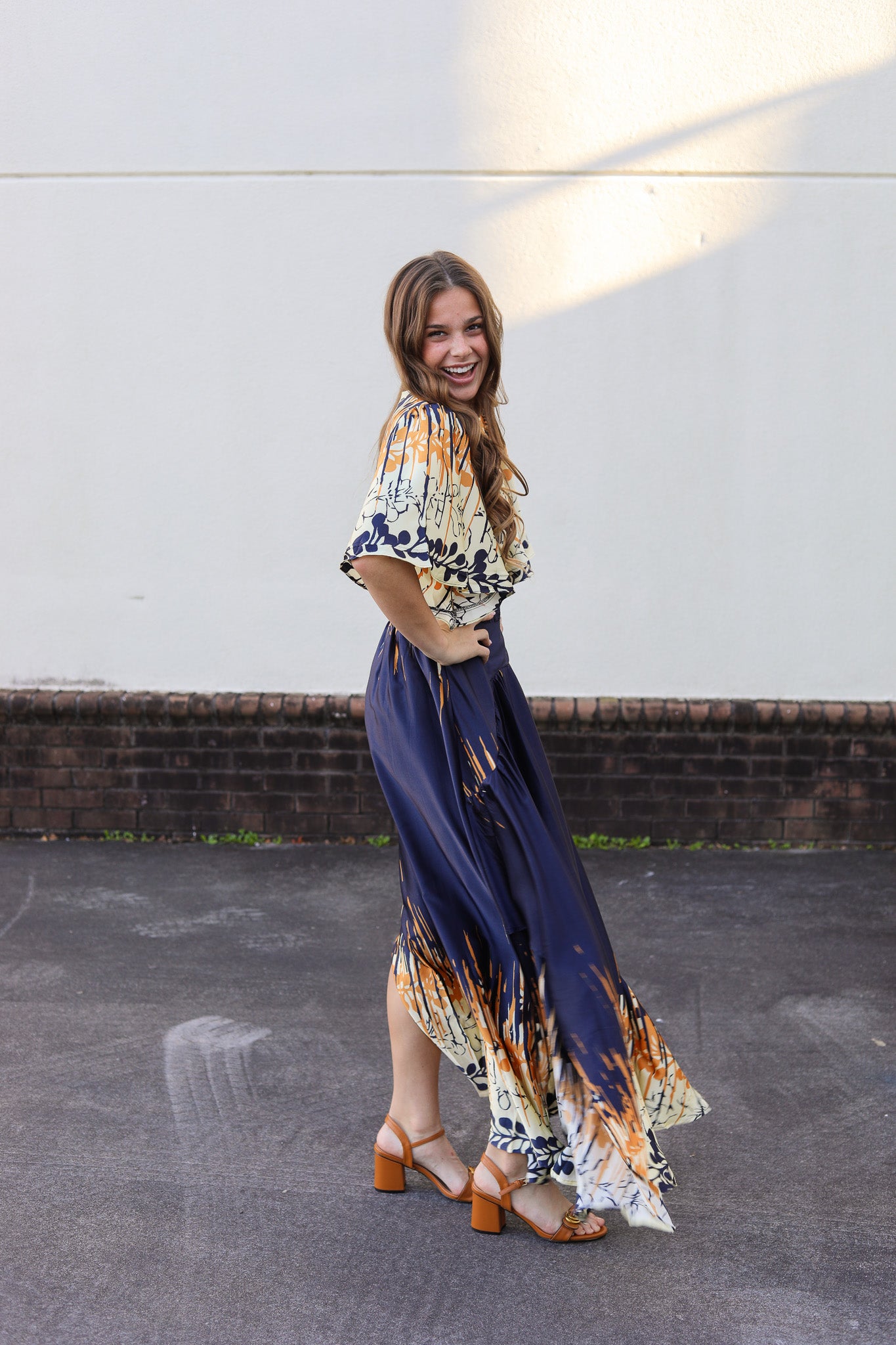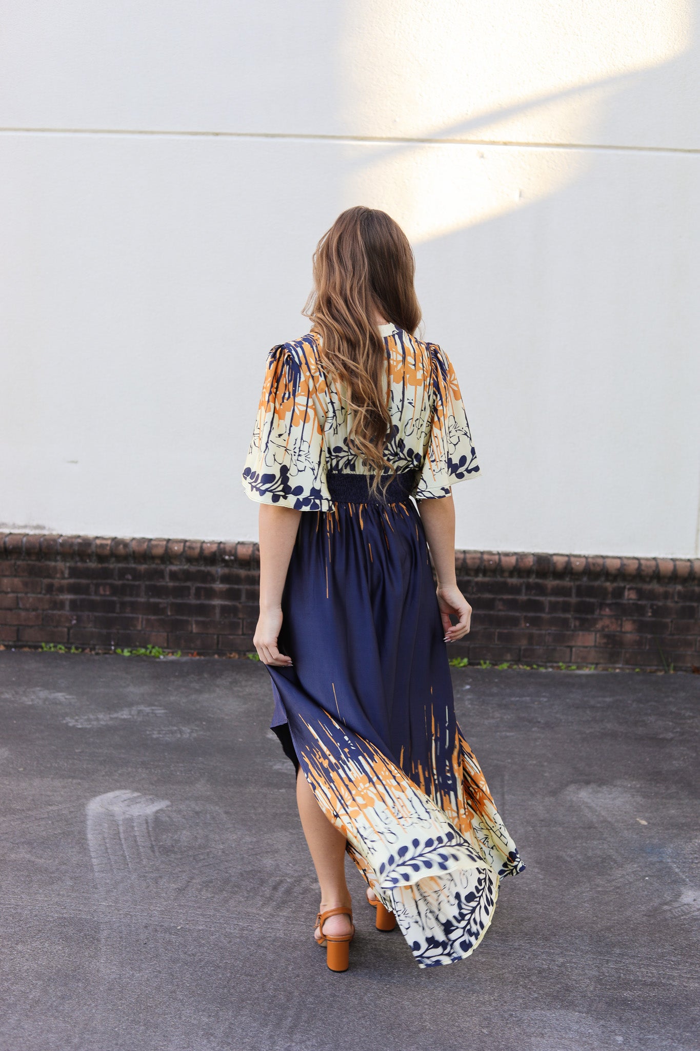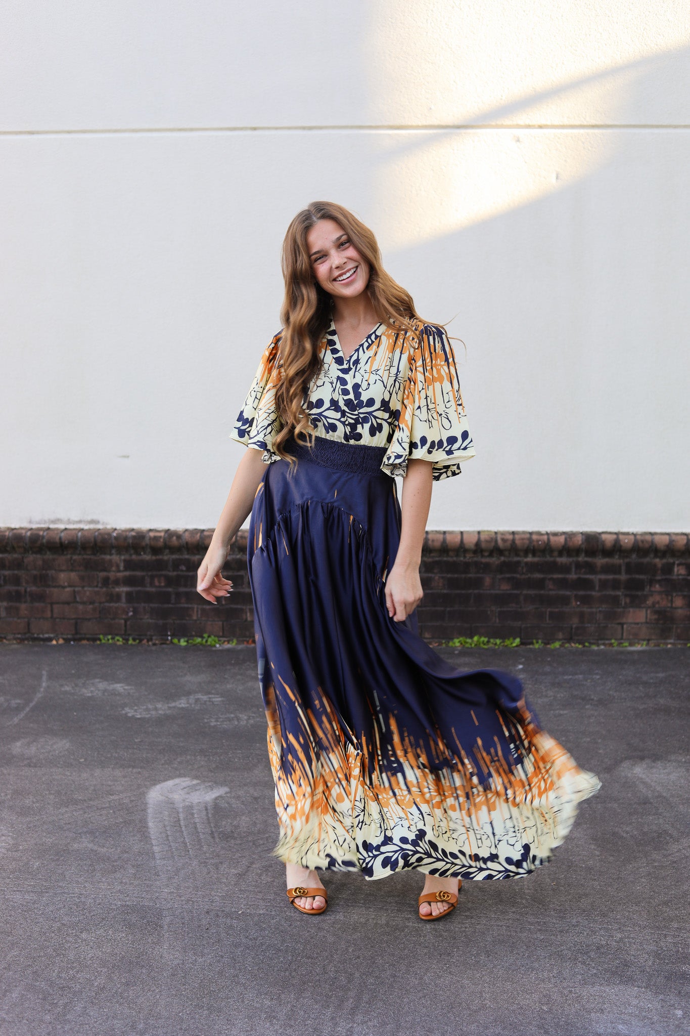 Make a statement in this stunning border print maxi dress featuring a deep V-neckline, elegant elbow-length sleeves, and a flattering high waistband. The flowing skirt moves beautifully with every step, perfect for dressy dinners or special occasions.
