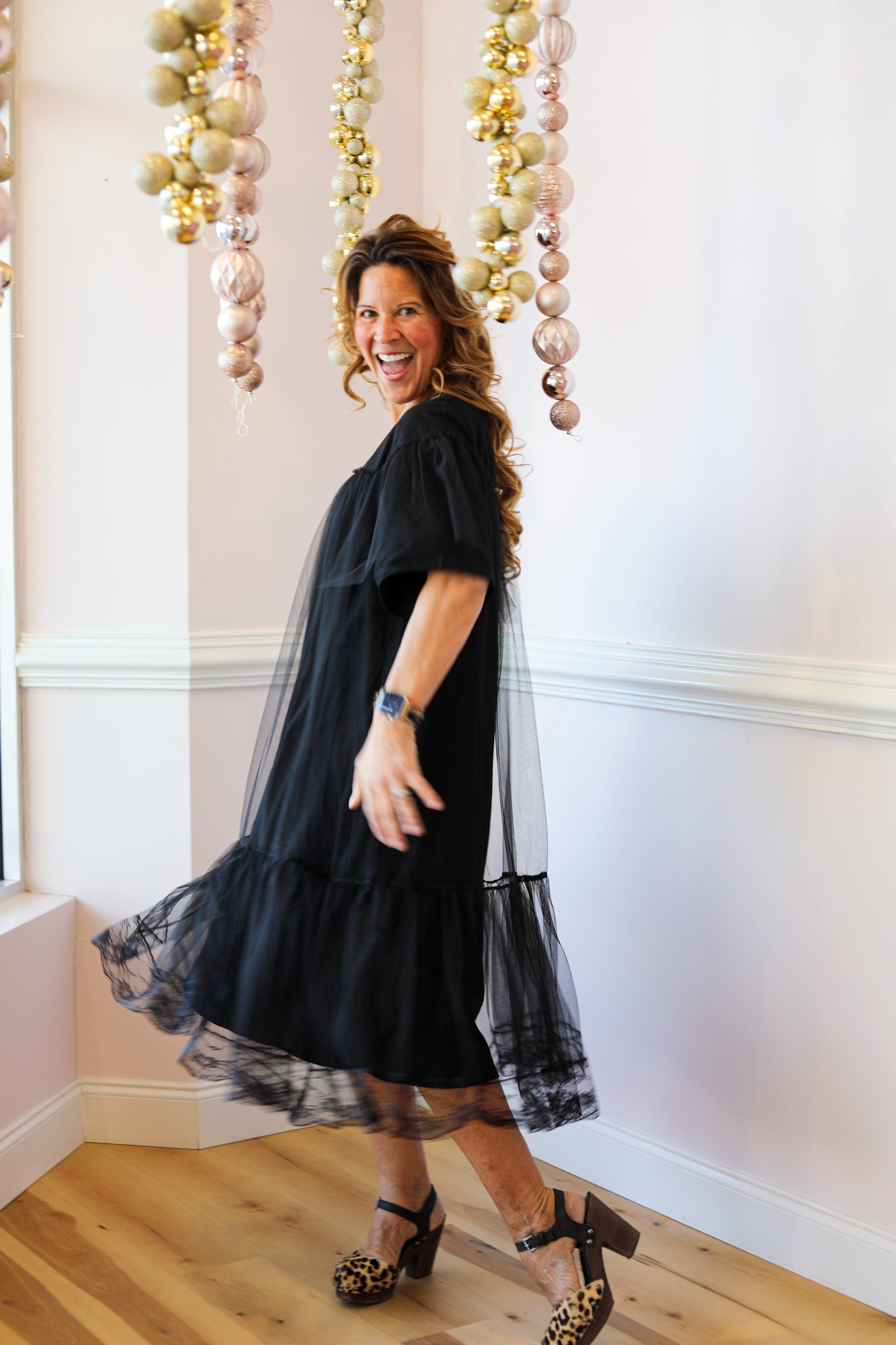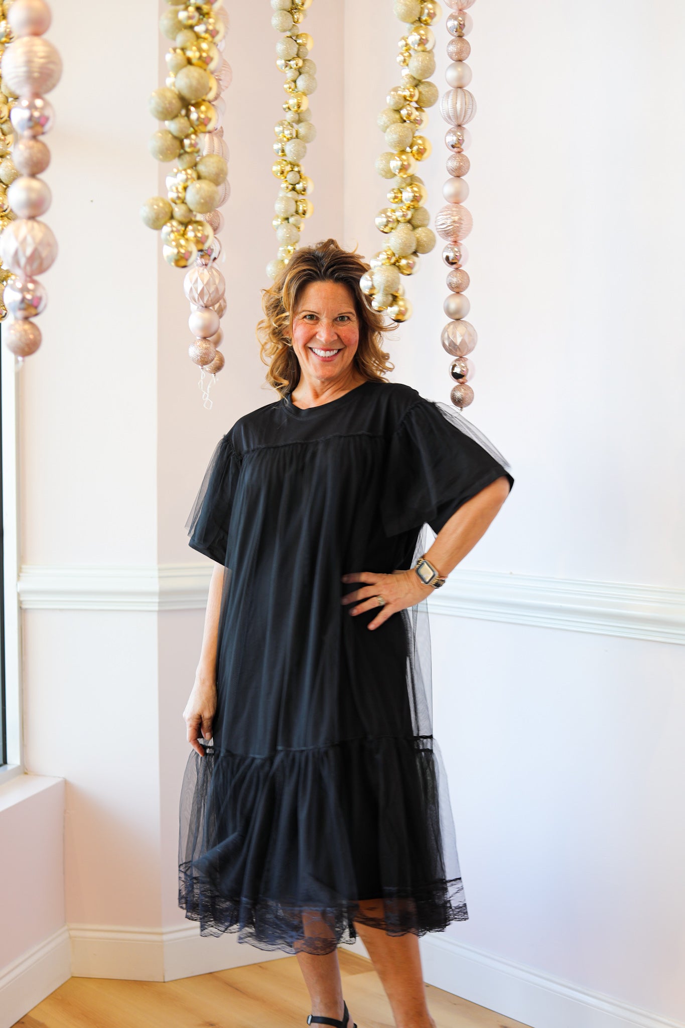 A relaxed T-shirt dress layered with a soft tulle overlay for an elevated yet effortless look. Designed with an easy fit and lightweight feel, this piece blends everyday comfort with subtle texture and movement.