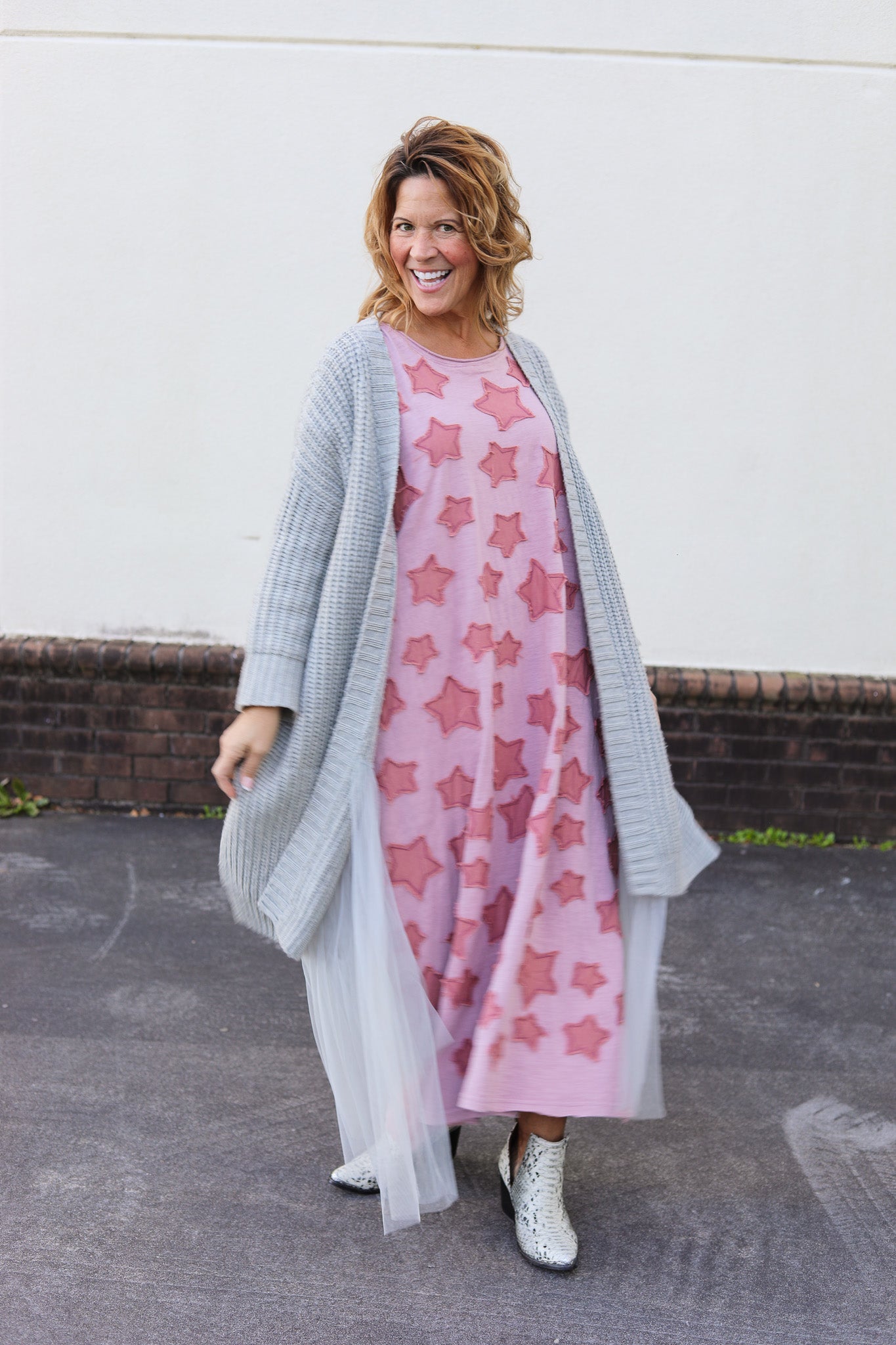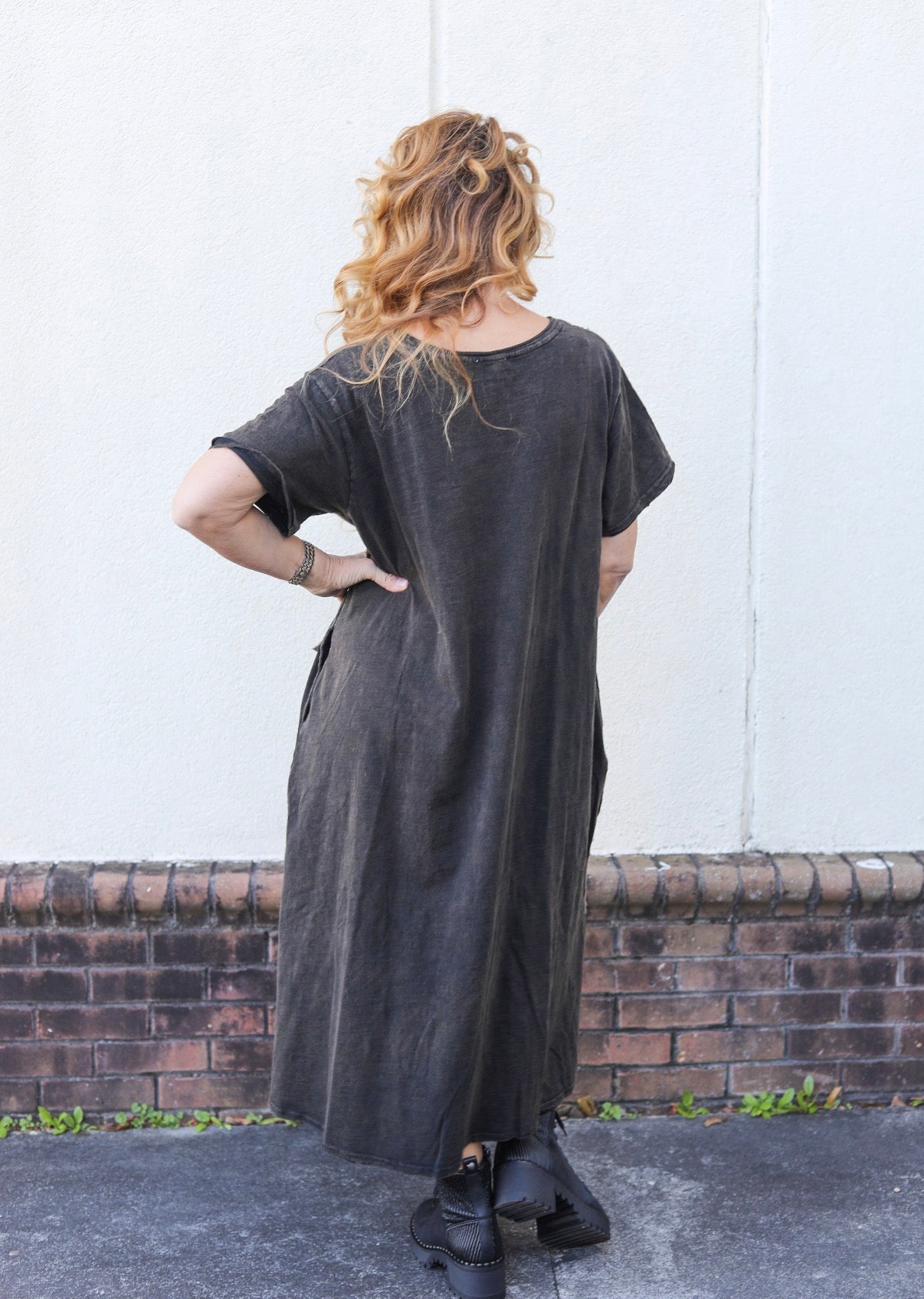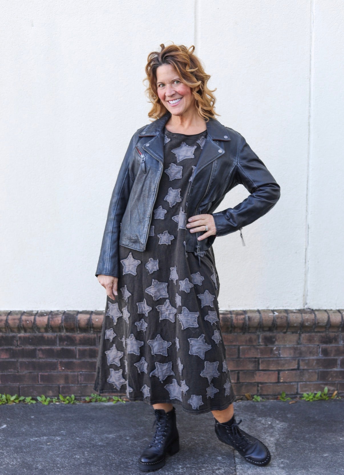 Effortlessly cool and oh-so-comfy, this mineral-washed T-shirt dress features 3D star patch details across the front, side pockets, and a relaxed midi silhouette. Made from 100% cotton with a soft, lived-in feel — it’s the perfect throw-on-and-go piece for any season.