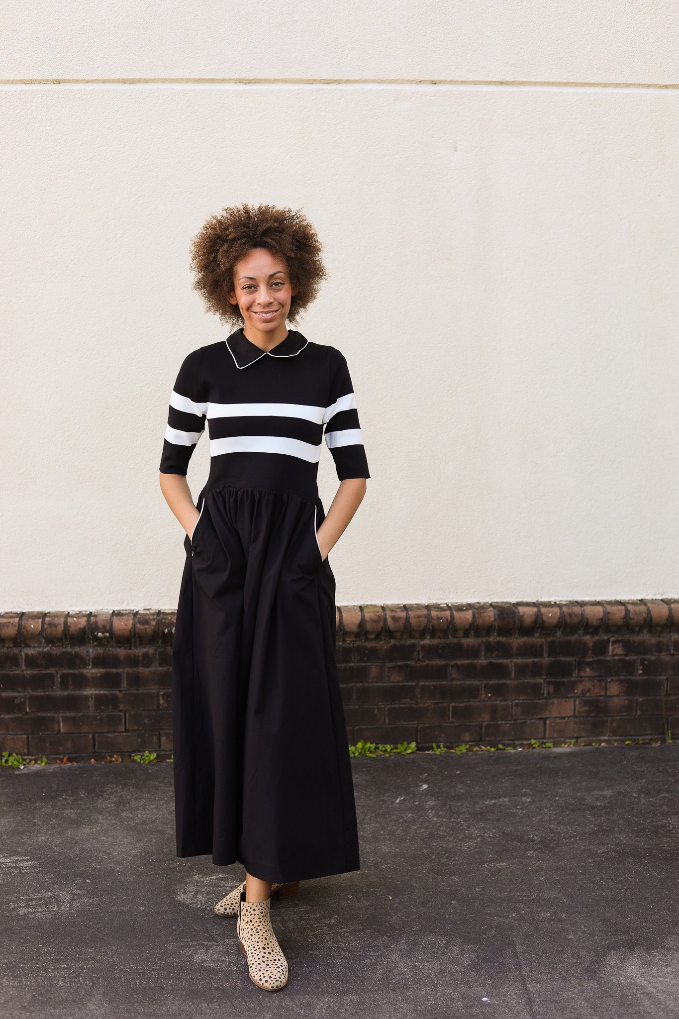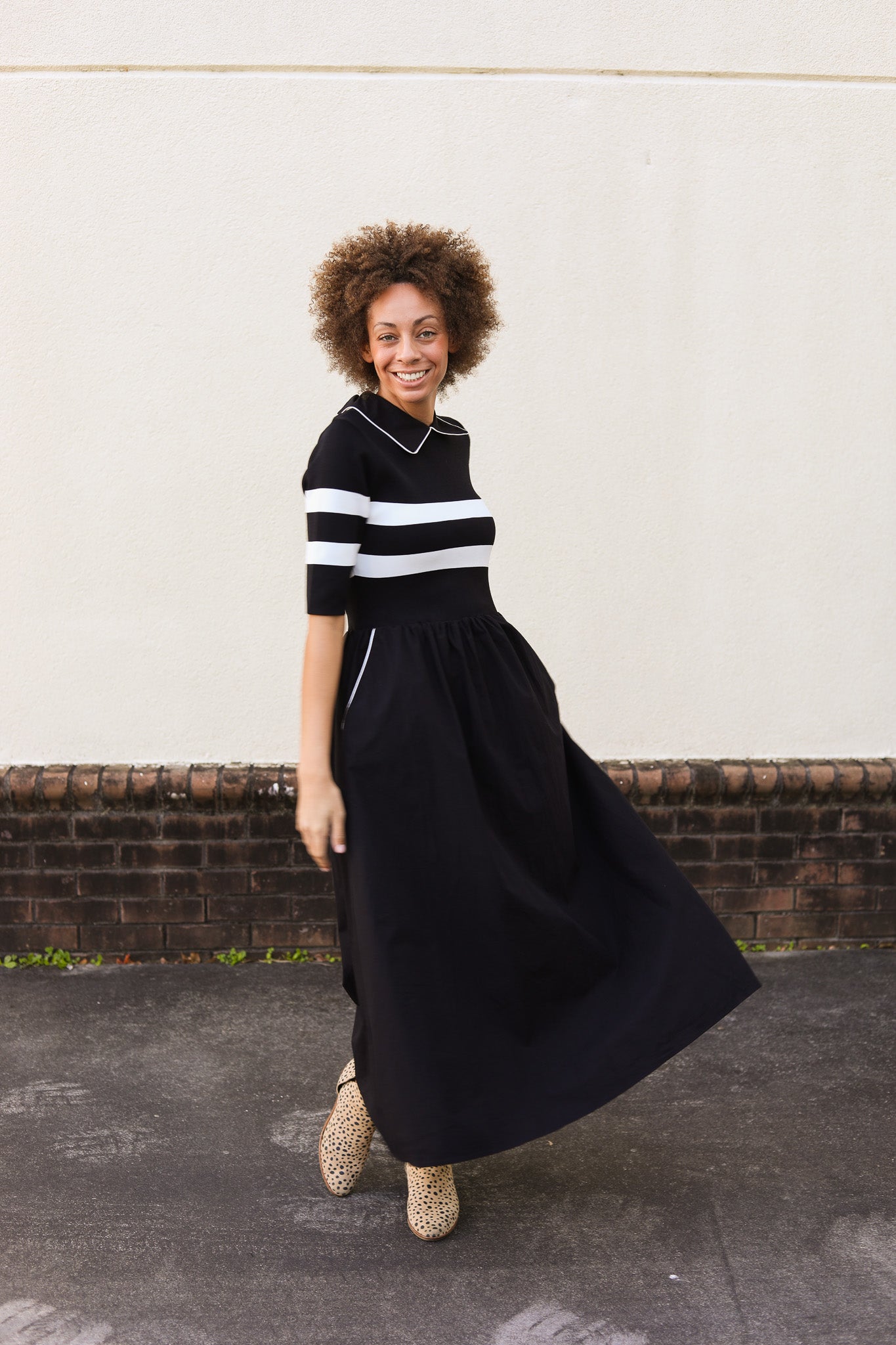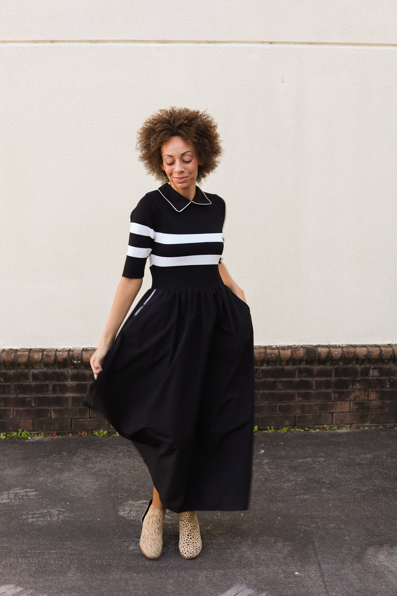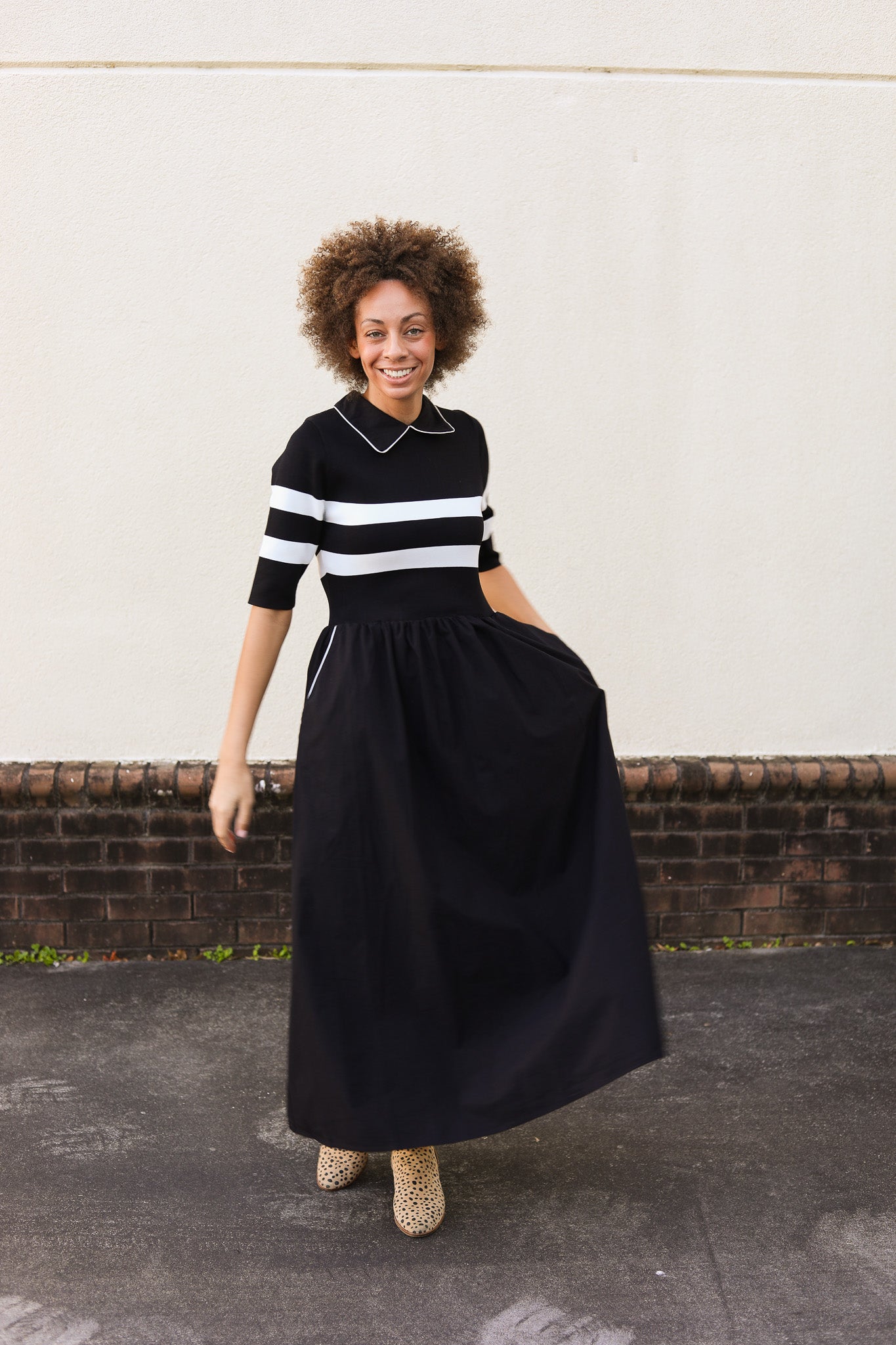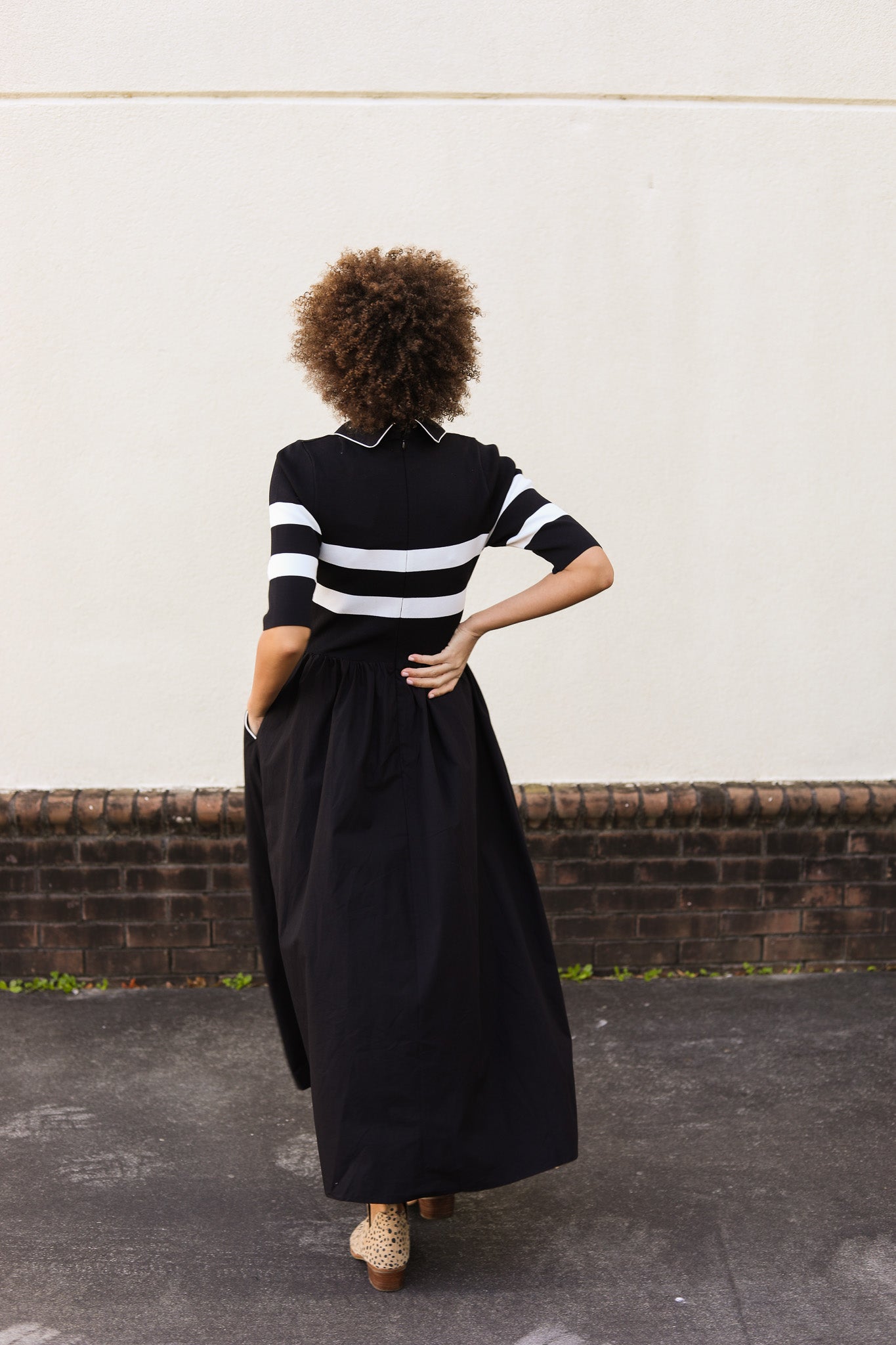 A timeless black and white midi dress featuring a knit top with bold horizontal stripes, a collared neckline, and half sleeves. The gathered waist creates a flattering silhouette above the solid black skirt, finished with side pockets and back zipper closure.