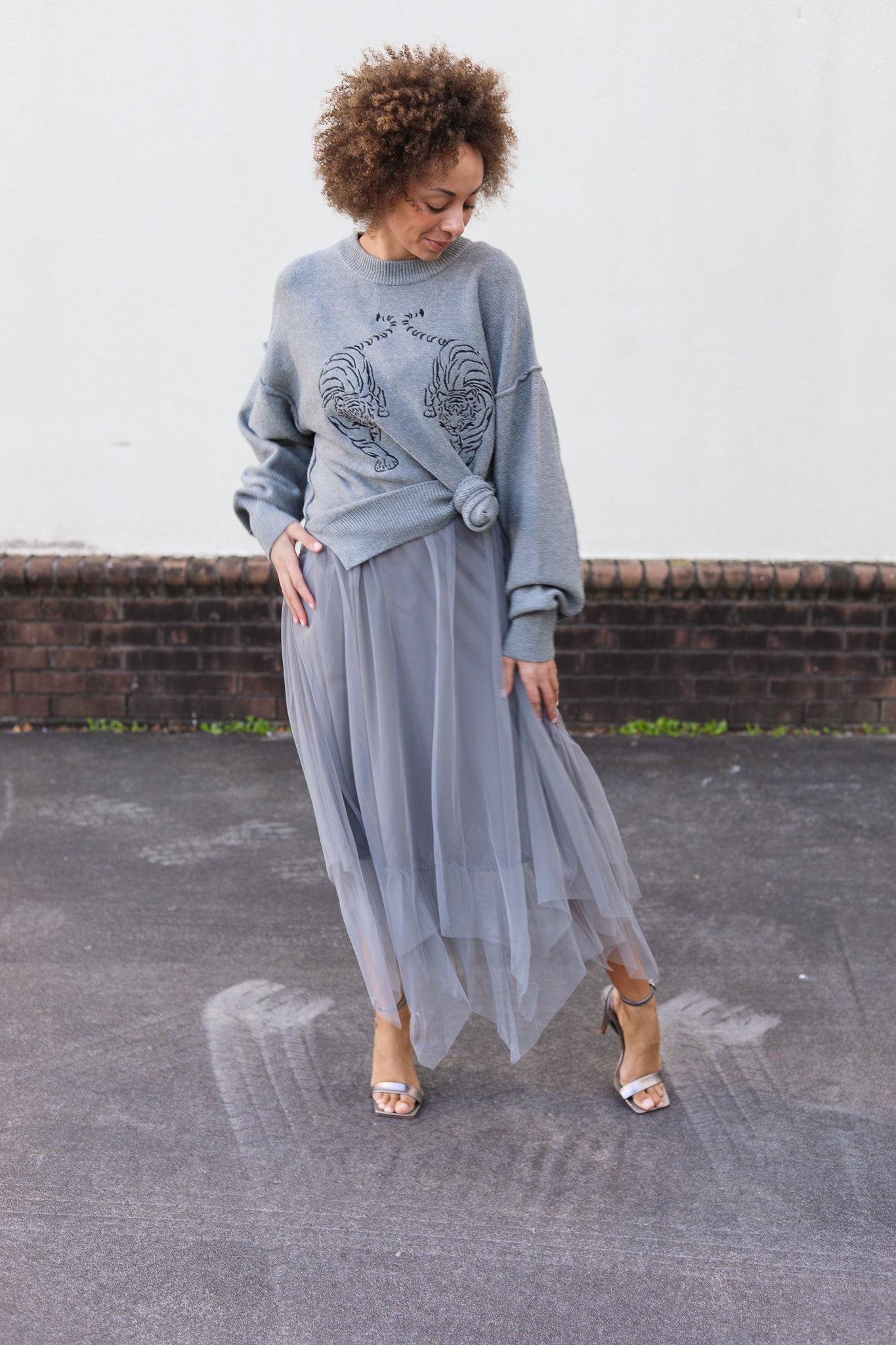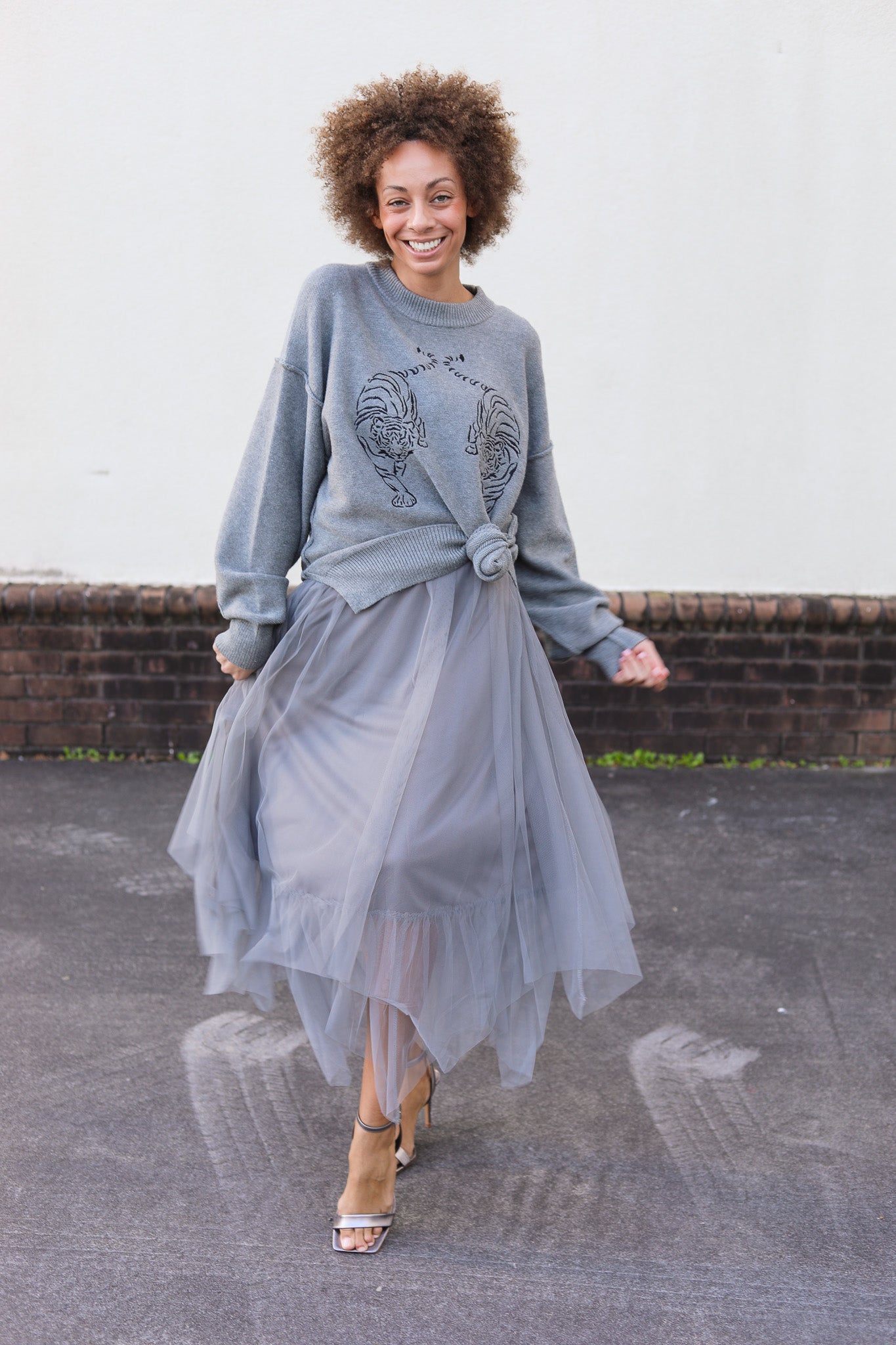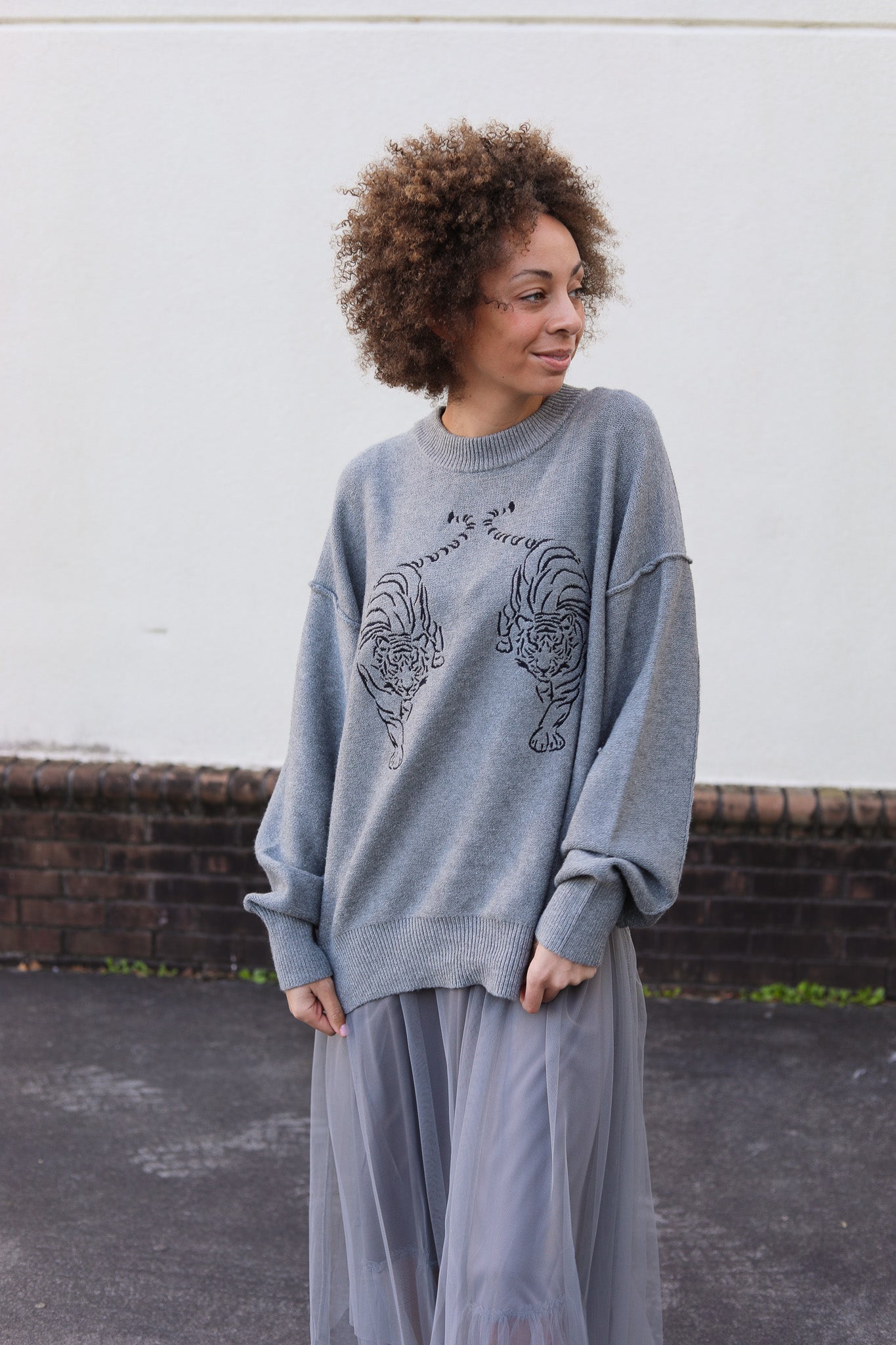Soft, cozy, and effortlessly cool — this relaxed knit sweater features embroidered tiger details across the front for an elevated casual look. Designed with a crew neckline, drop shoulders, and side-split hem for easy layering.