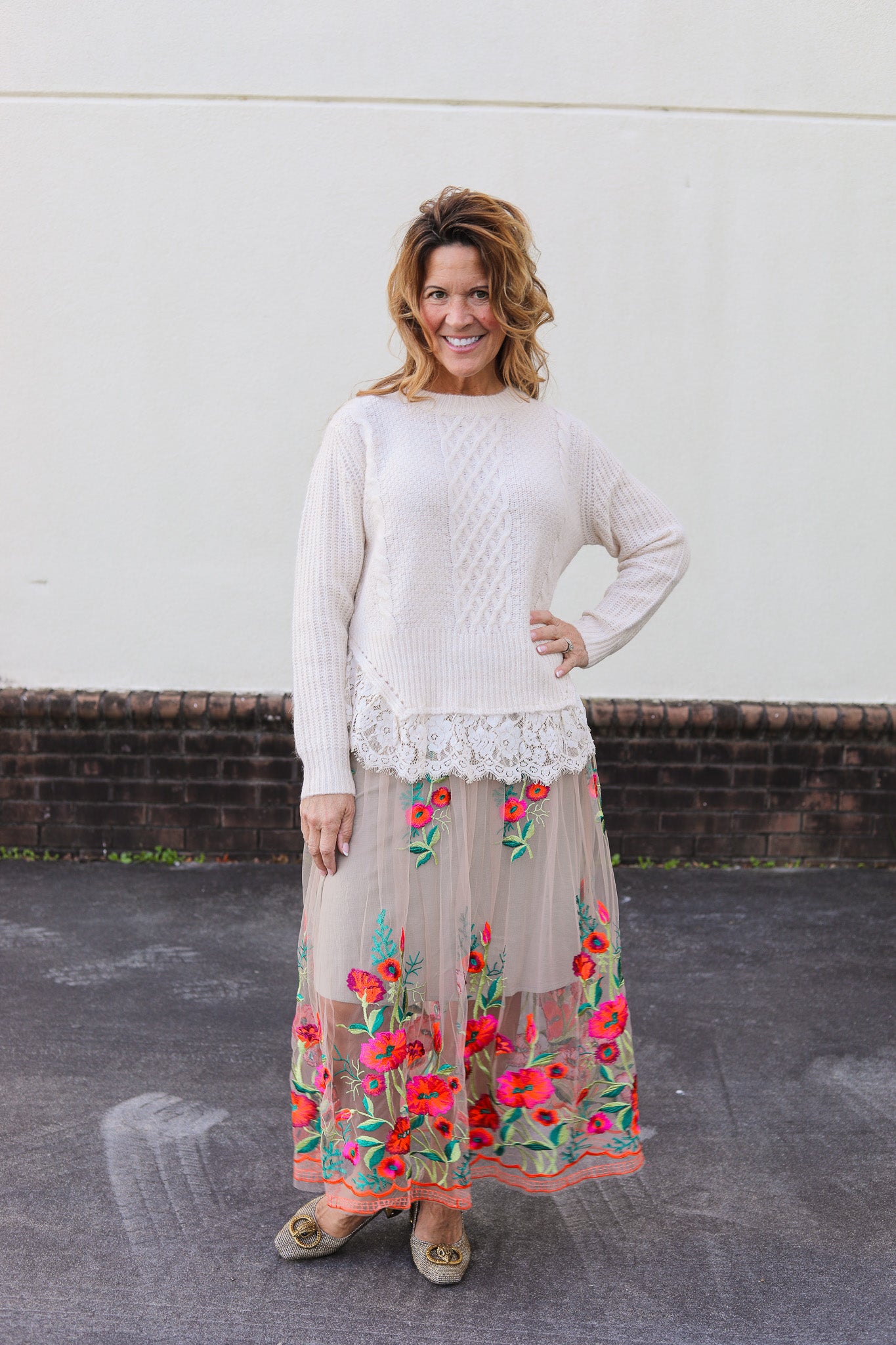 • Floral embroidered mesh elastic waist lined A-line skirt