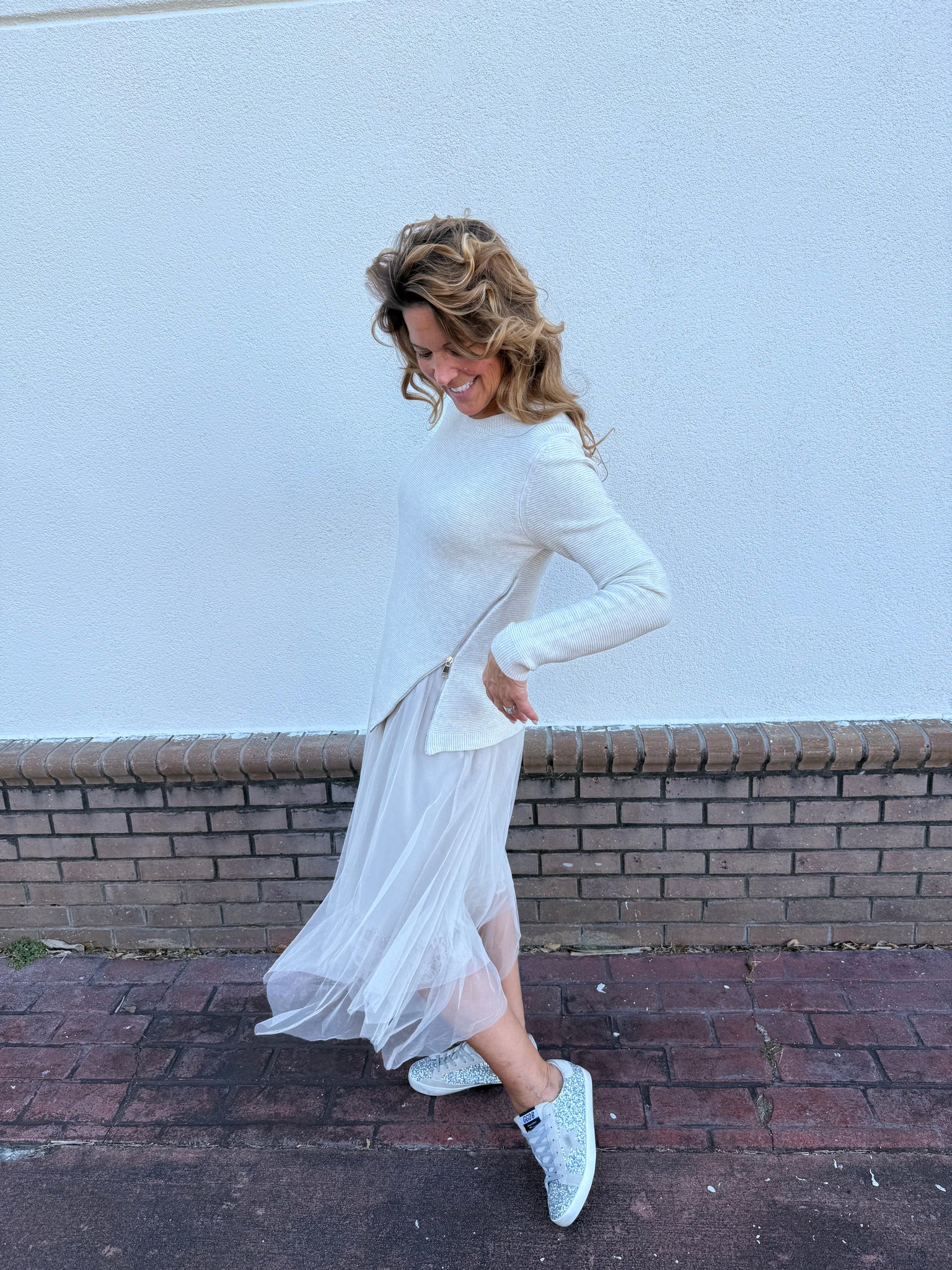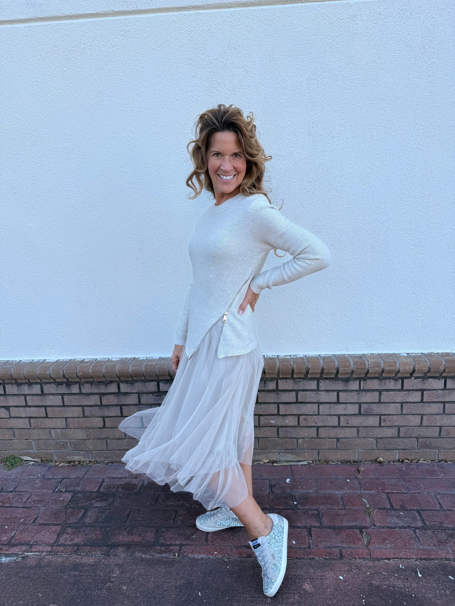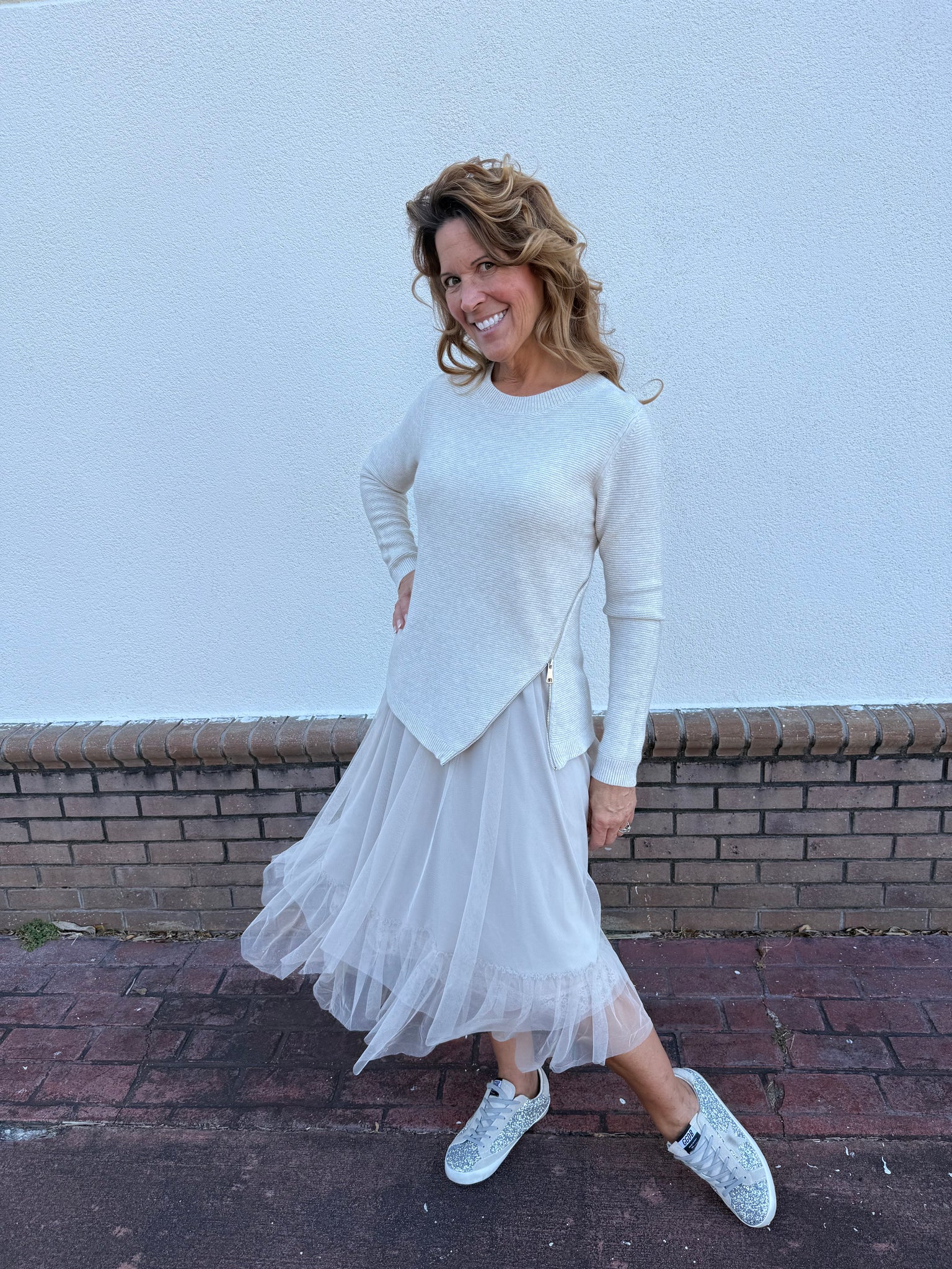 Soft, elegant, and effortlessly chic — this two-piece set features a cozy round neck sweater with side zip details paired over a flowy tulle midi dress.